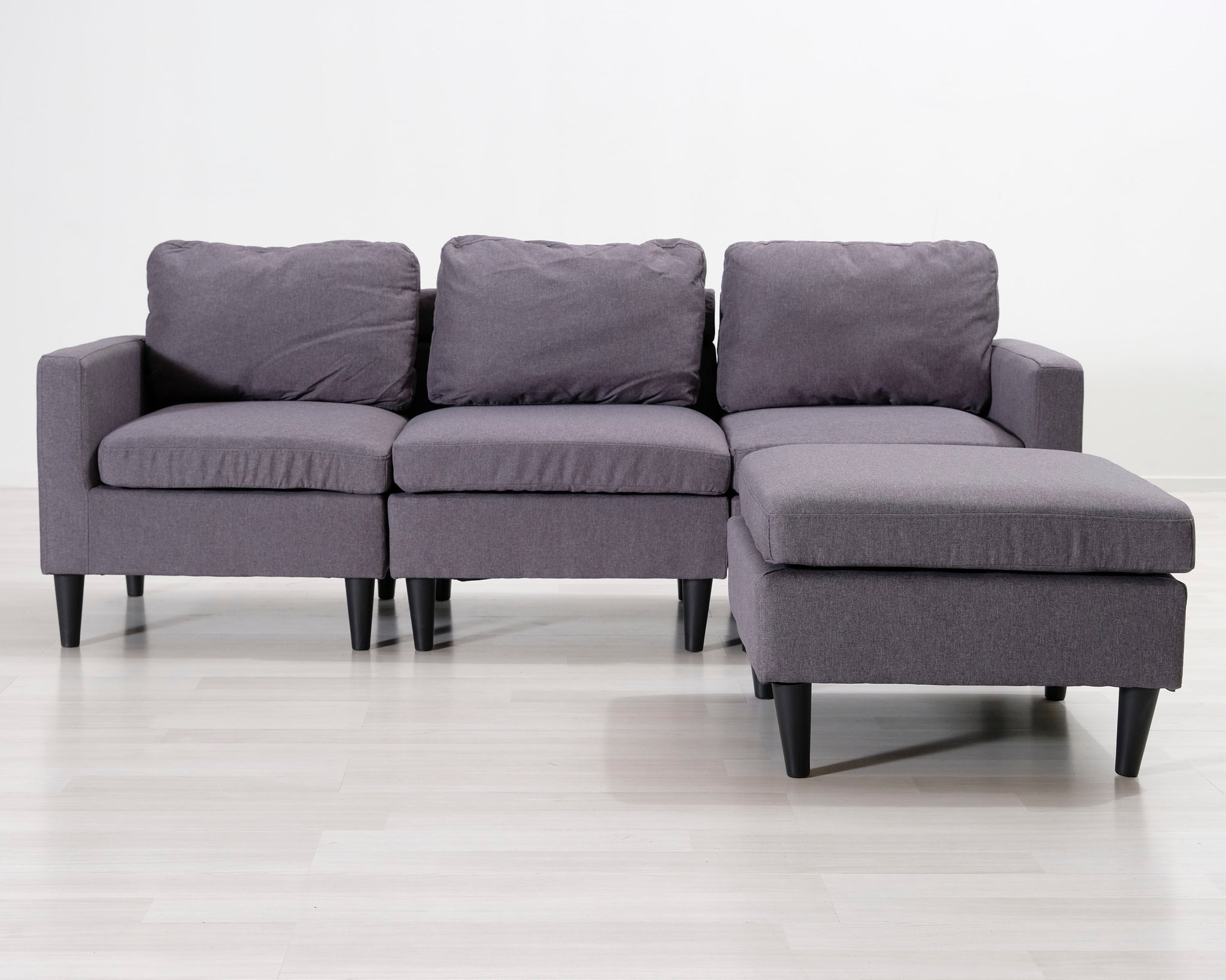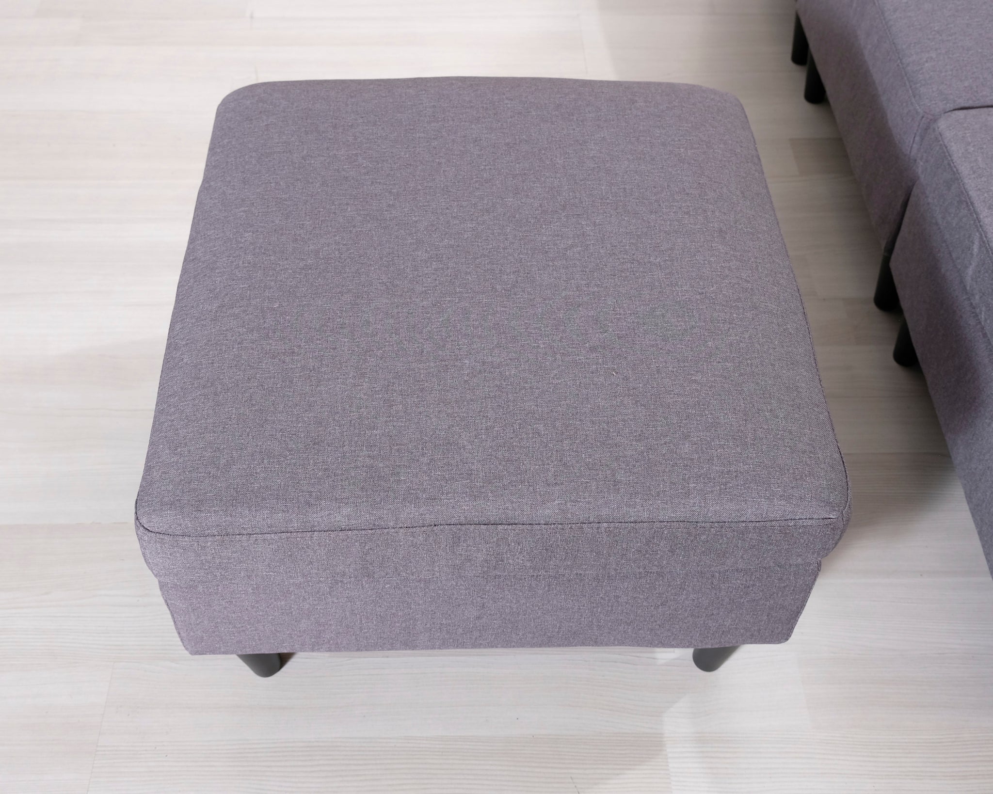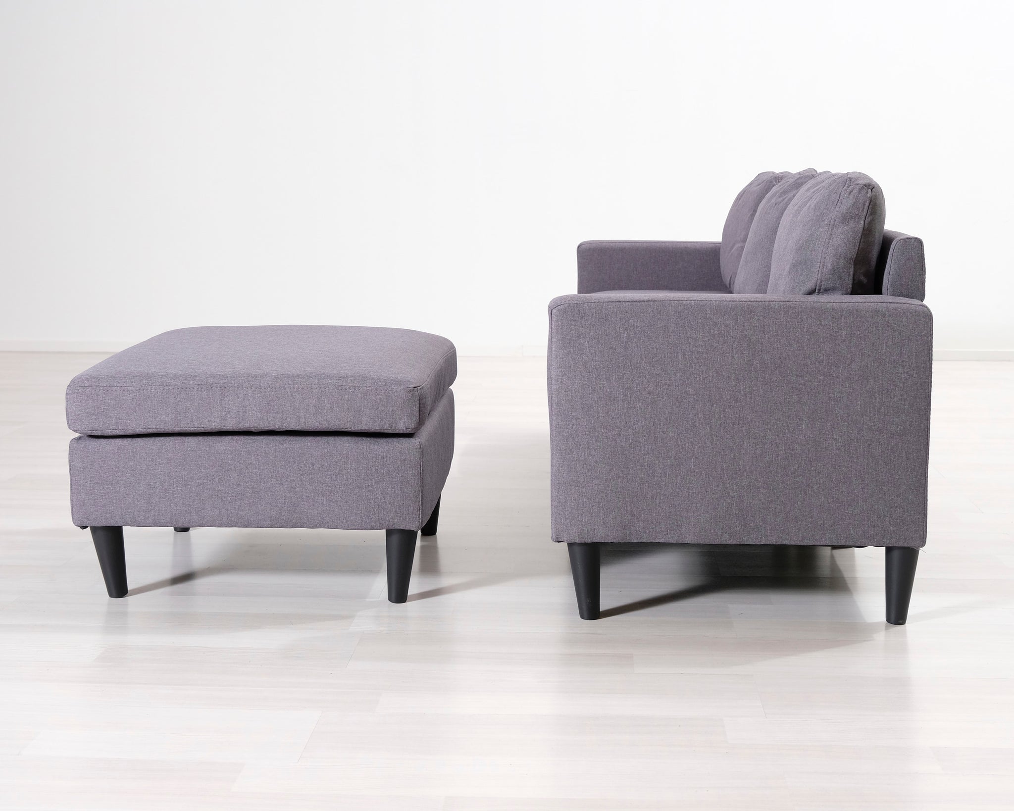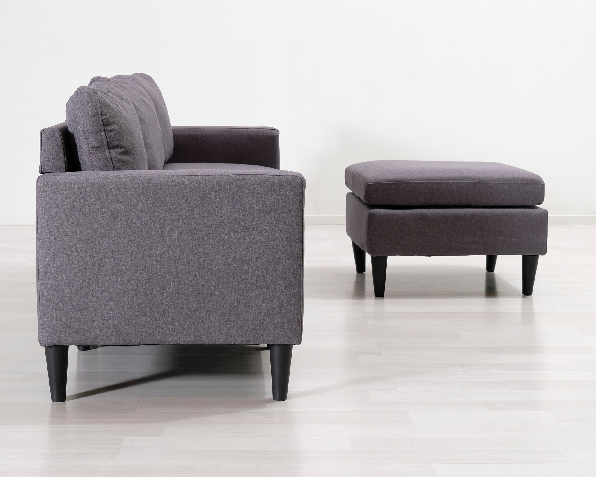 Harmaa kangassohva ja rahi mustilla jaloilla.