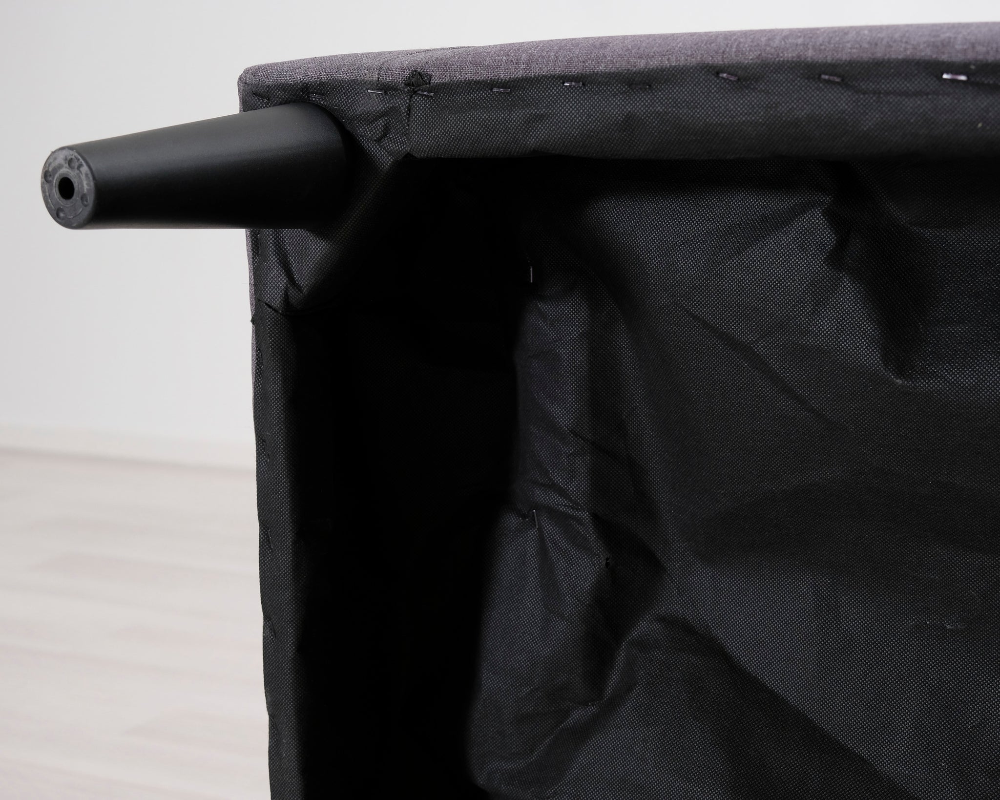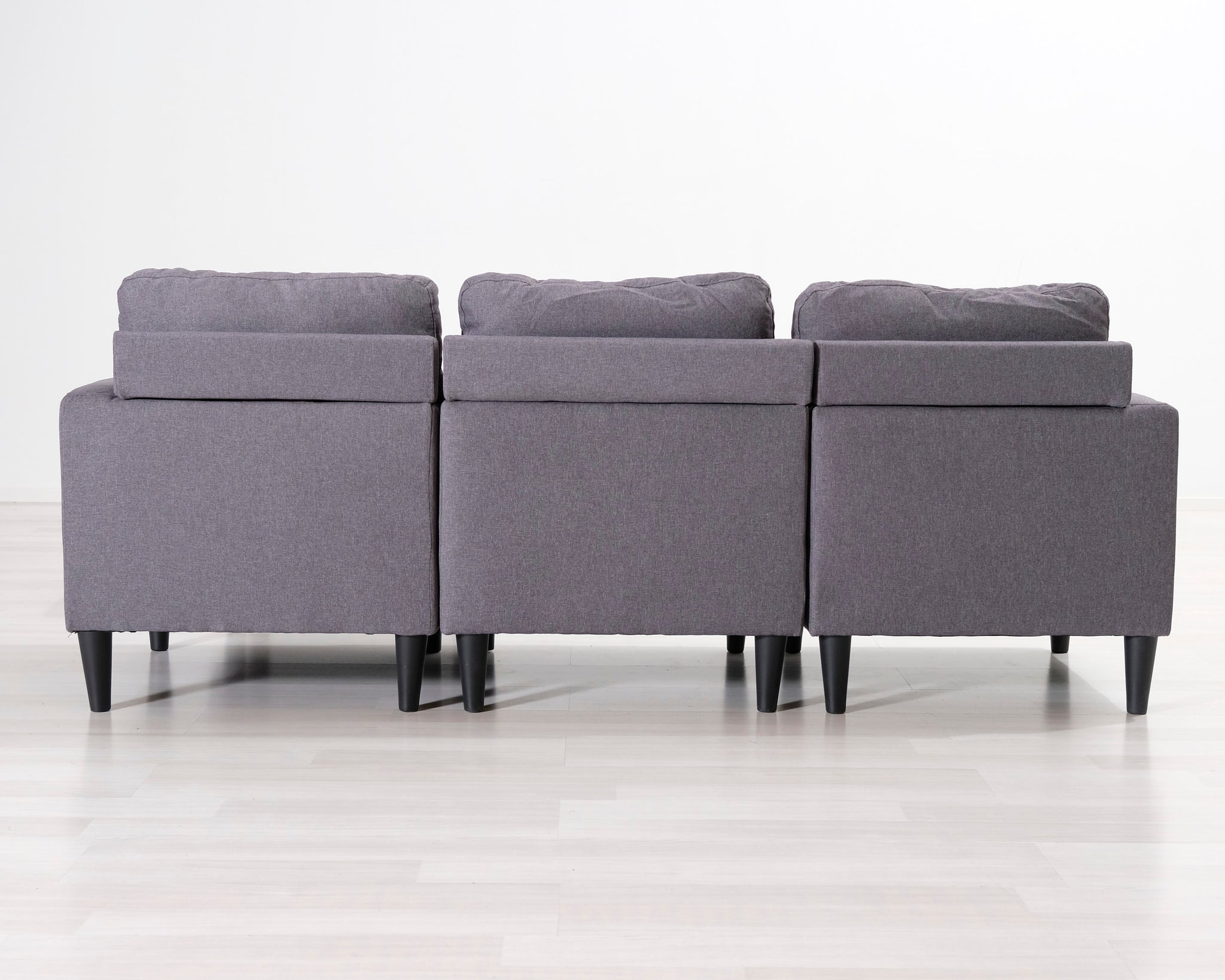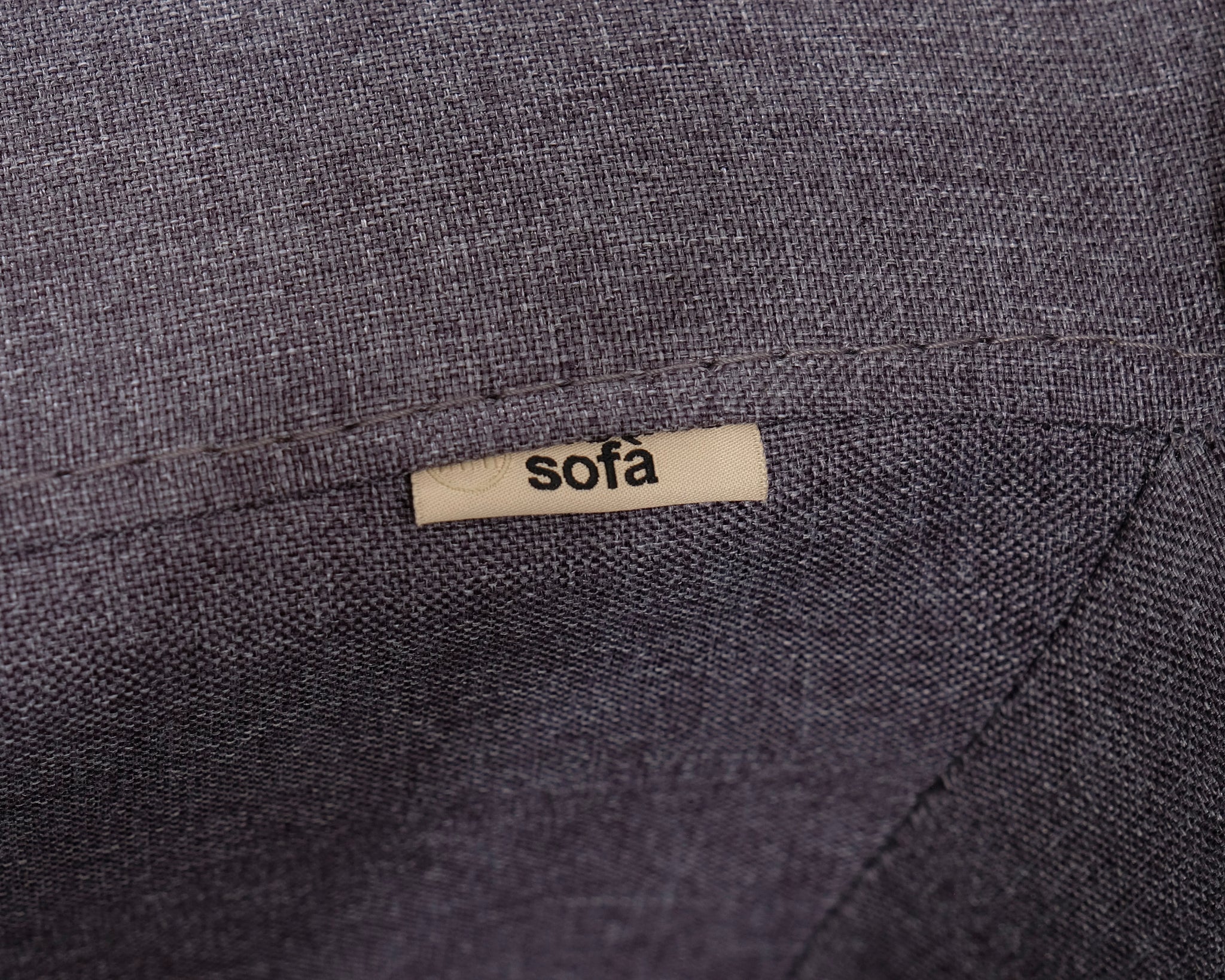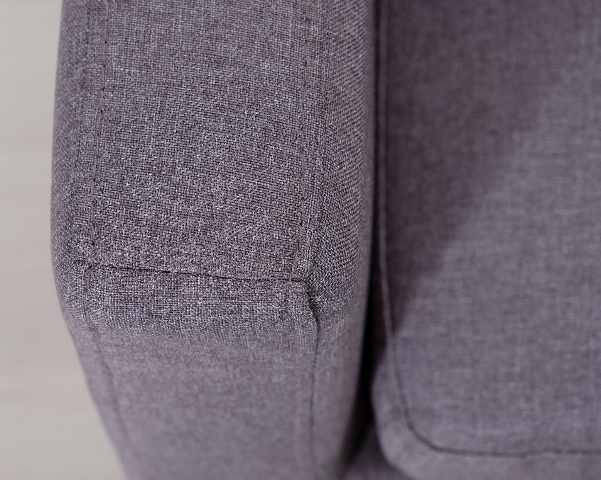 Harmaa kangassohva ja rahi mustilla jaloilla.