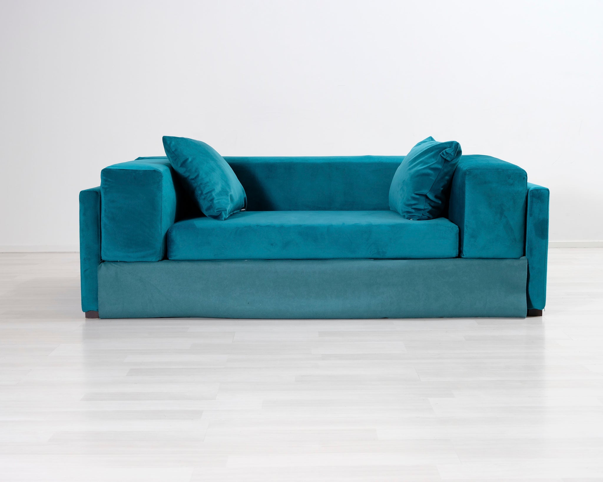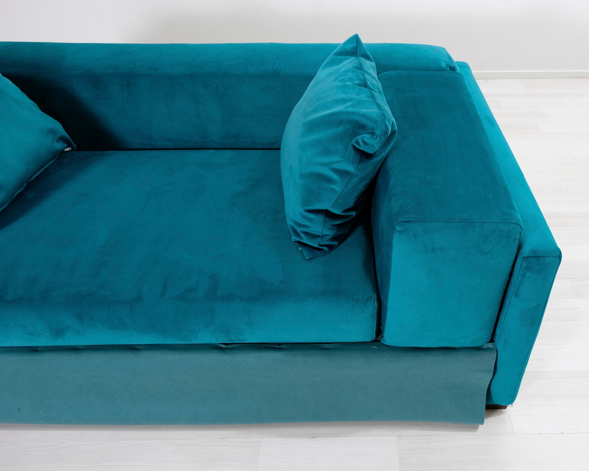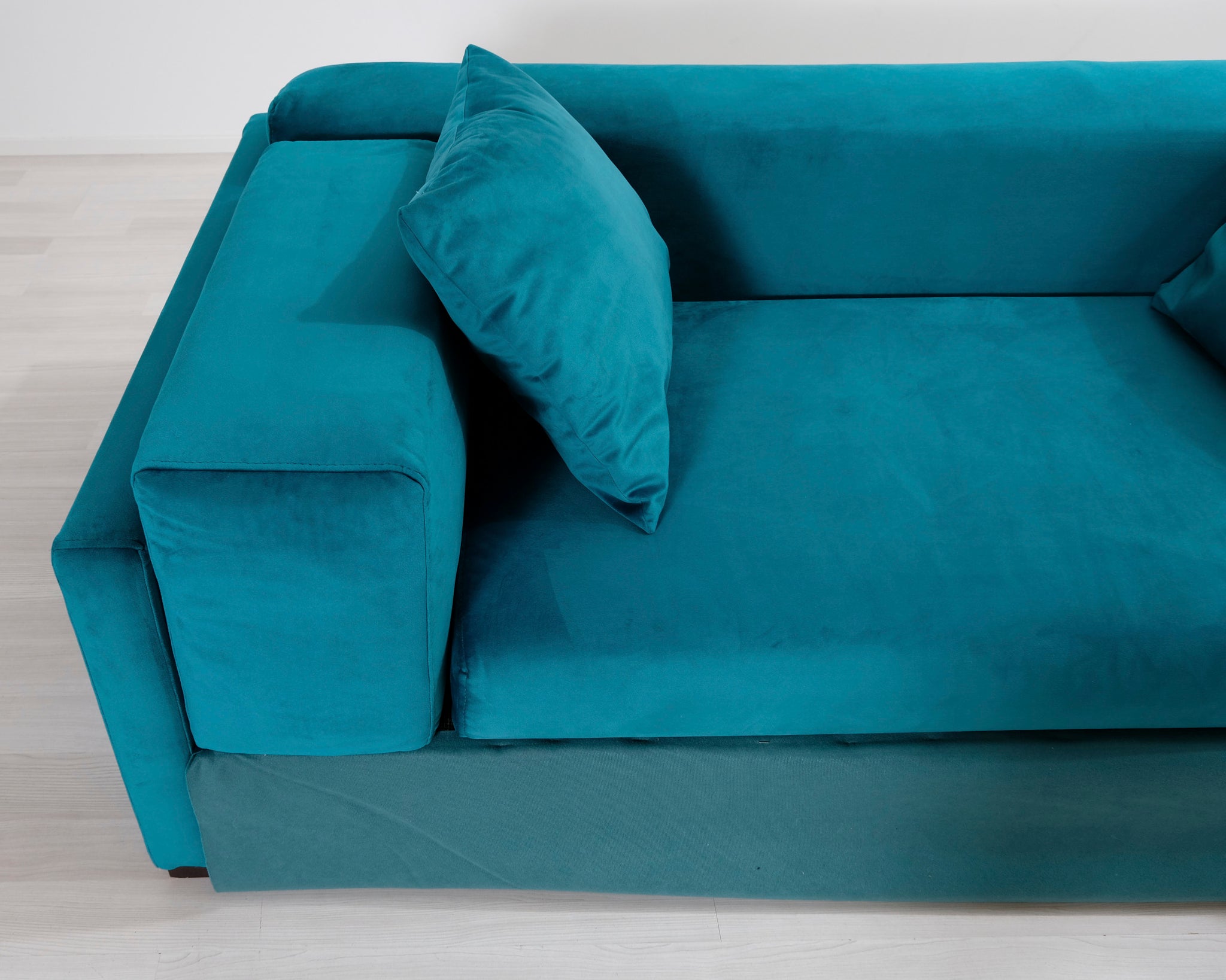 Kahden istuttava turkoosi samettisohva. Moderni, hieman kulmikas muoto.