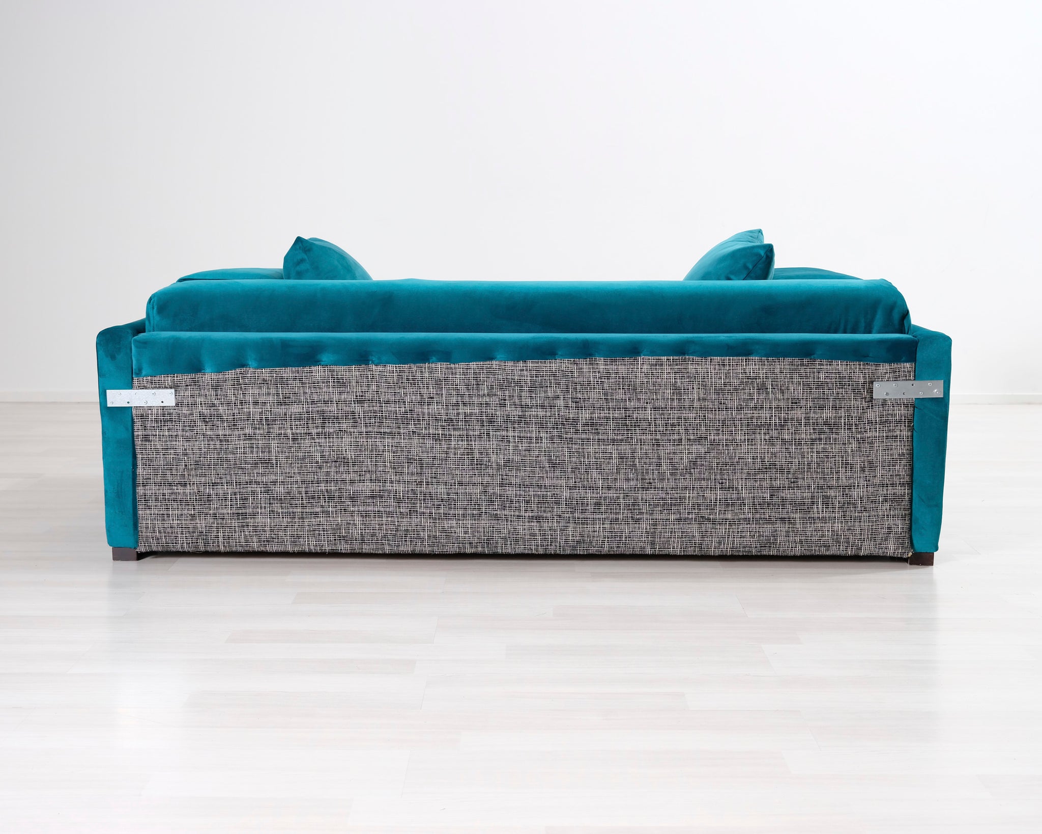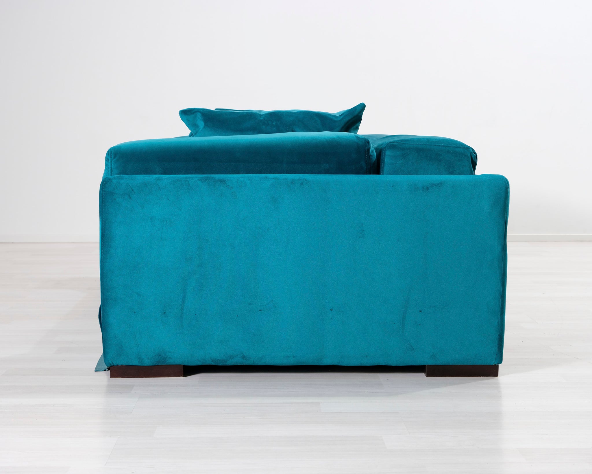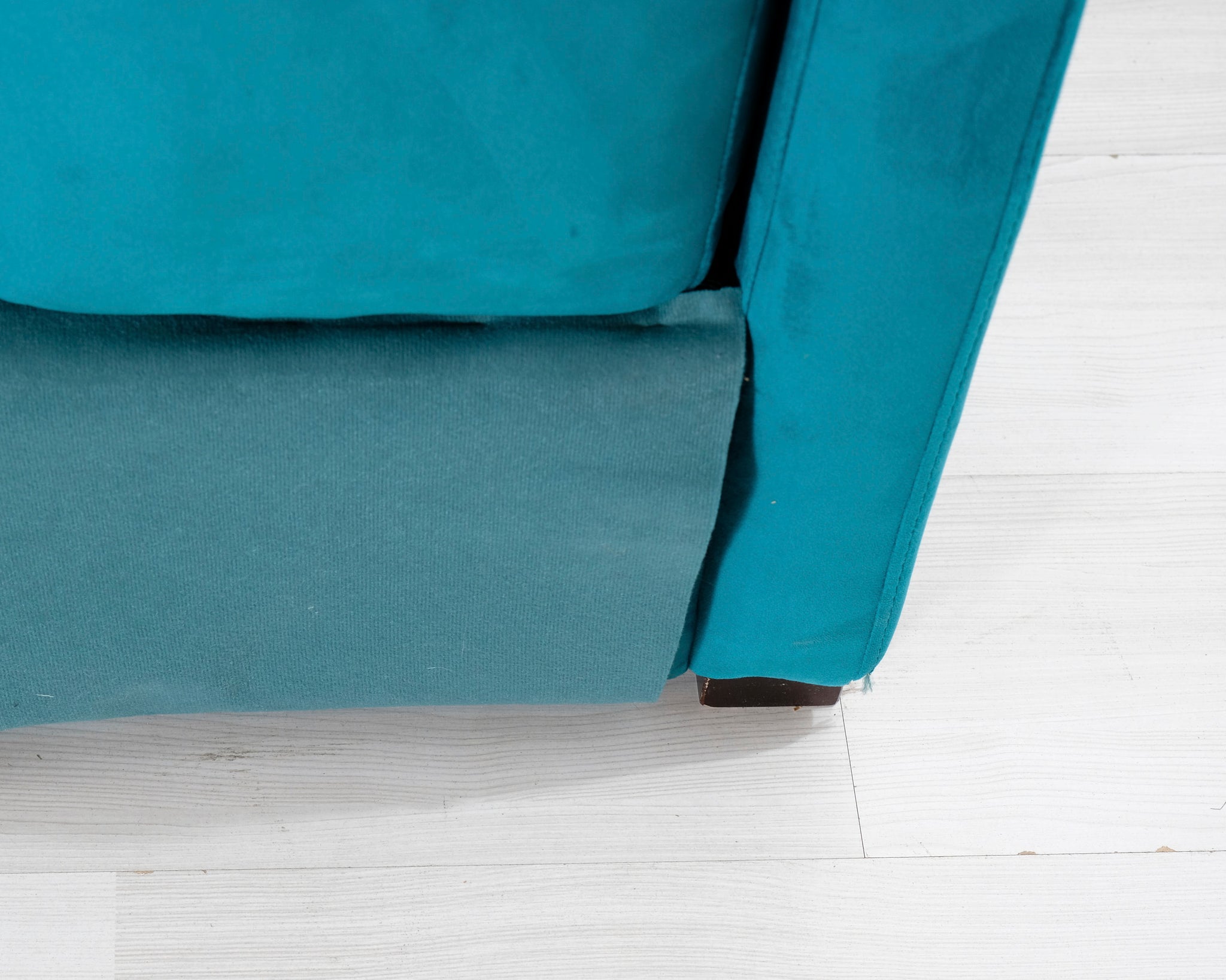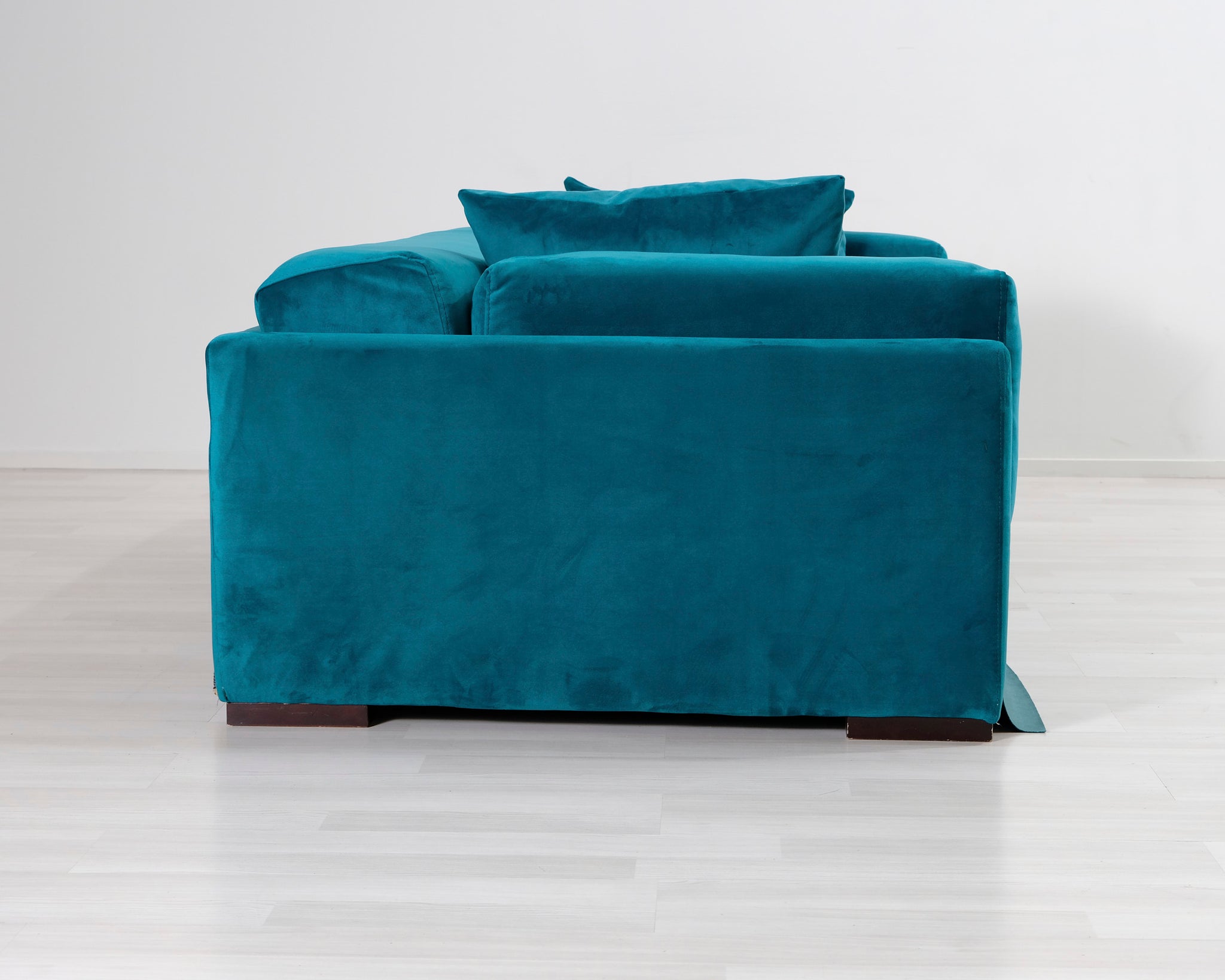 Kahden istuttava turkoosi samettisohva. Moderni, hieman kulmikas muoto.