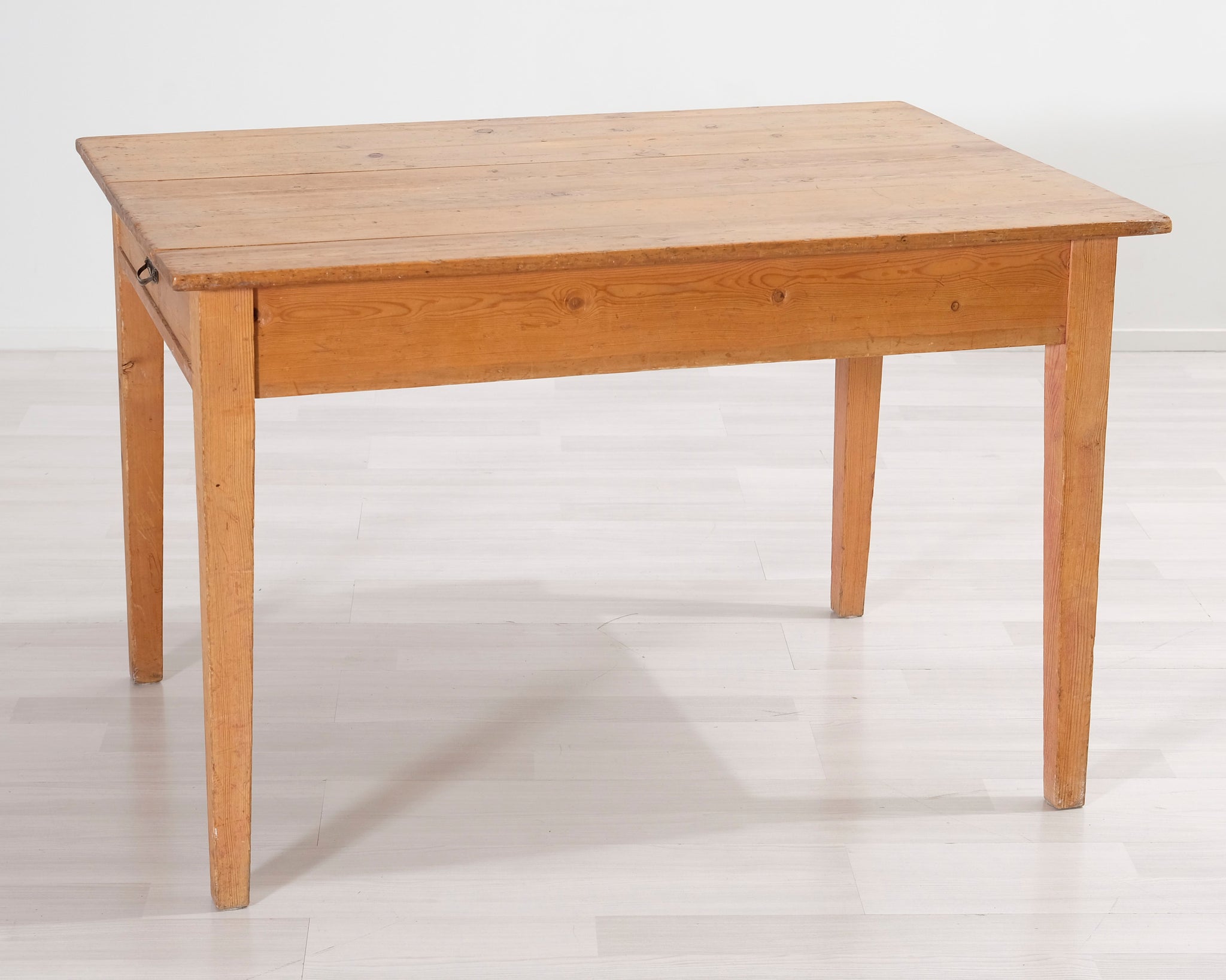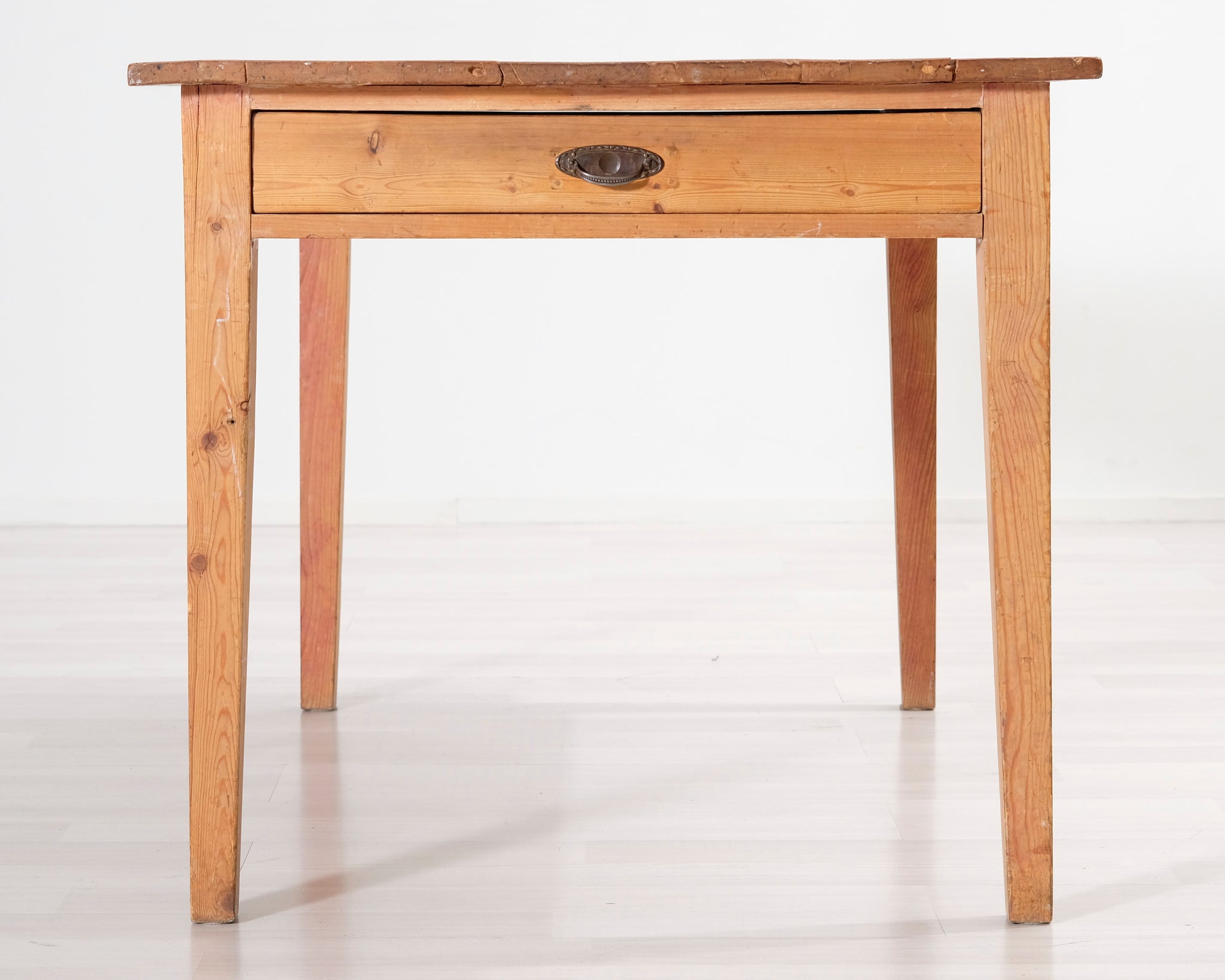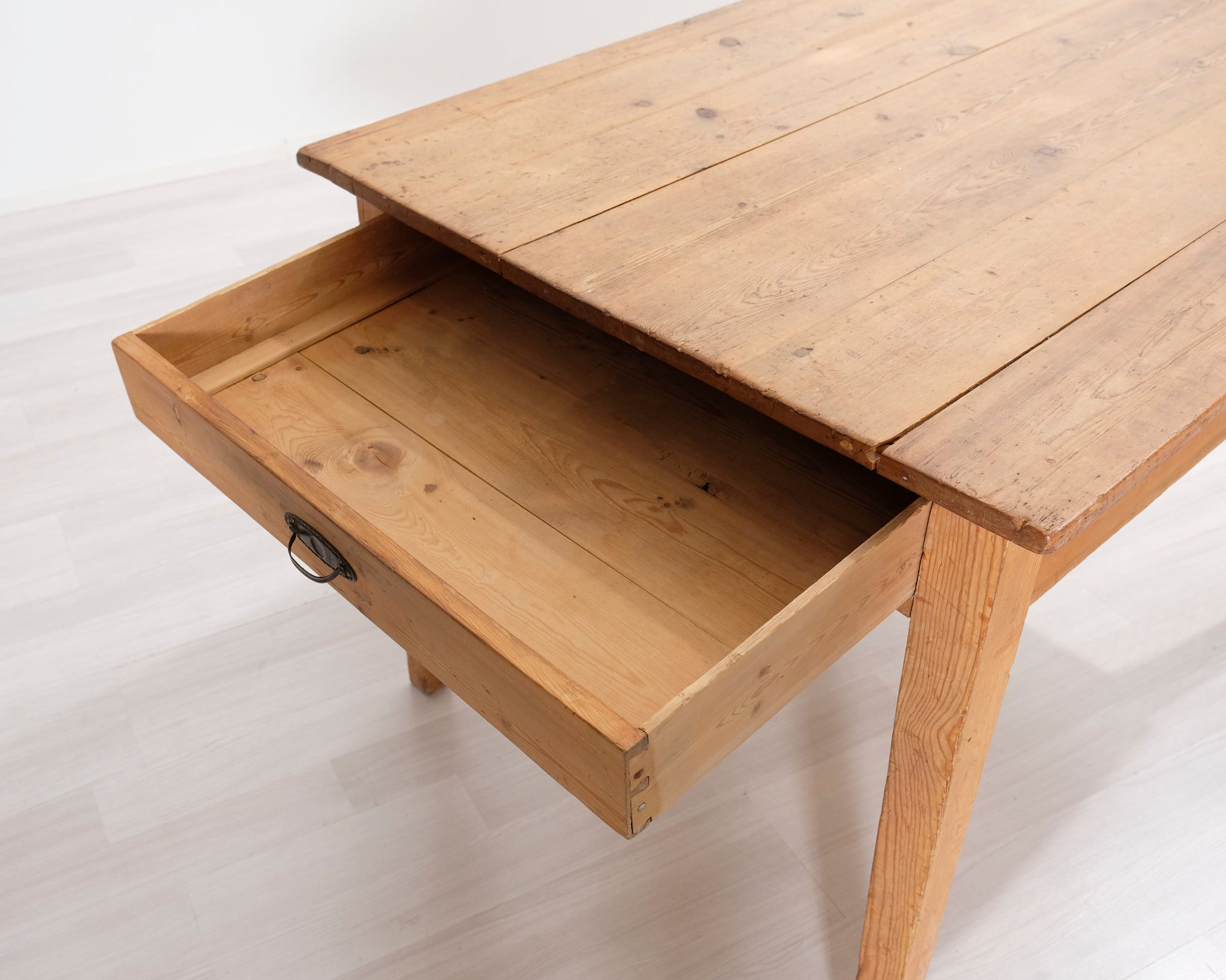 Kaunis puinen pöytä, jonka päädyssä ulosvedettävä laatikko. Sopii rustiikkiseen sisustukseen.