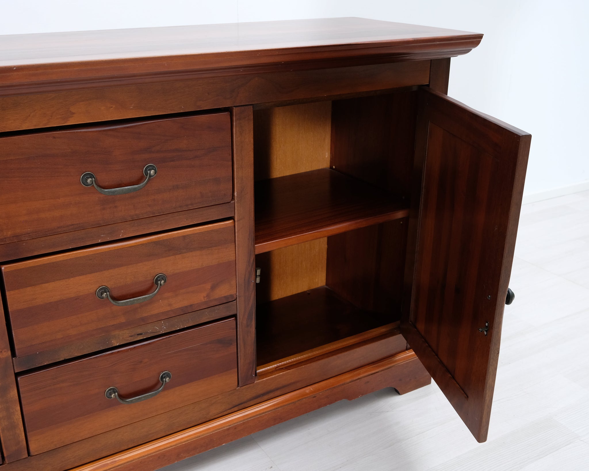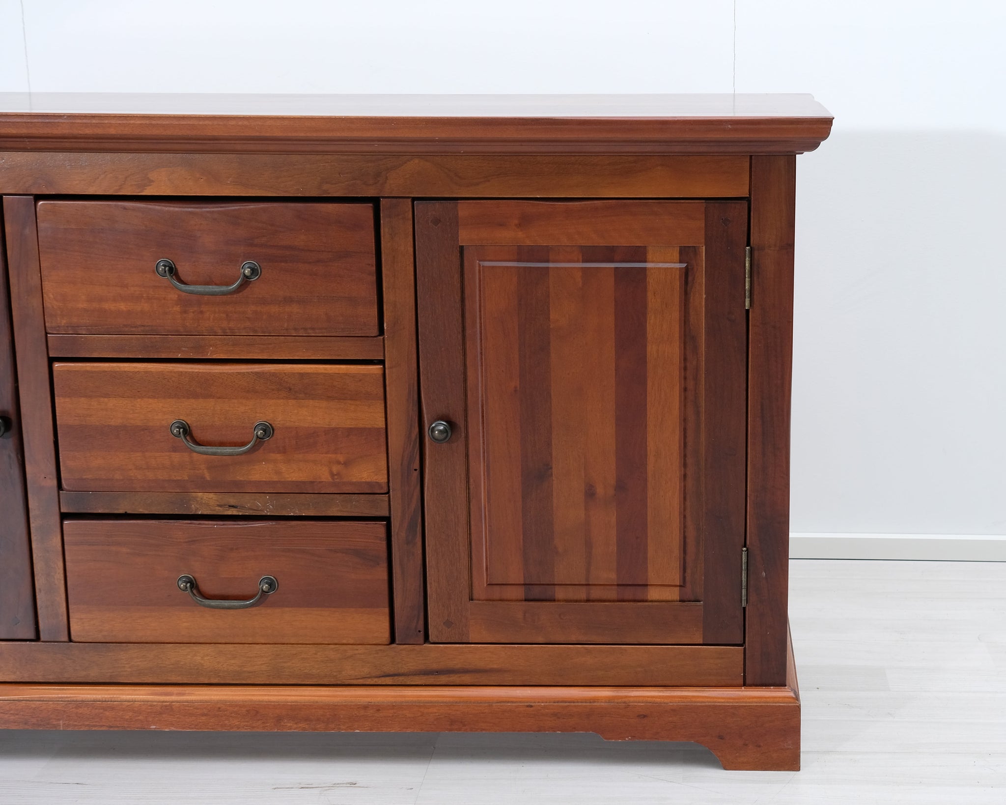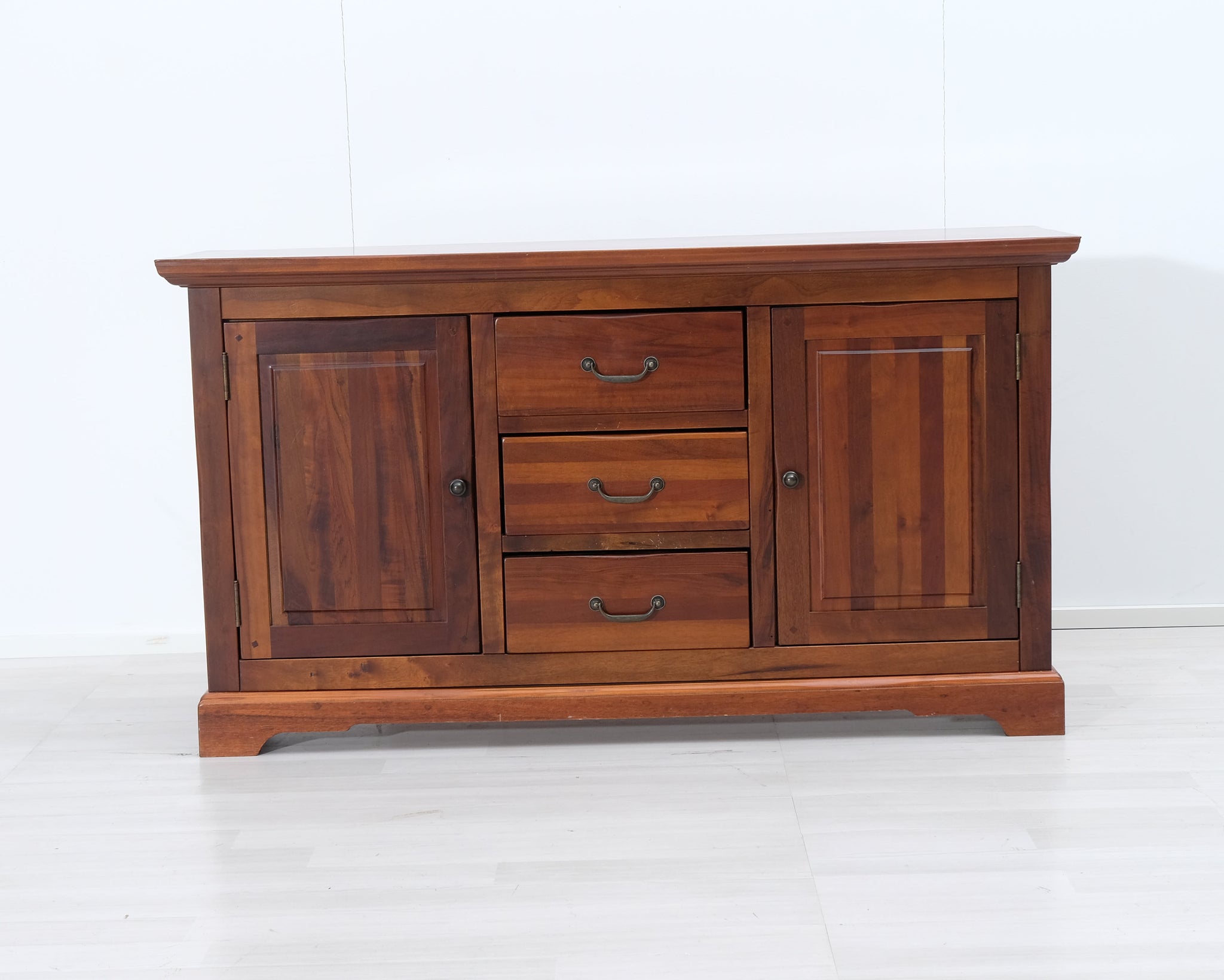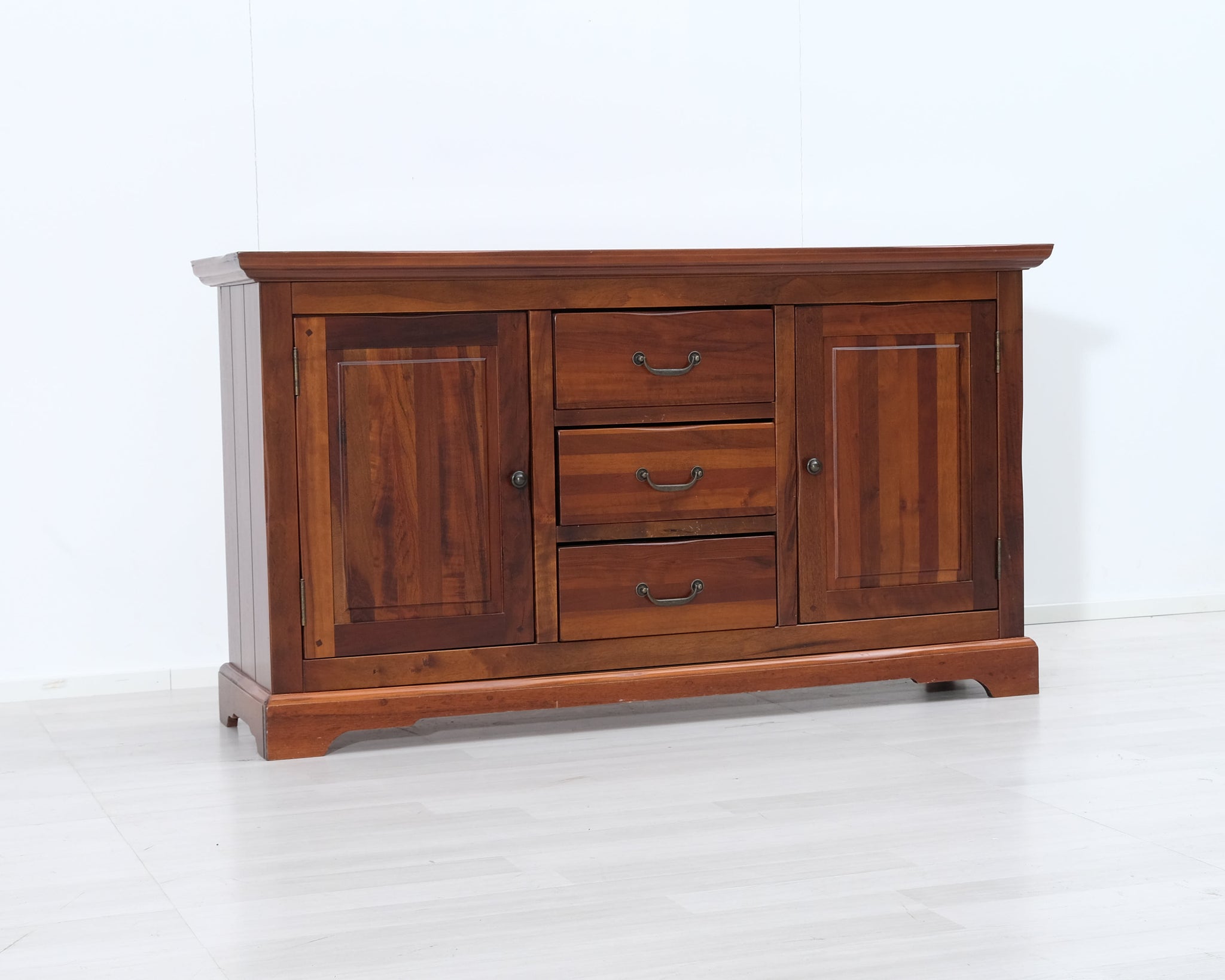 Askon valmistama senkki. Keskellä kolme laatikkoa sekä vasemmalla, että oikealla sivuille avautuvat ovet. Käsitelty tummanruskeaksi.