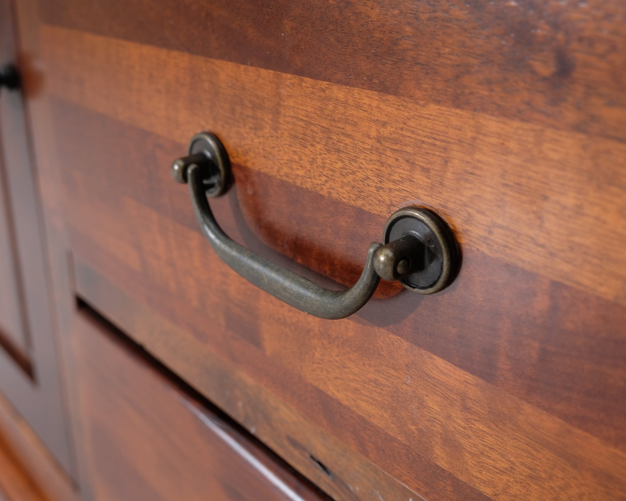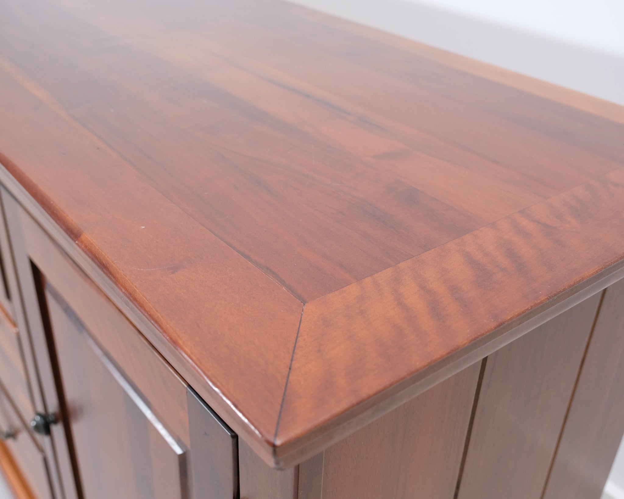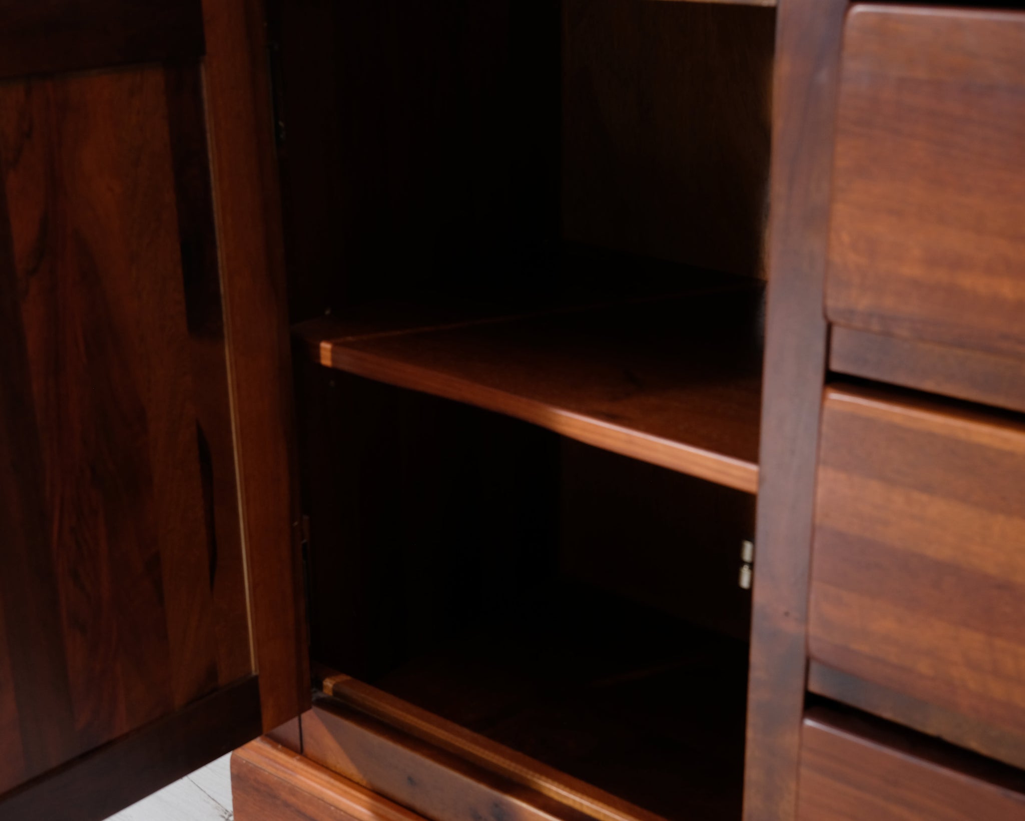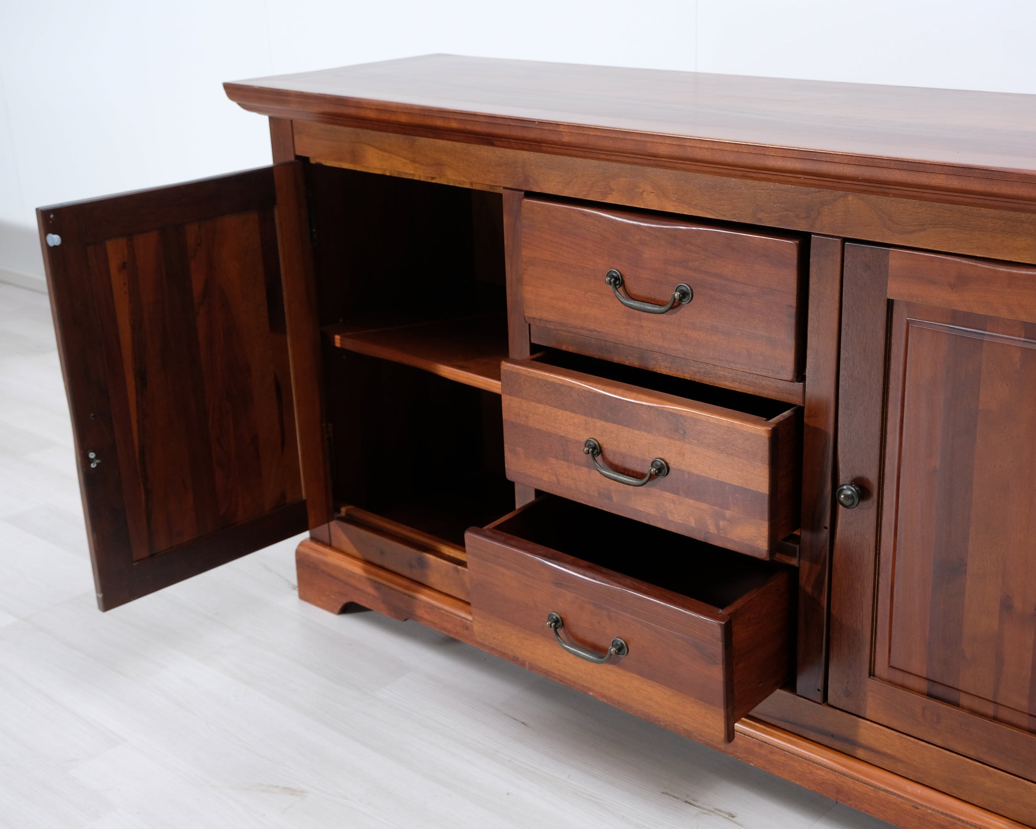 Askon valmistama senkki. Keskellä kolme laatikkoa sekä vasemmalla, että oikealla sivuille avautuvat ovet. Käsitelty tummanruskeaksi.
