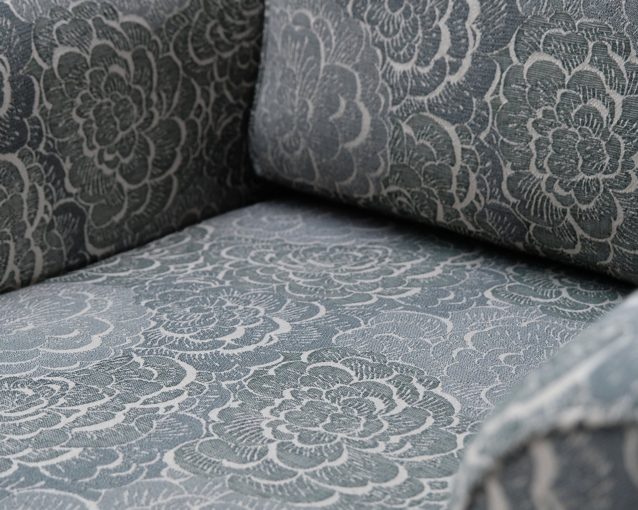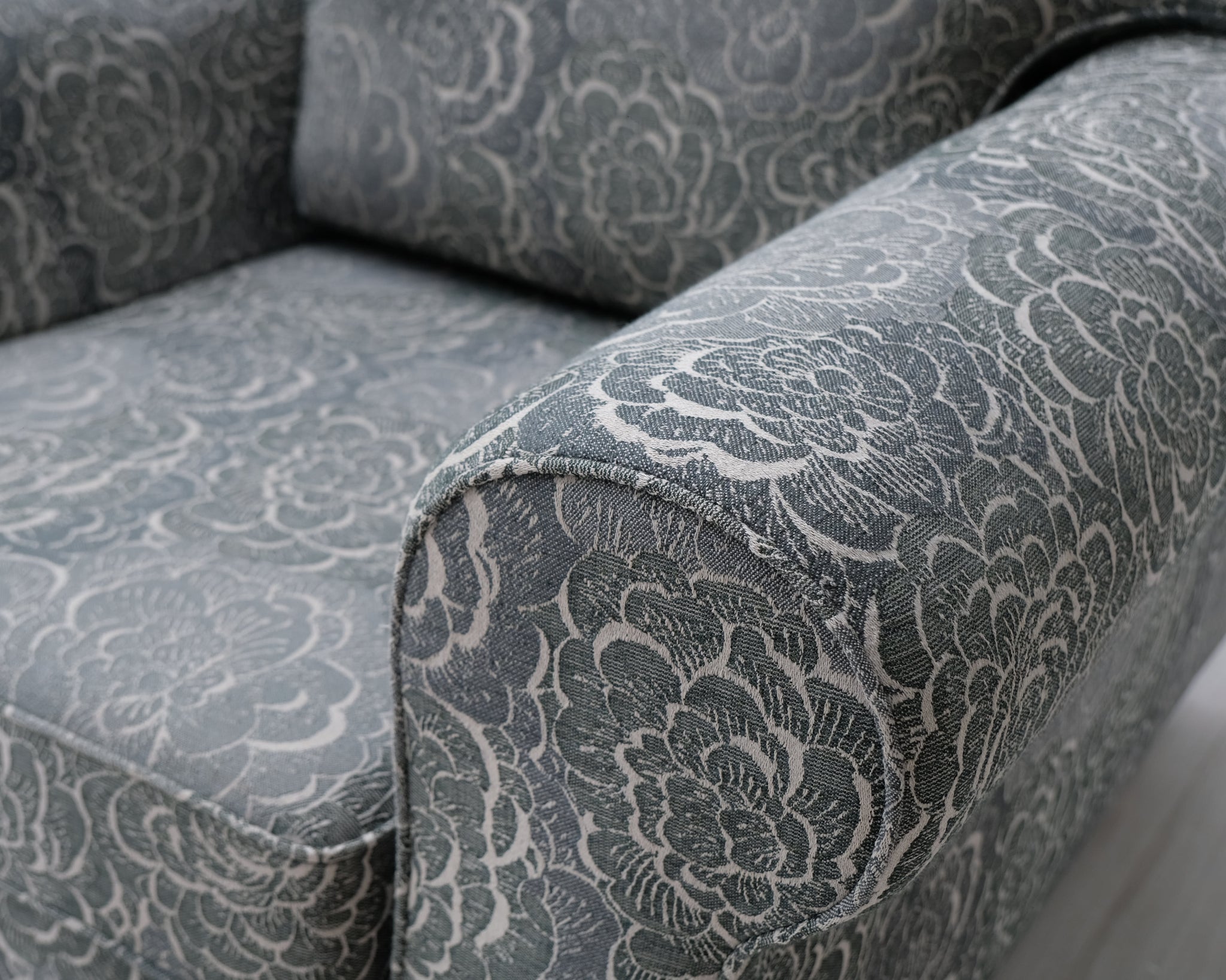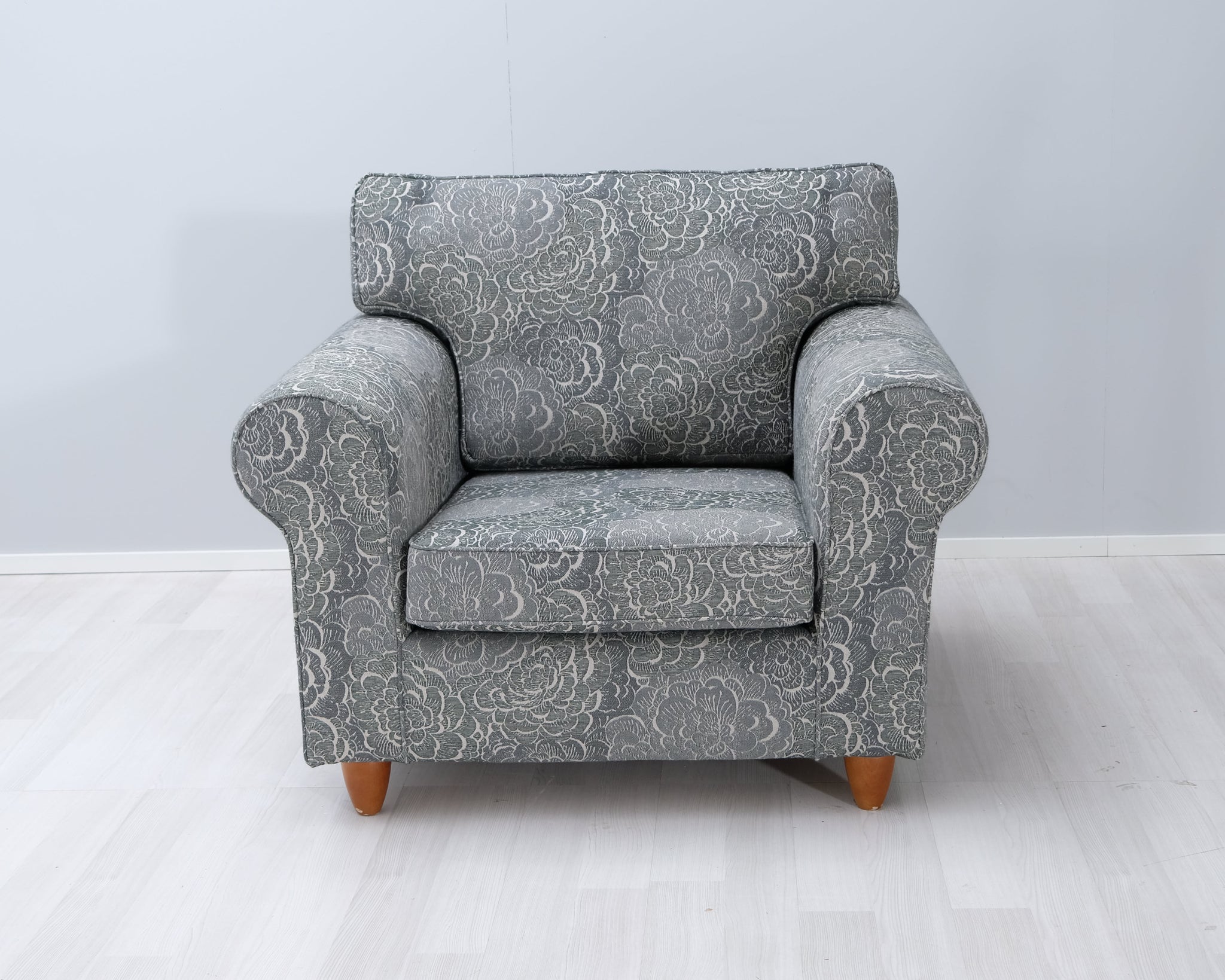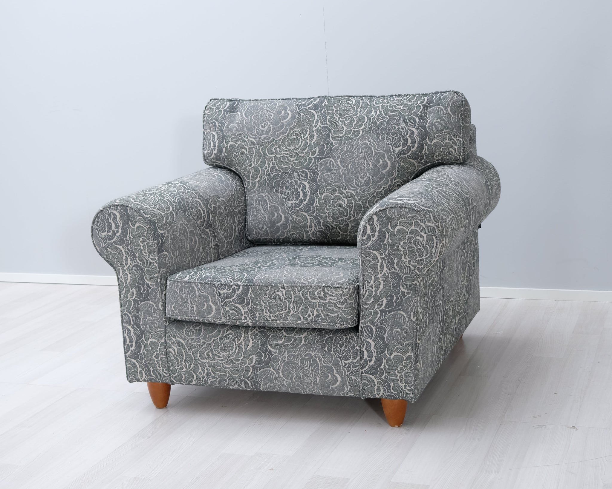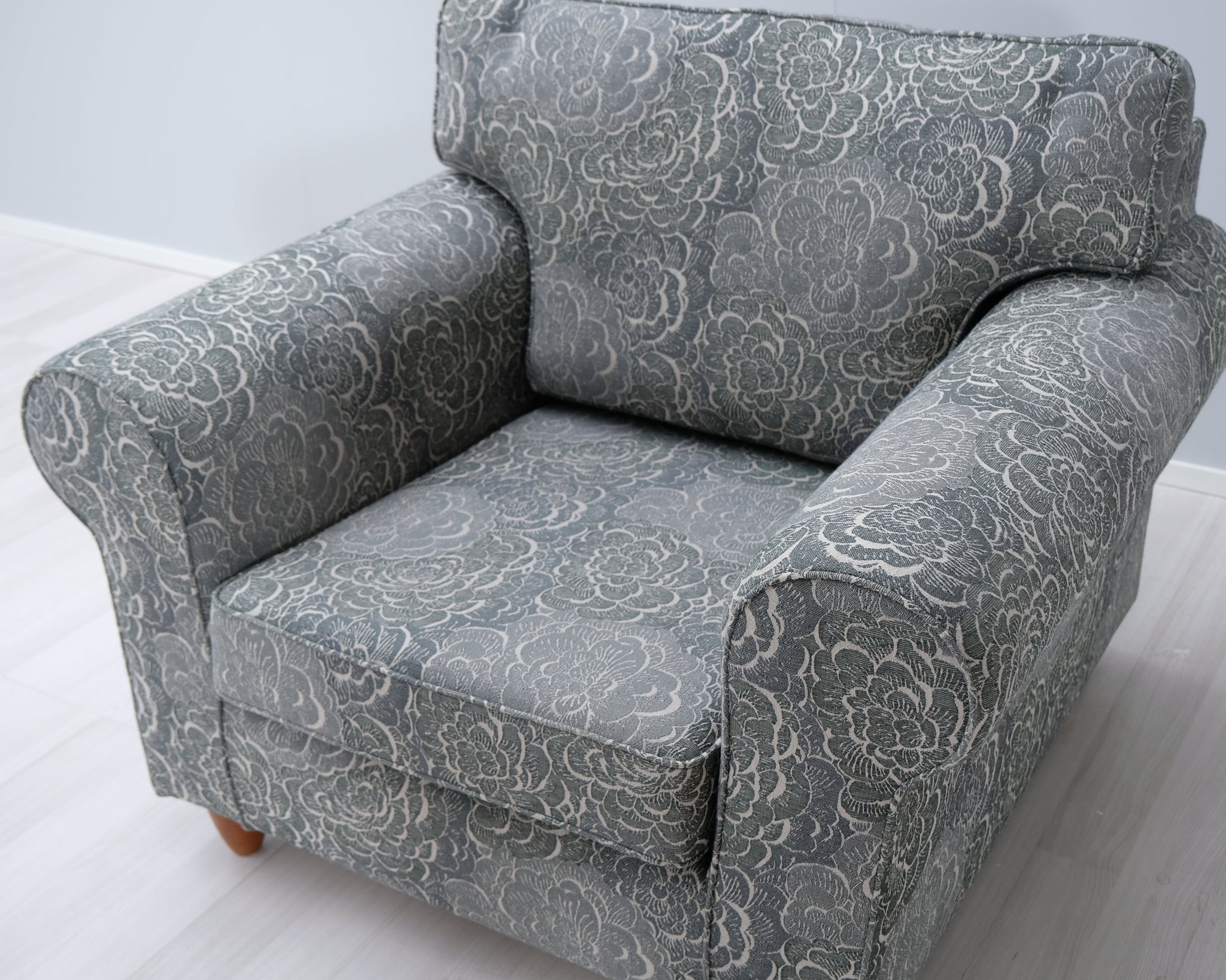 Askon Karo-sarjan lepotuoli. Kaunis kukkakuviollinen kangasverhoilu.