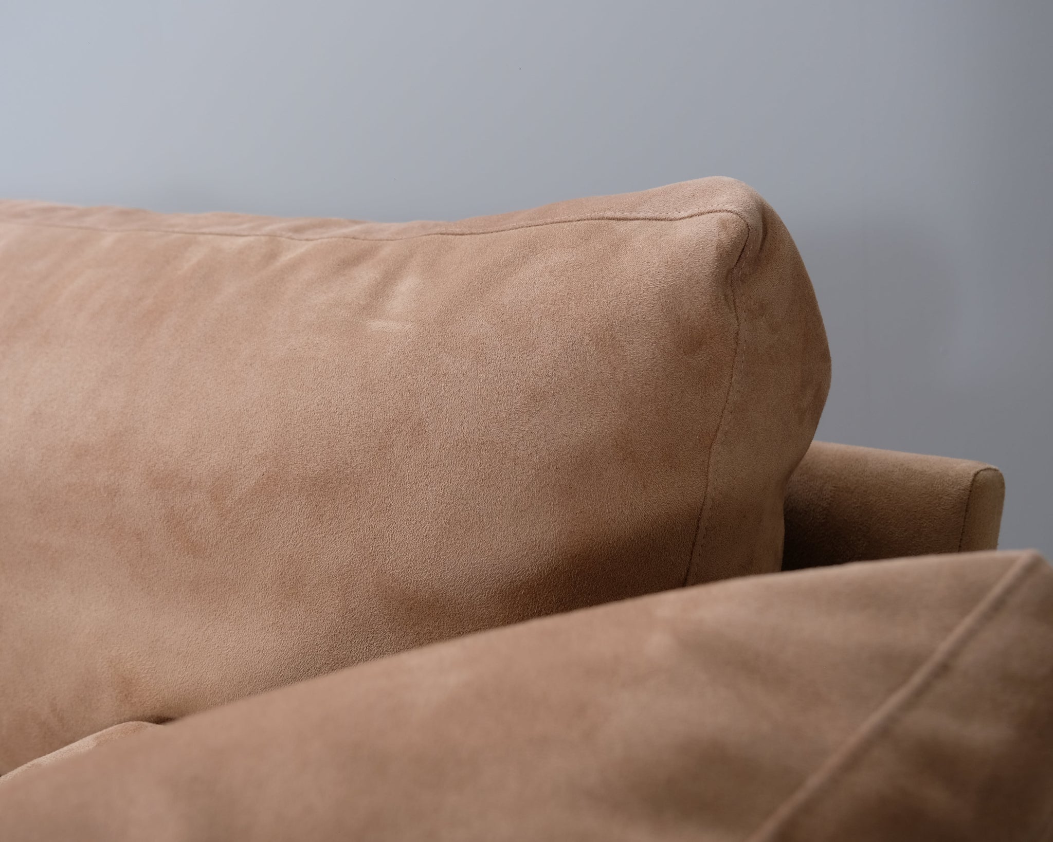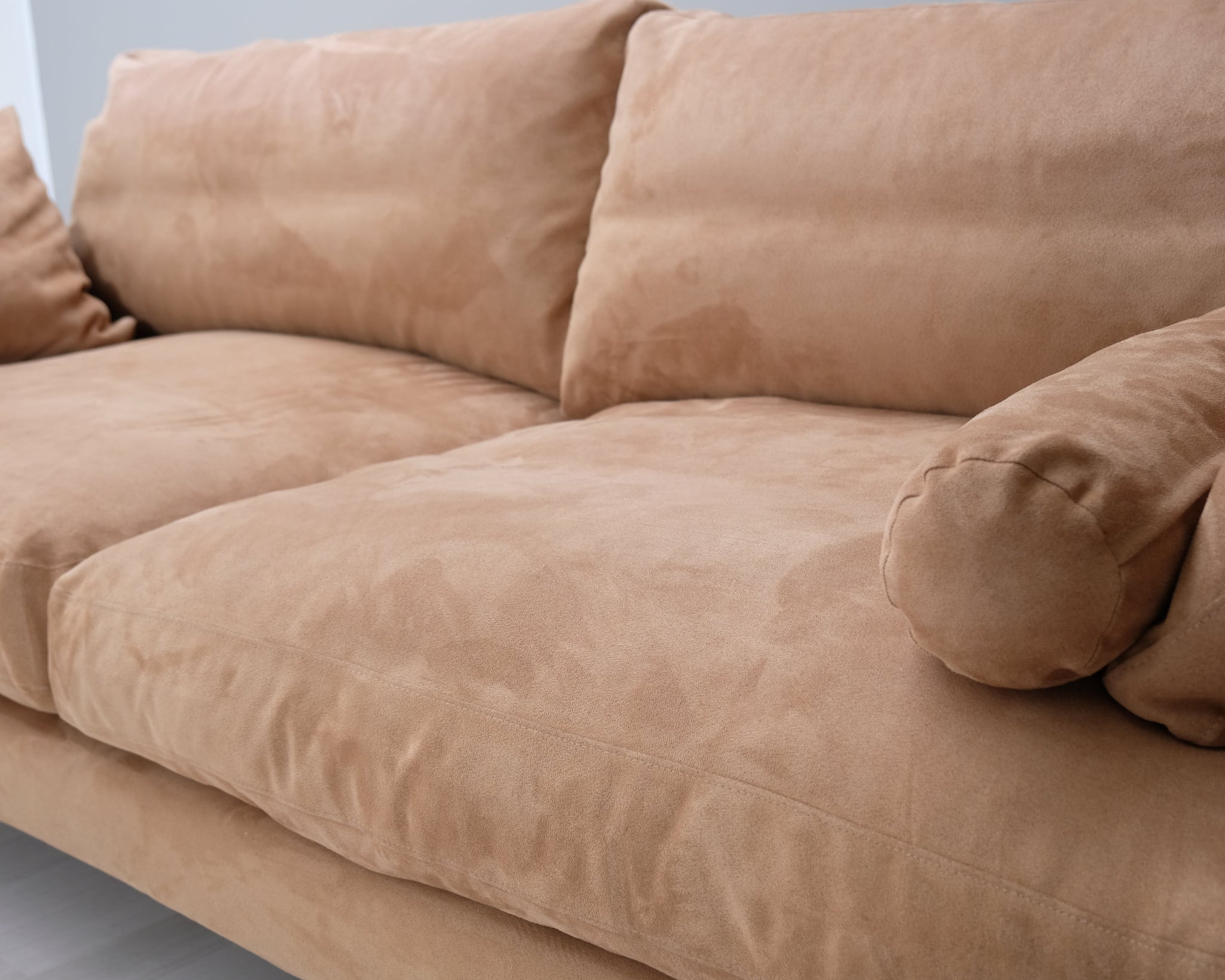 Kolmen istuttava kangassohva. Vaaleanruskeat alcantara-päälliset on irrotettavat ja konespestävät. Untuvatäyte.