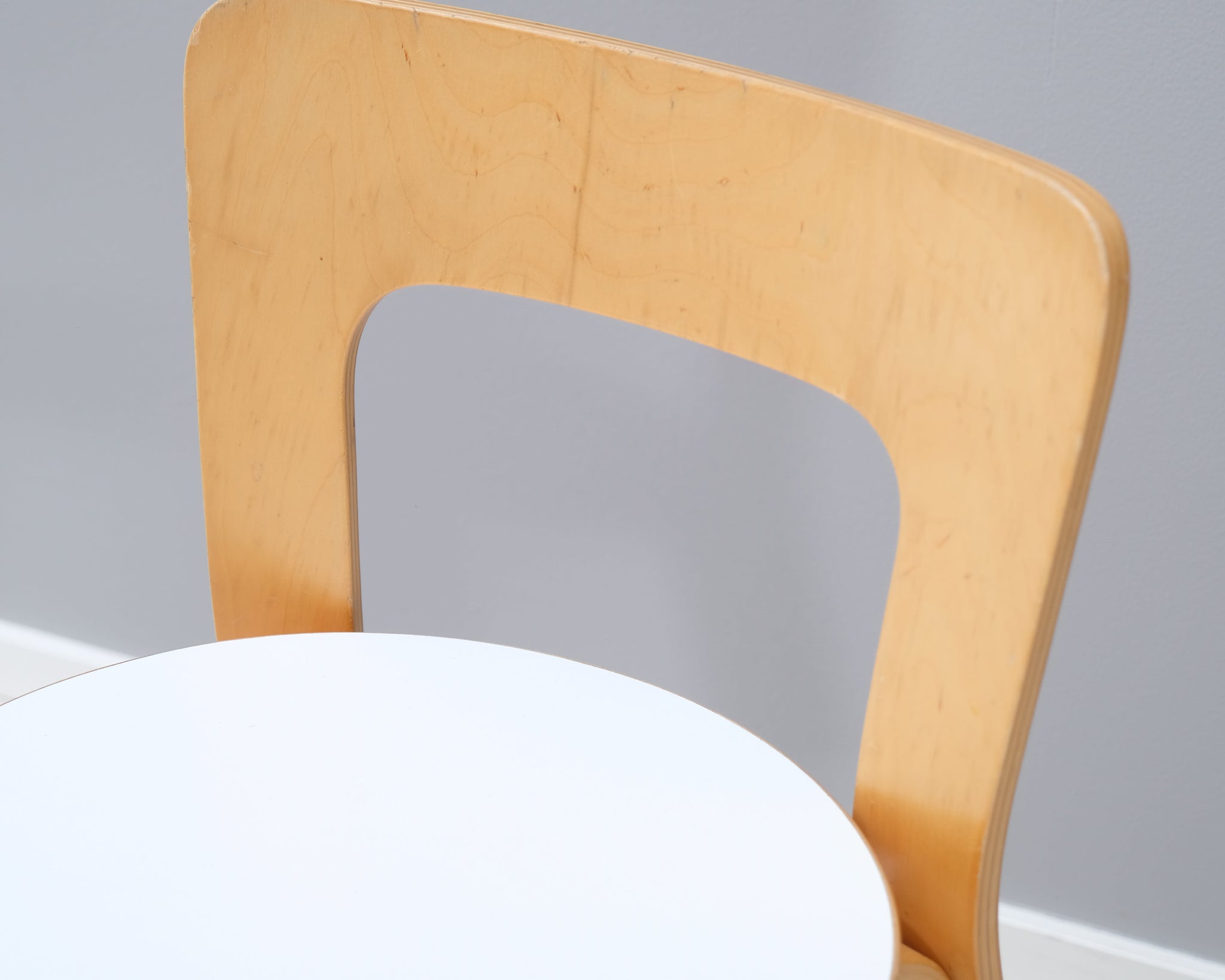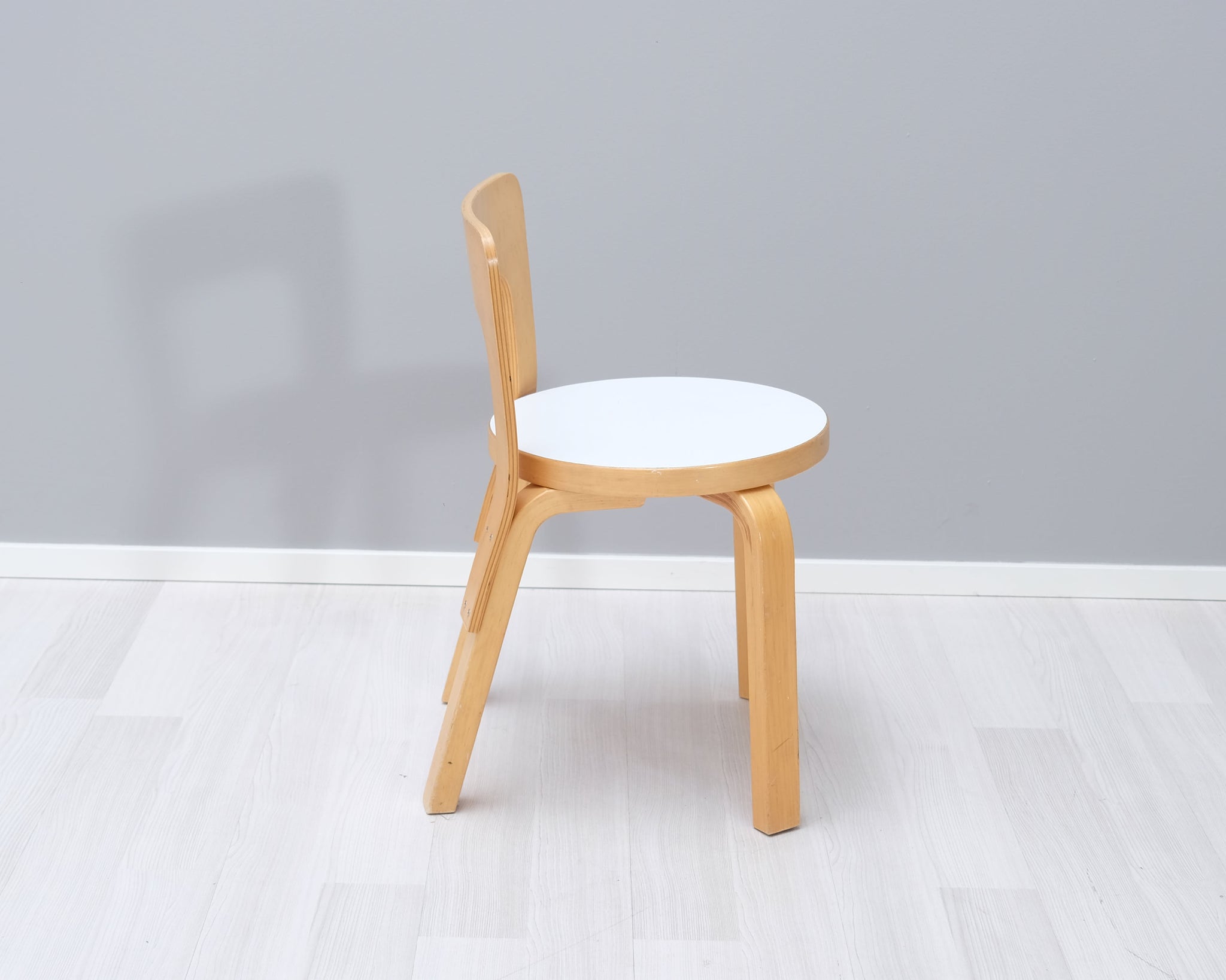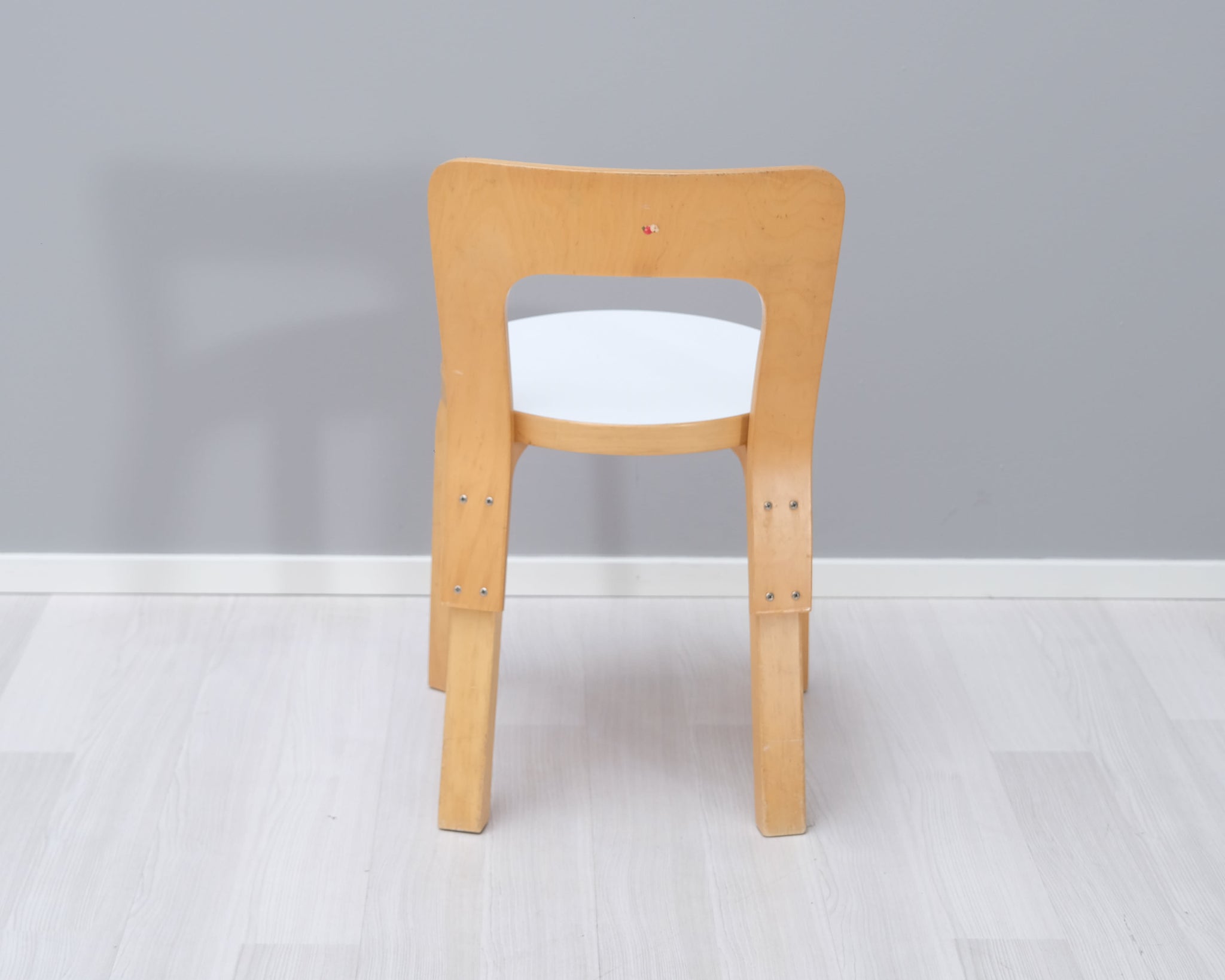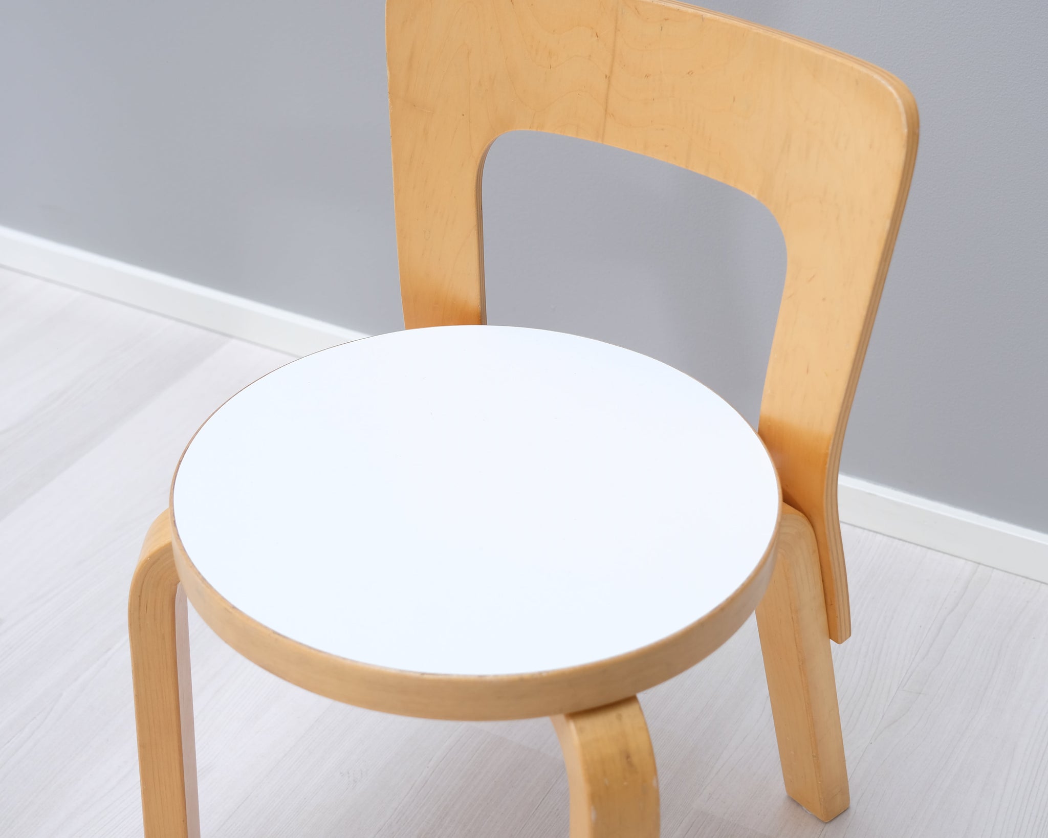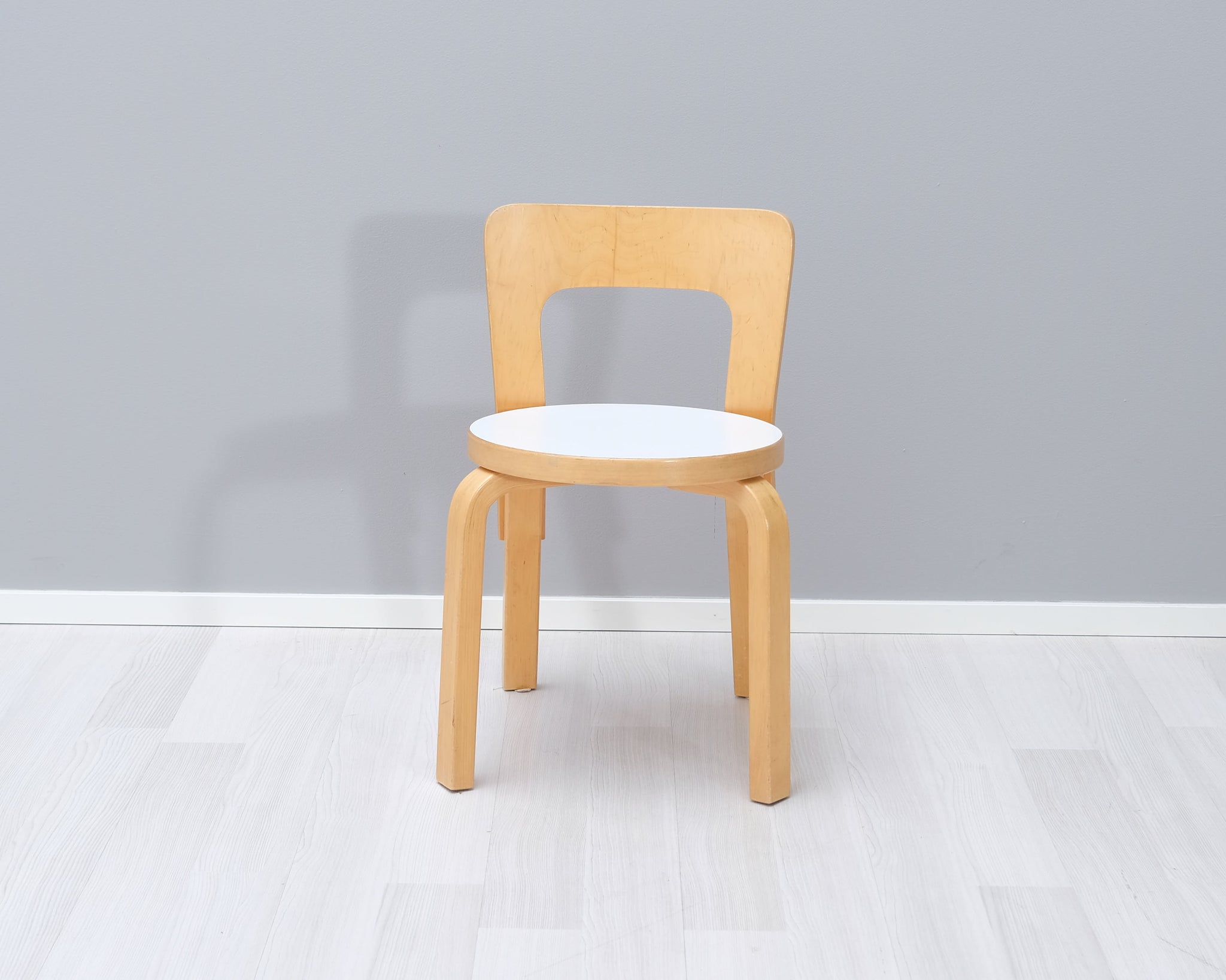 Artek N65-tuoli on pienempi versio Alvar Aallon suunnittelemasta klassisesta 65-tuolista. Alkuperäisen tuolin lailla lastentuolissa on tunnusomaiset kaarevat muodot, taivutetut L-jalat ja tukeva selkänoja. Tuoli on valmistettu koivusta ja istuinosaa koristaa valkoinen laminaattipinta.