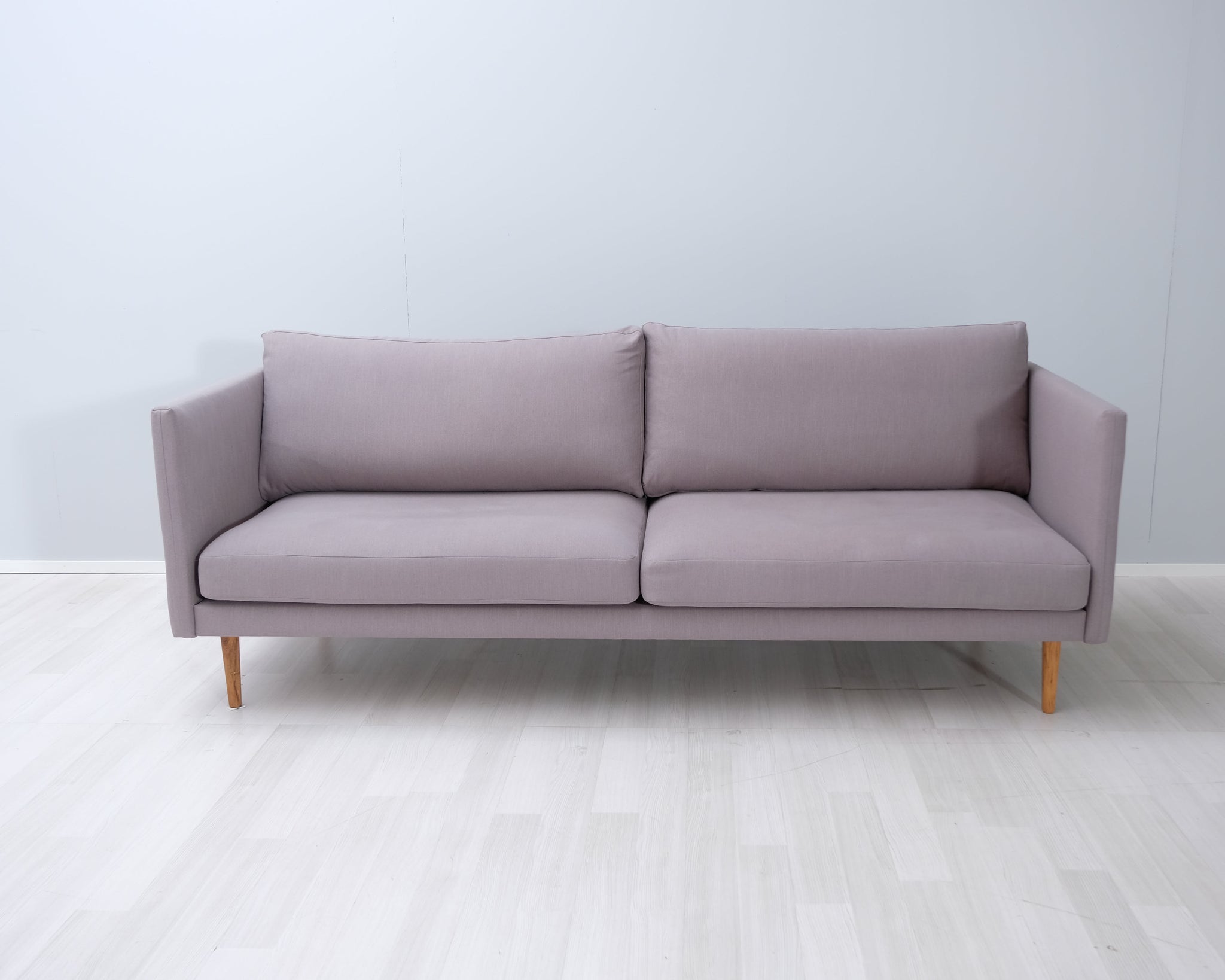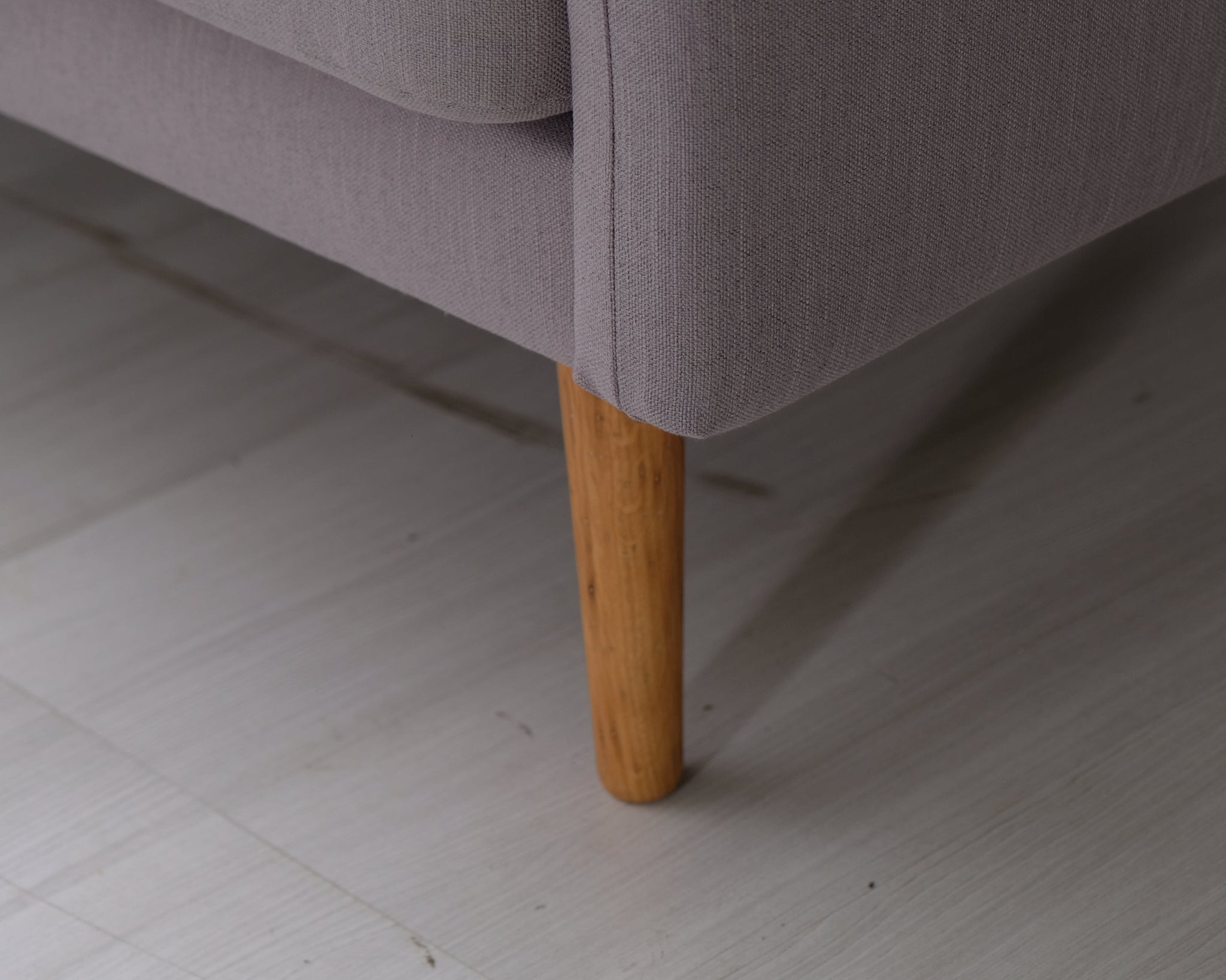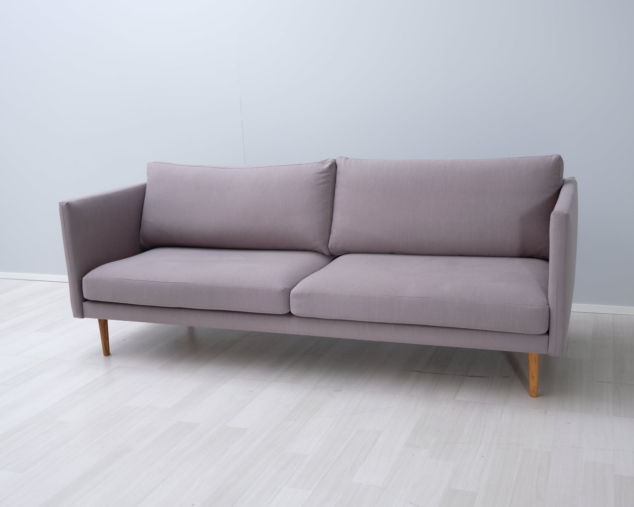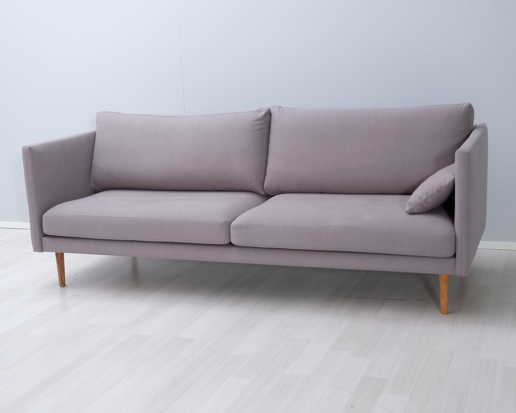 Harmaa kolmen istuttava sohva leveillä istuintyynyillä sekä puisilla jaloilla. Irrotettavat tyynynpäälliset.