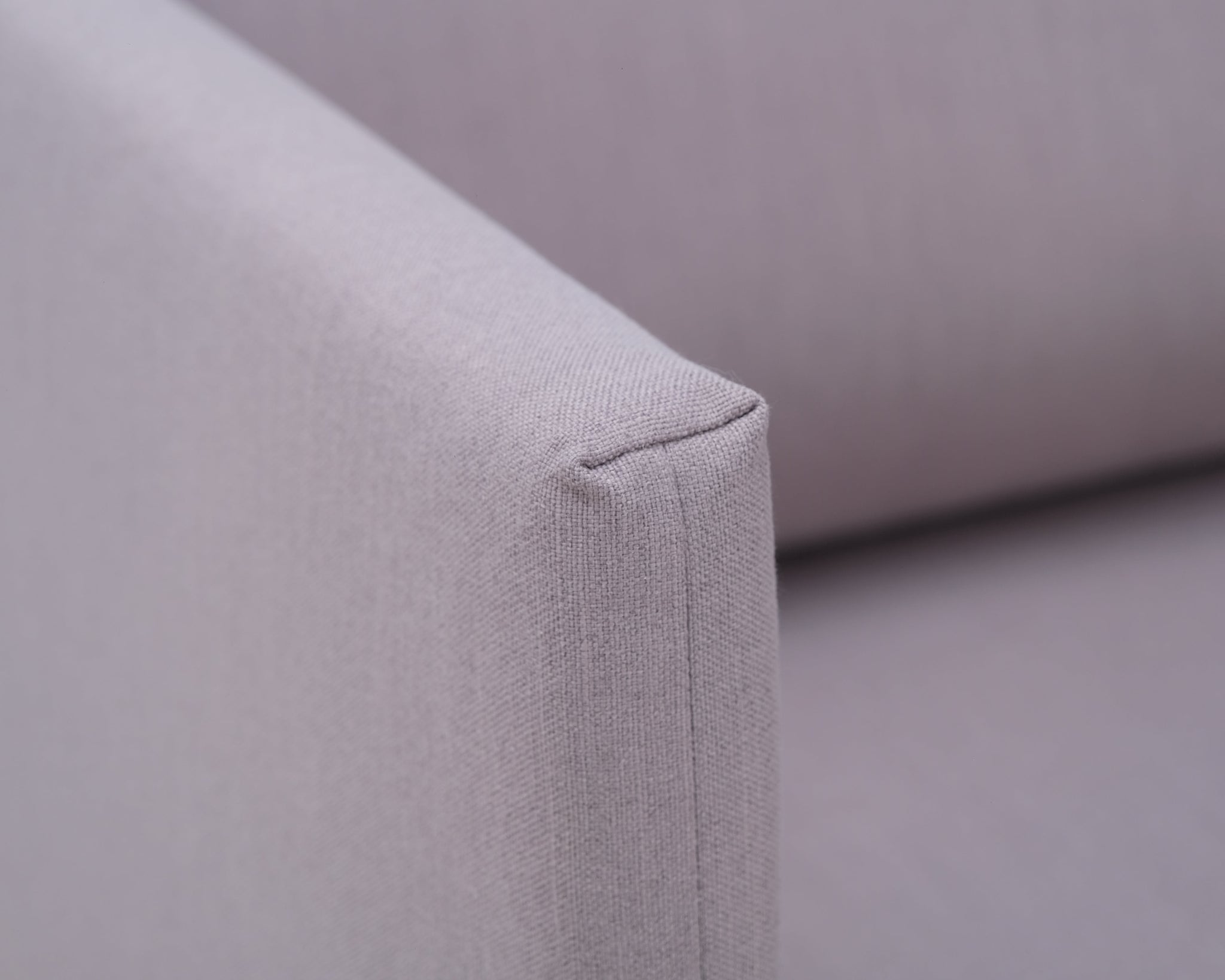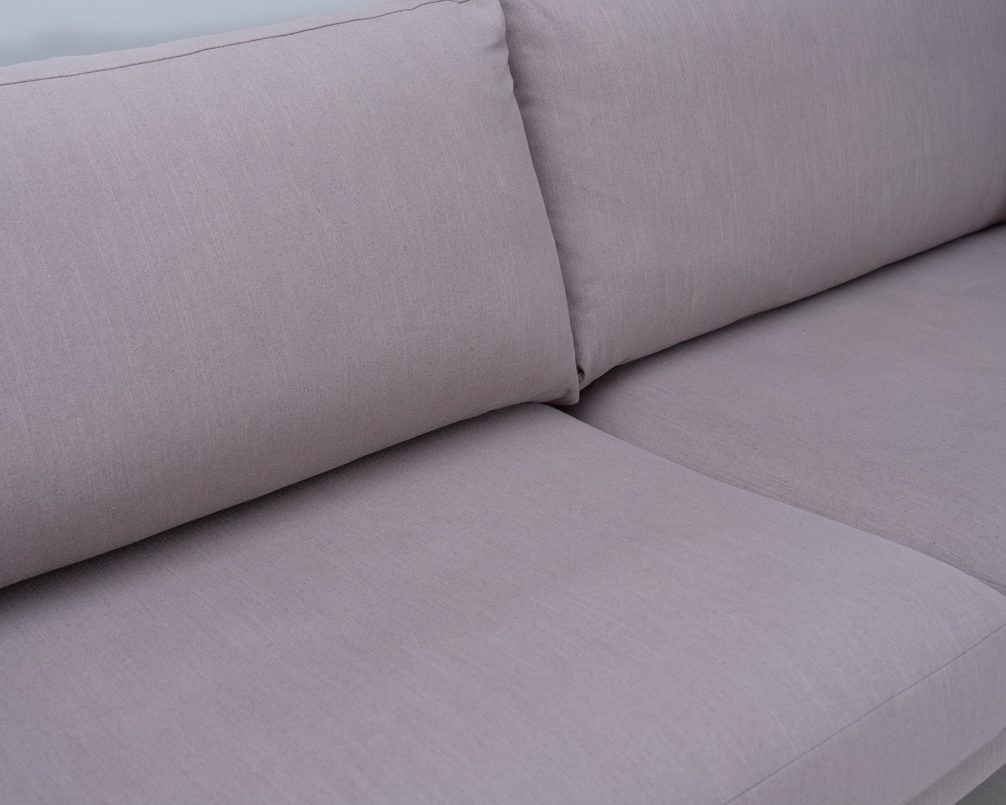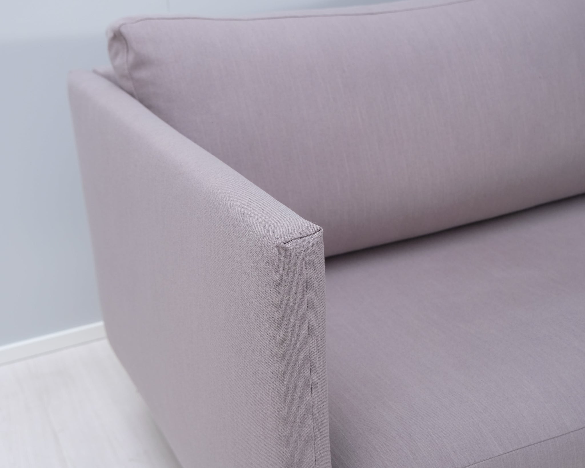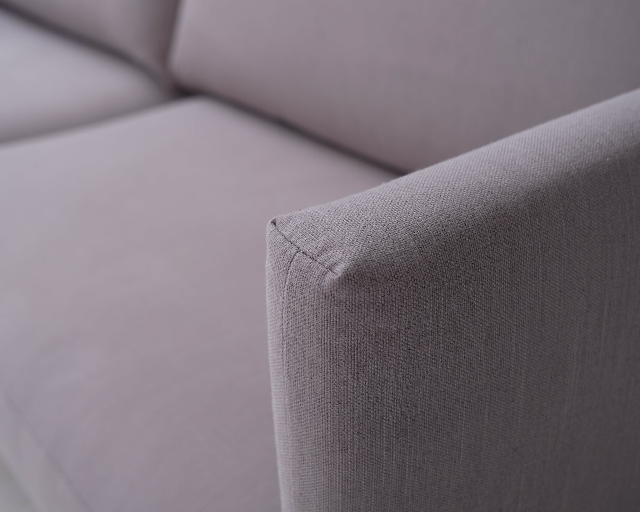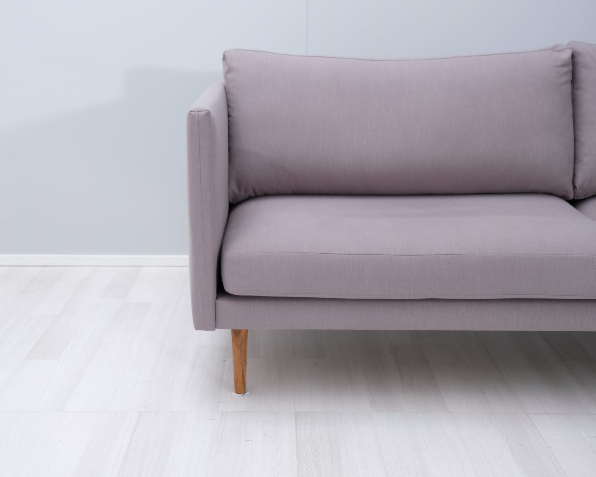 Harmaa kolmen istuttava sohva leveillä istuintyynyillä sekä puisilla jaloilla. Irrotettavat tyynynpäälliset.