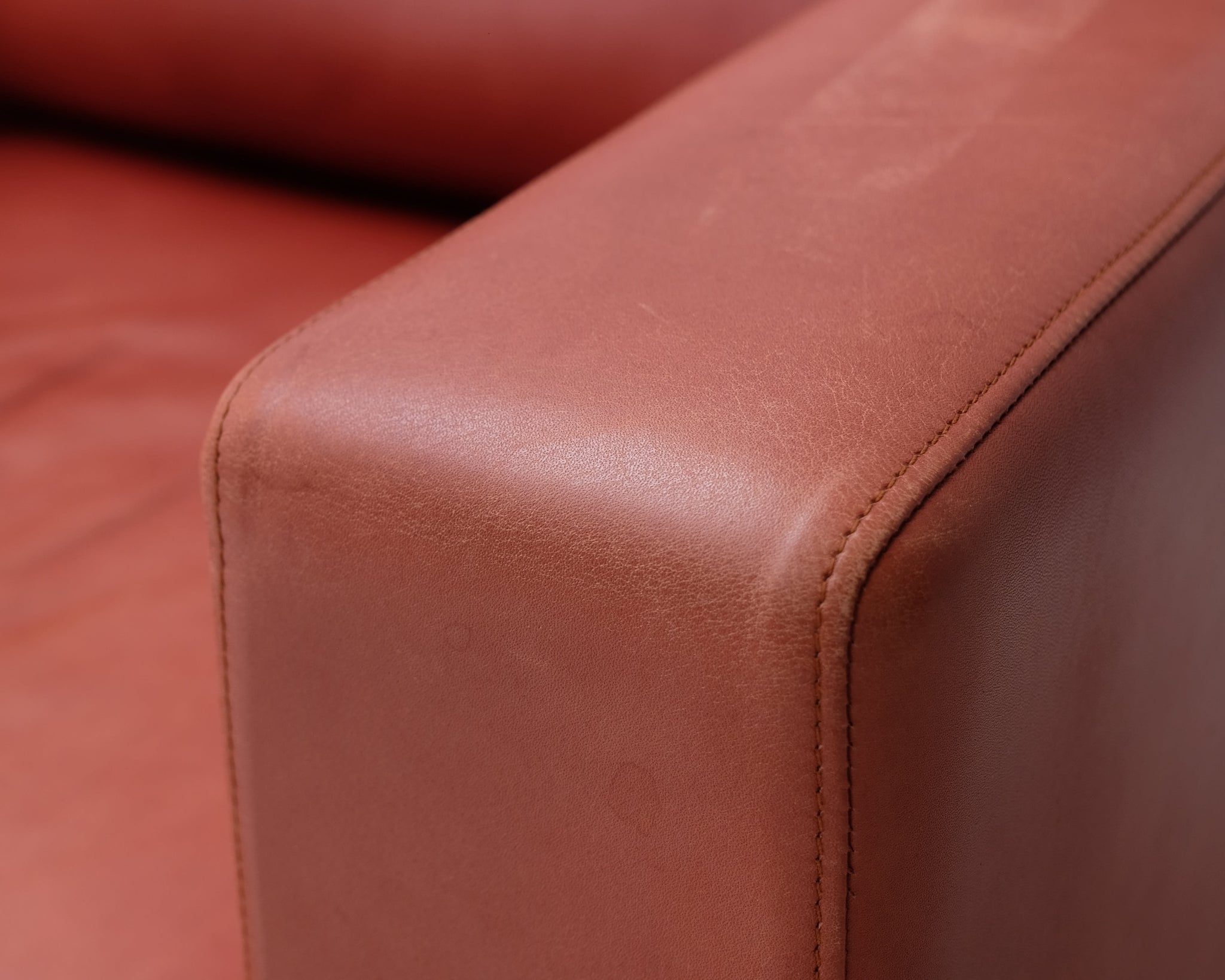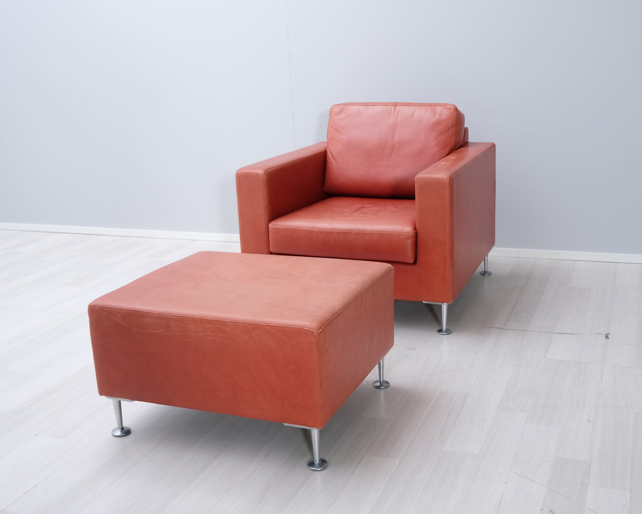 Sopen punainen nahkanojatuoli ja yhteensopiva rahi. Nojatuoli sopii täydellisesti väripilkuksi kotiin kuin kotiin.