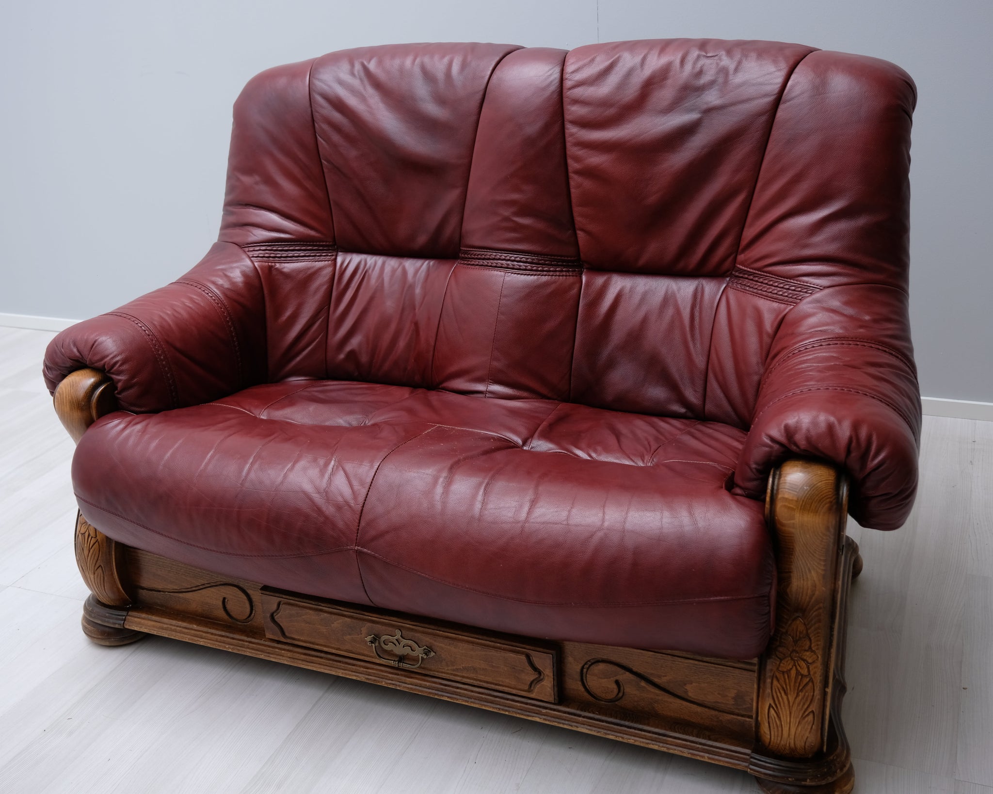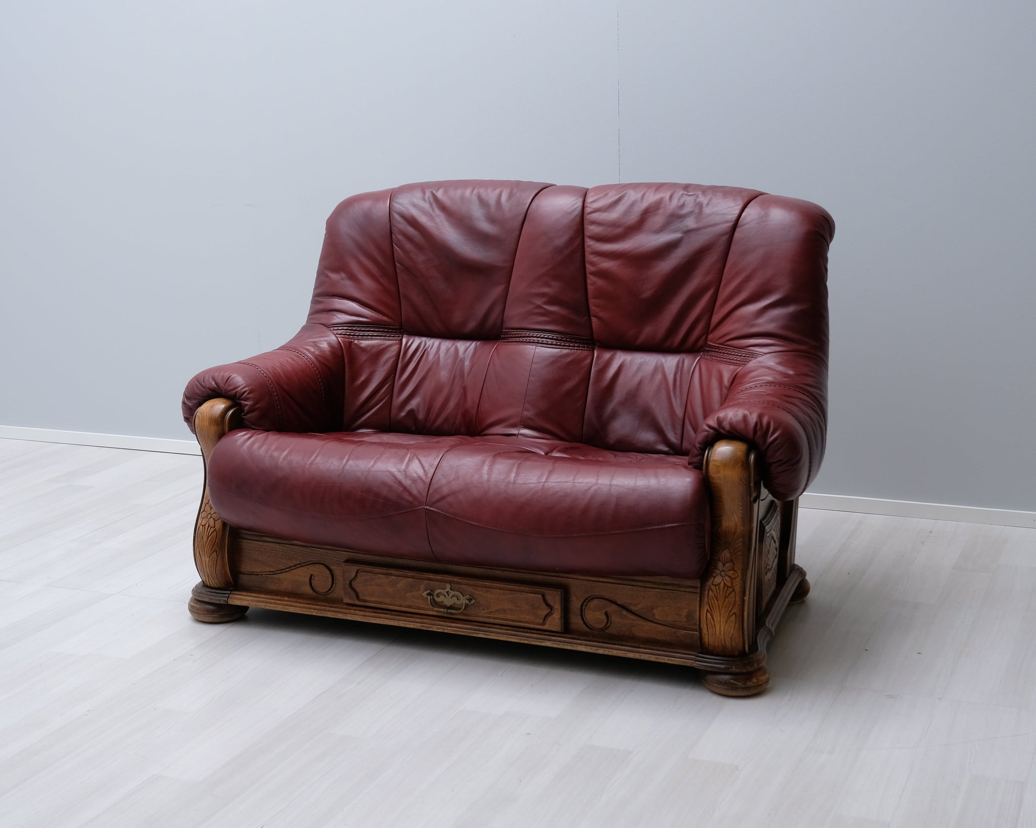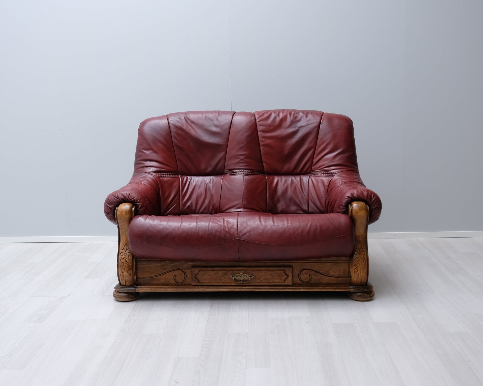 Suomi-Soffasta ostettu kahden istuttava sohva koristeellisella puurungolla ja punaisella nahkaverhoilulla.