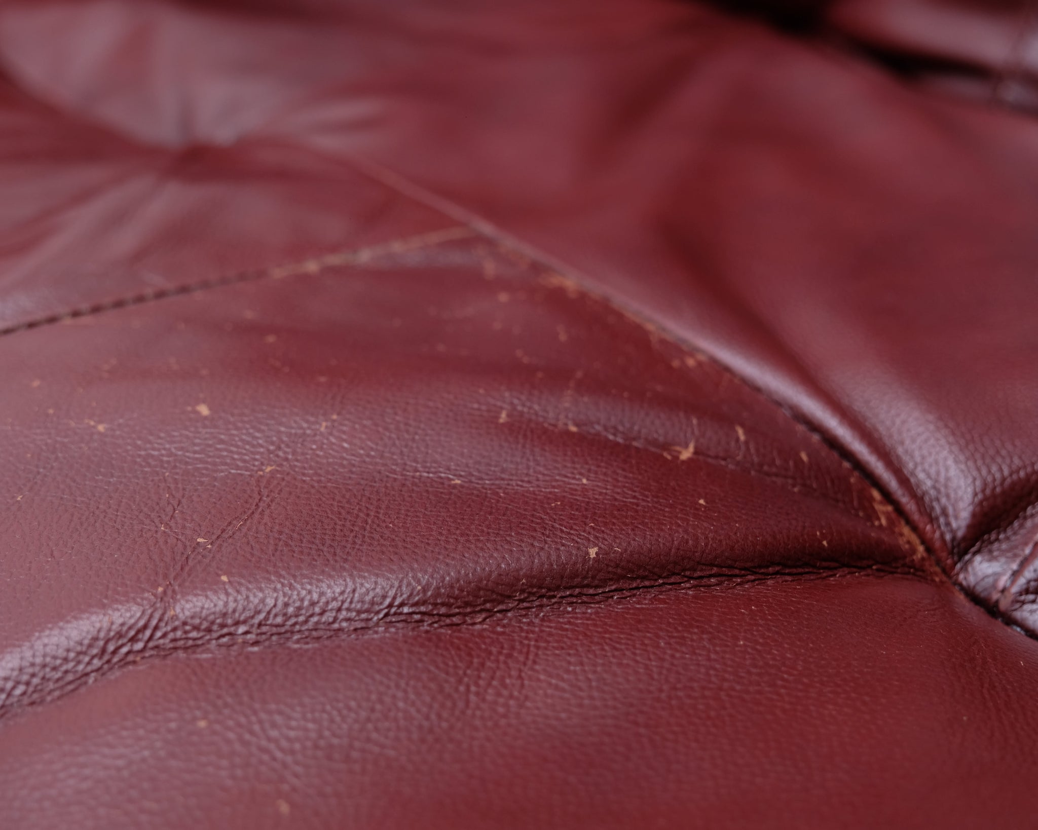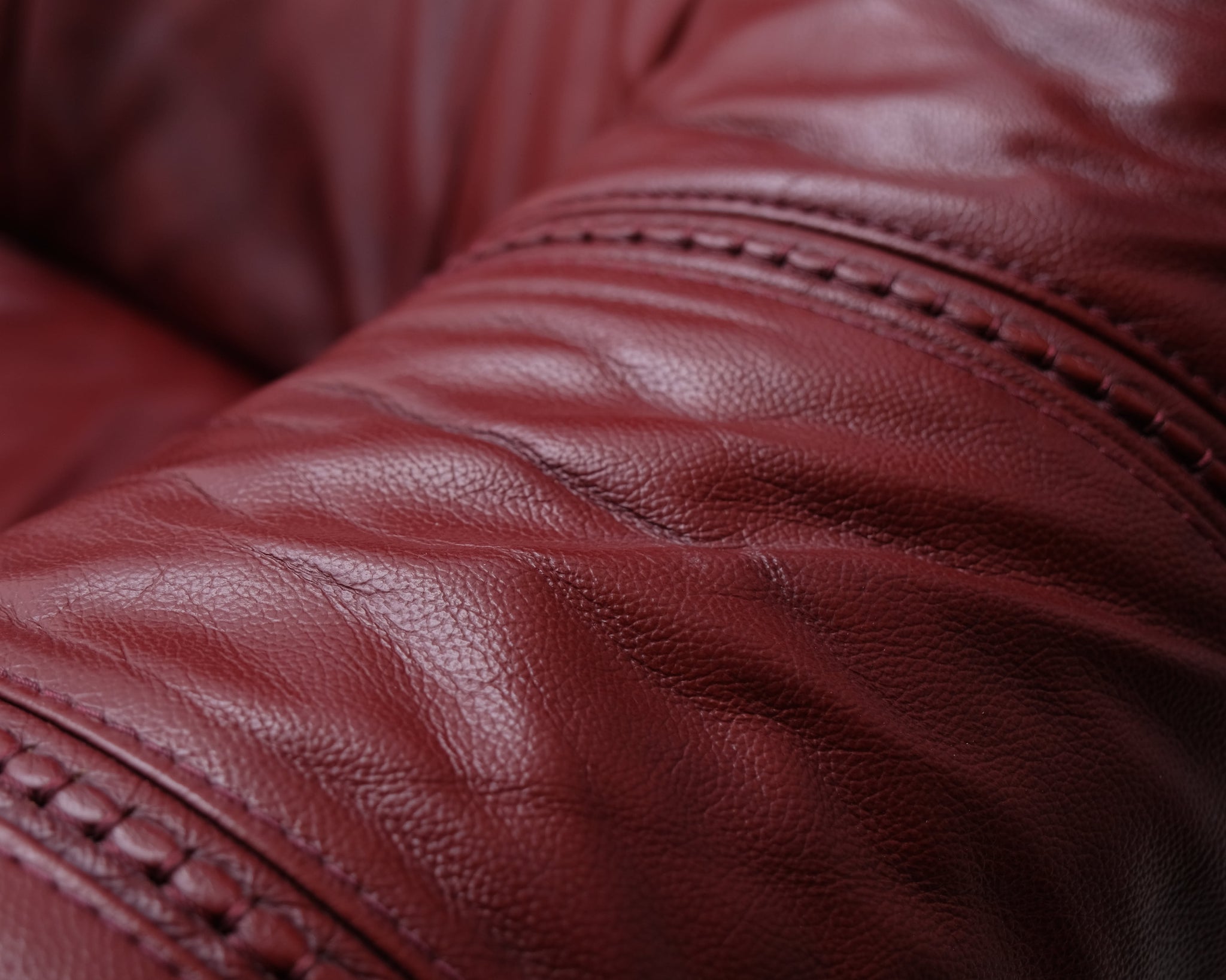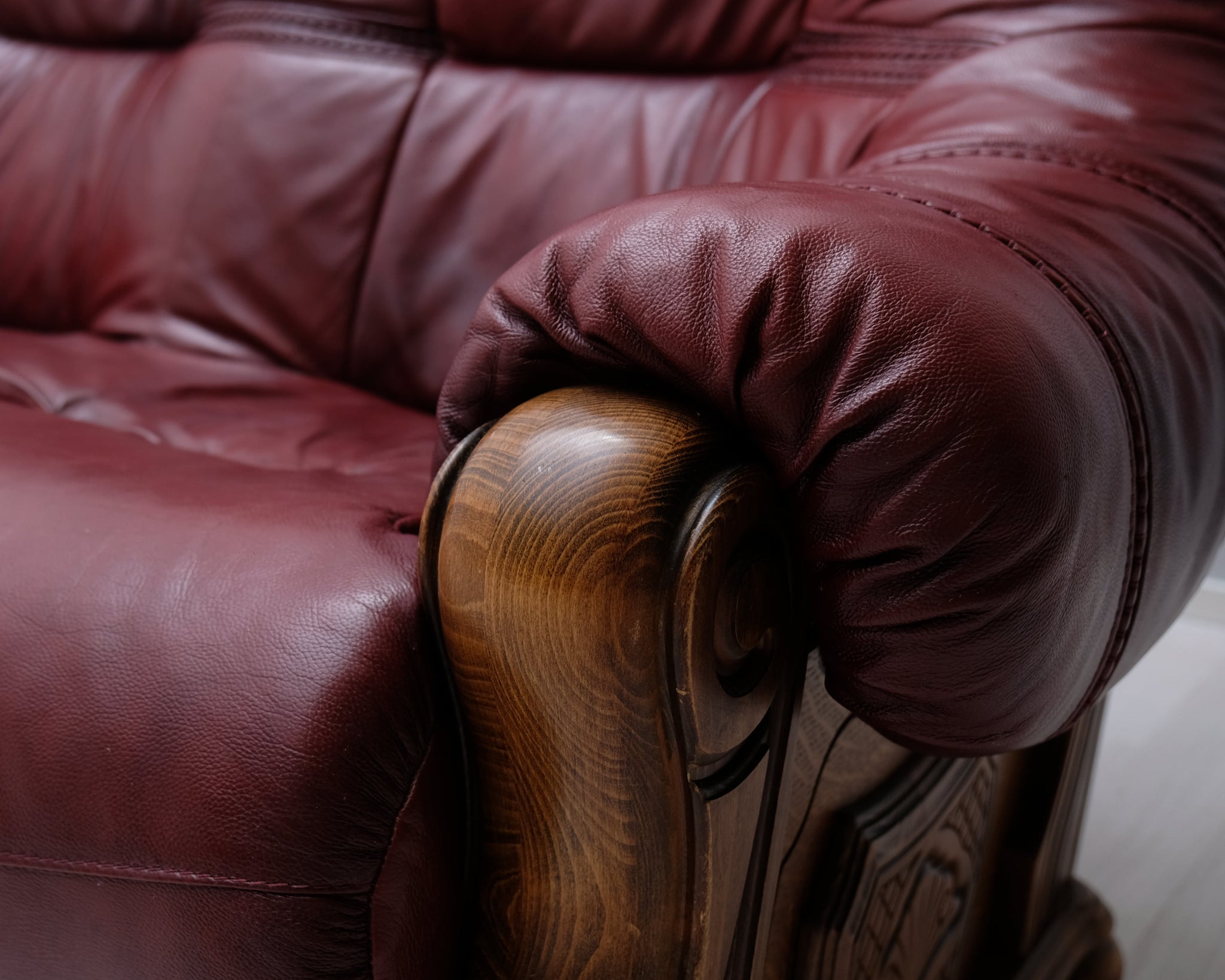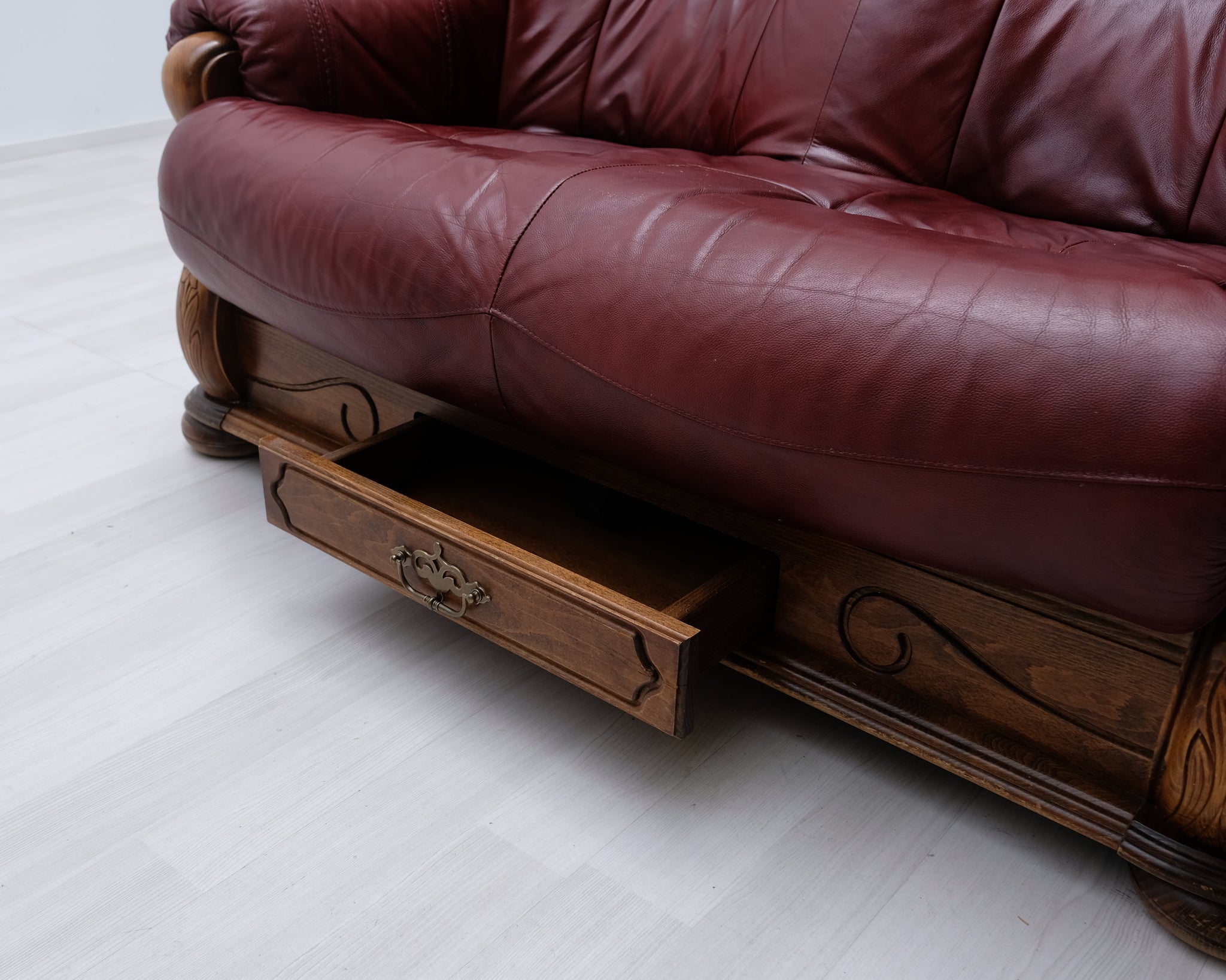 Suomi-Soffasta ostettu kahden istuttava sohva koristeellisella puurungolla ja punaisella nahkaverhoilulla.