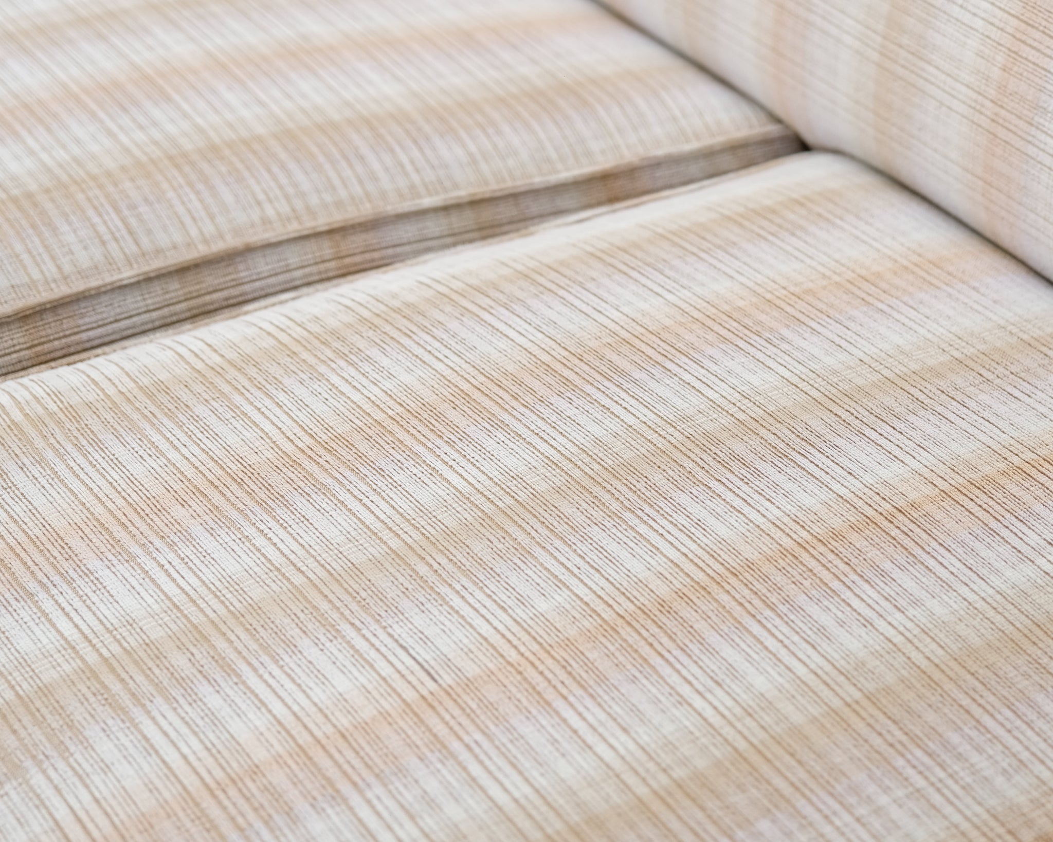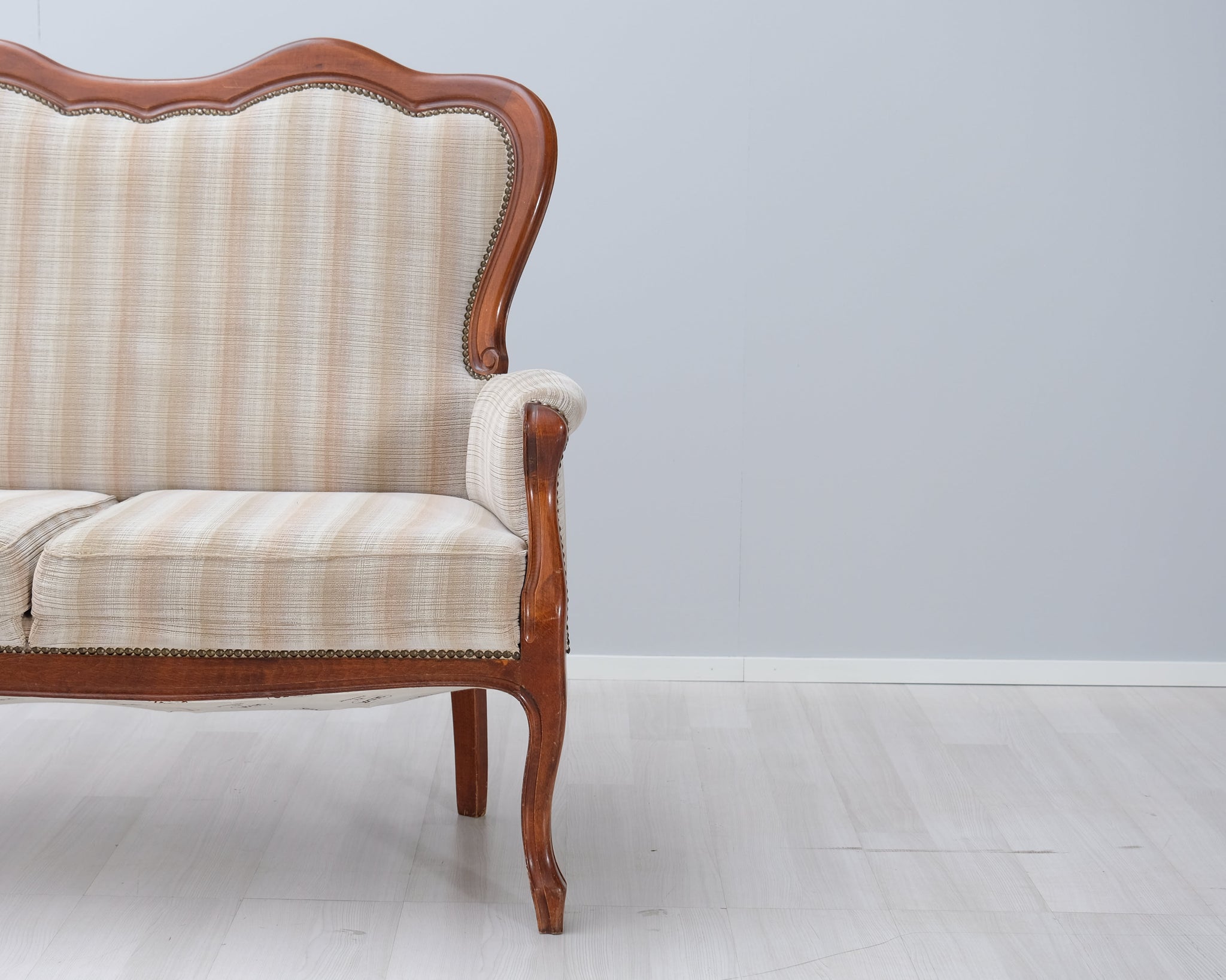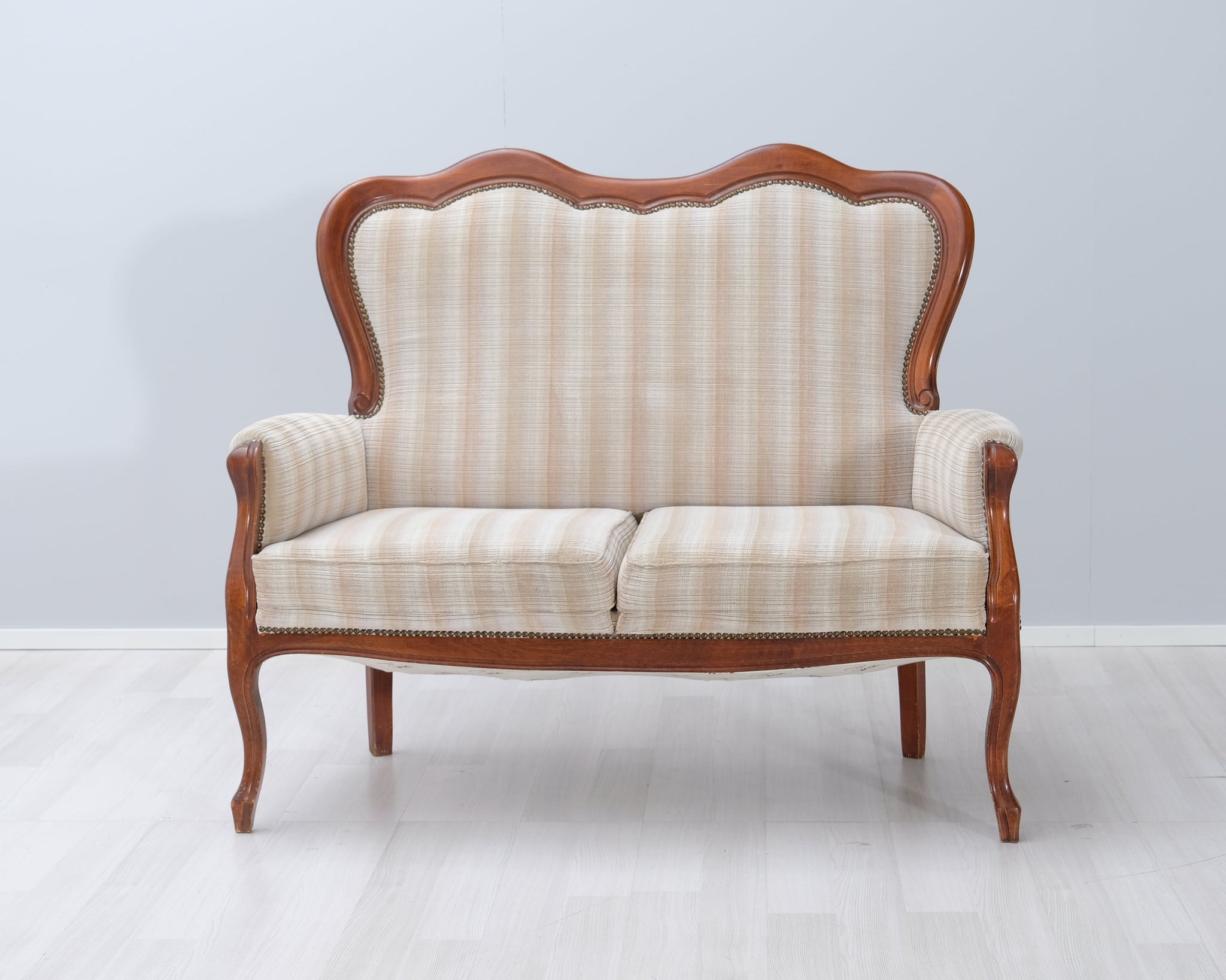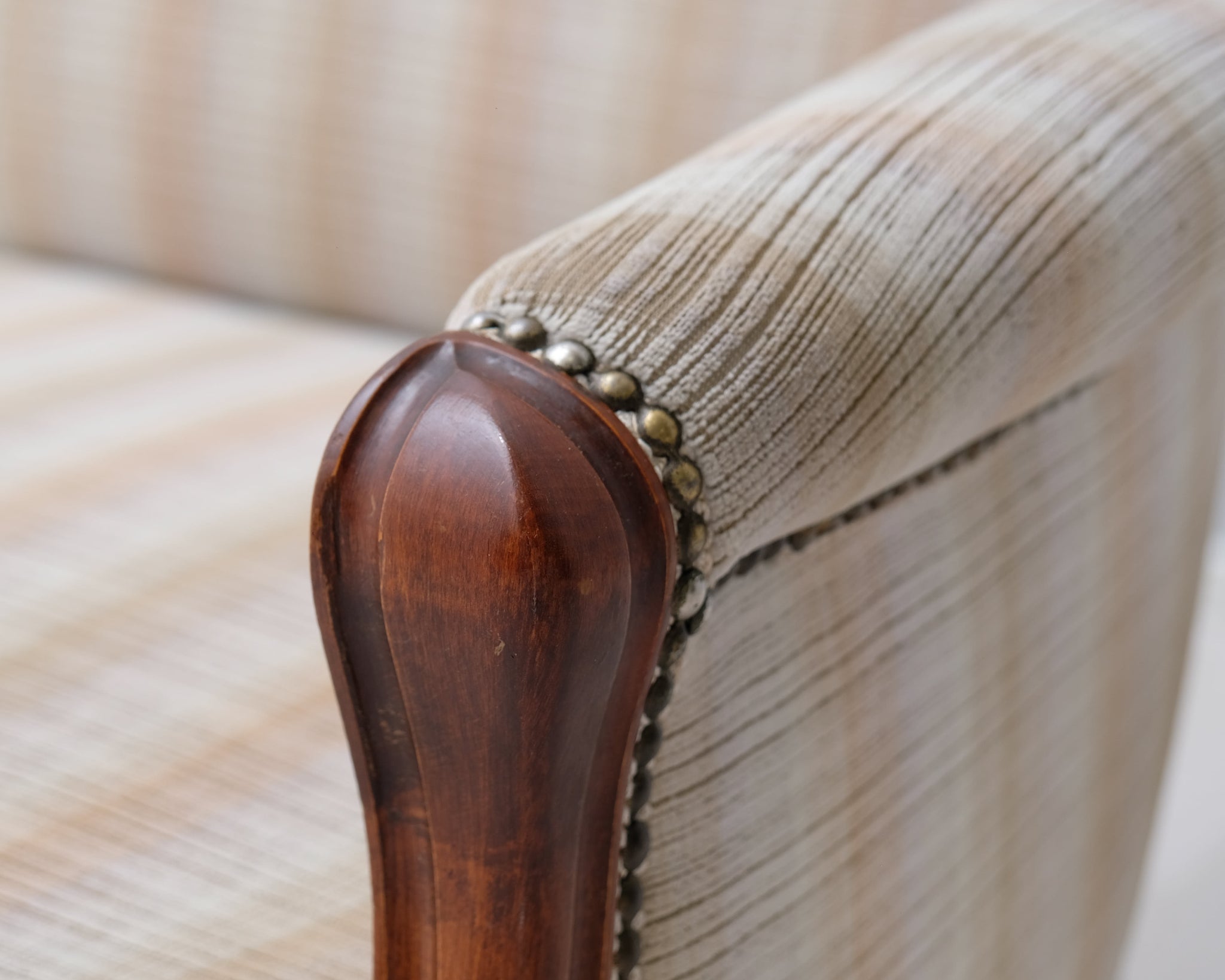 Kaunis, kahden istuttava rokokootyylinen nojatuoli. Raidallinen kangasverhoilu. Hiukan korkeampi malli, jossa mukava istua.