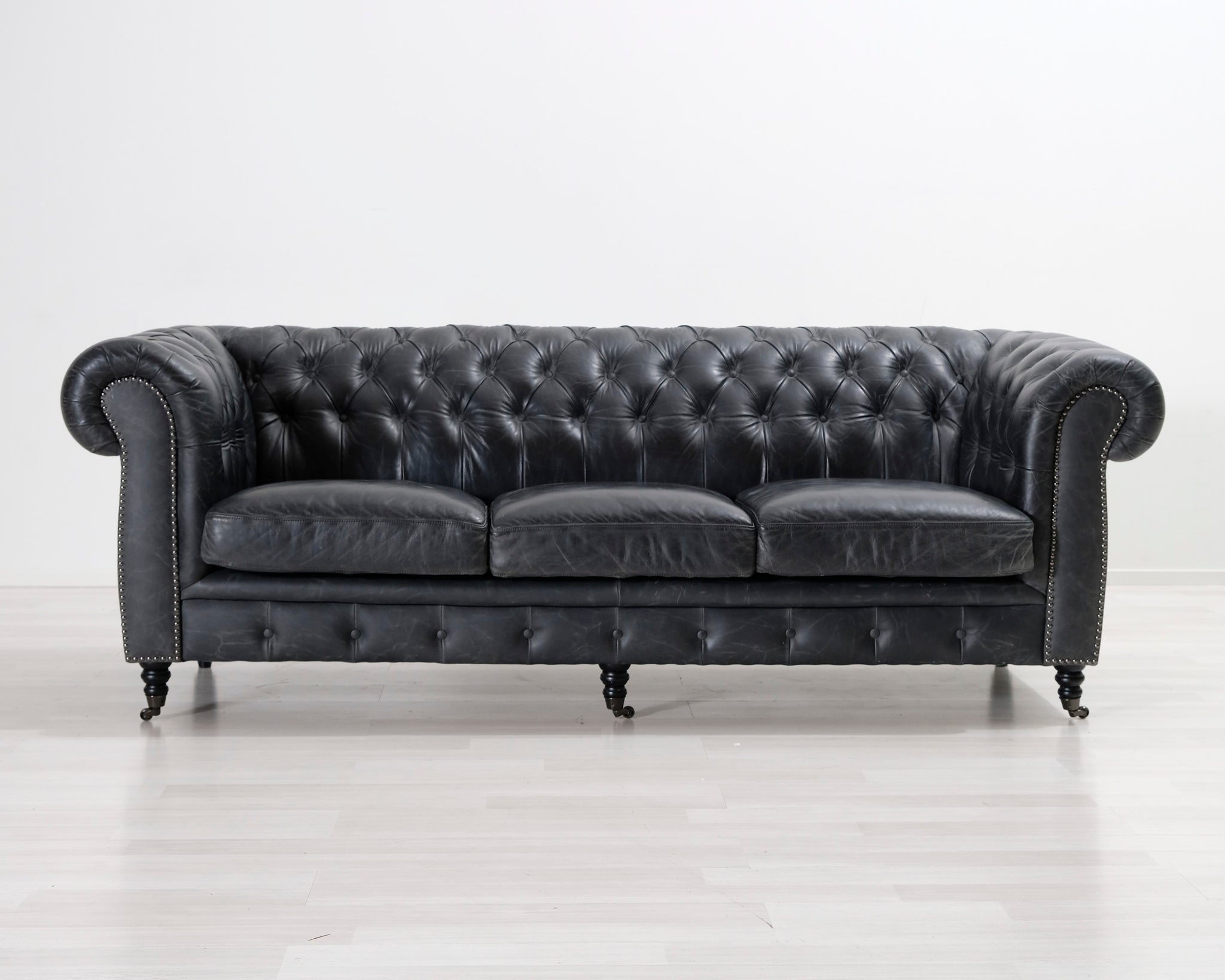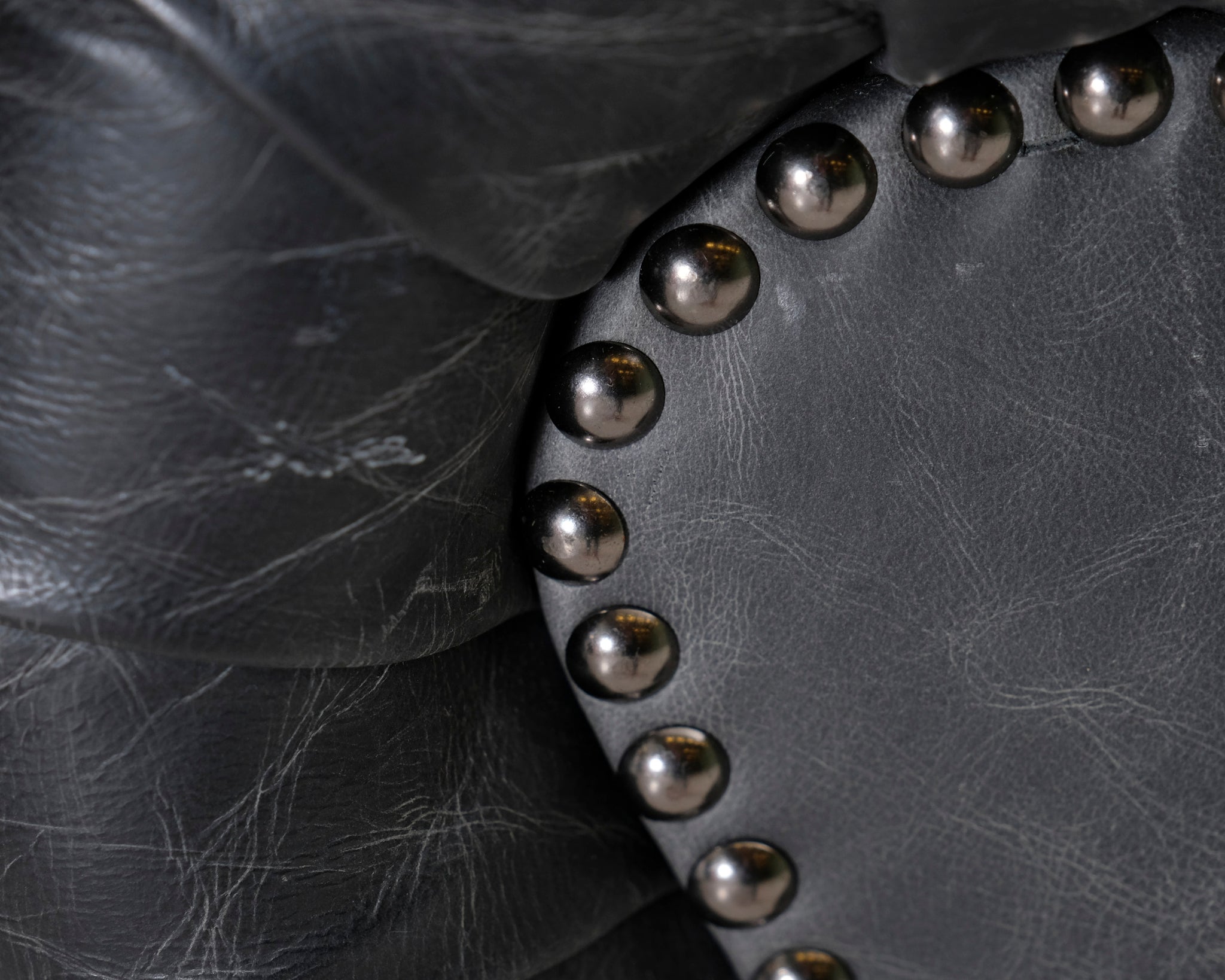 Pyöristetyt käsinojat, tikattu nahkapinta ja koristeniitit ovat tunnunsomaisia yksityiskohtia Chesterfield-tyylisissä sohvissa. Tämä sohva on kolmen istuttava ja verhoiltu harmaalla nahalla.