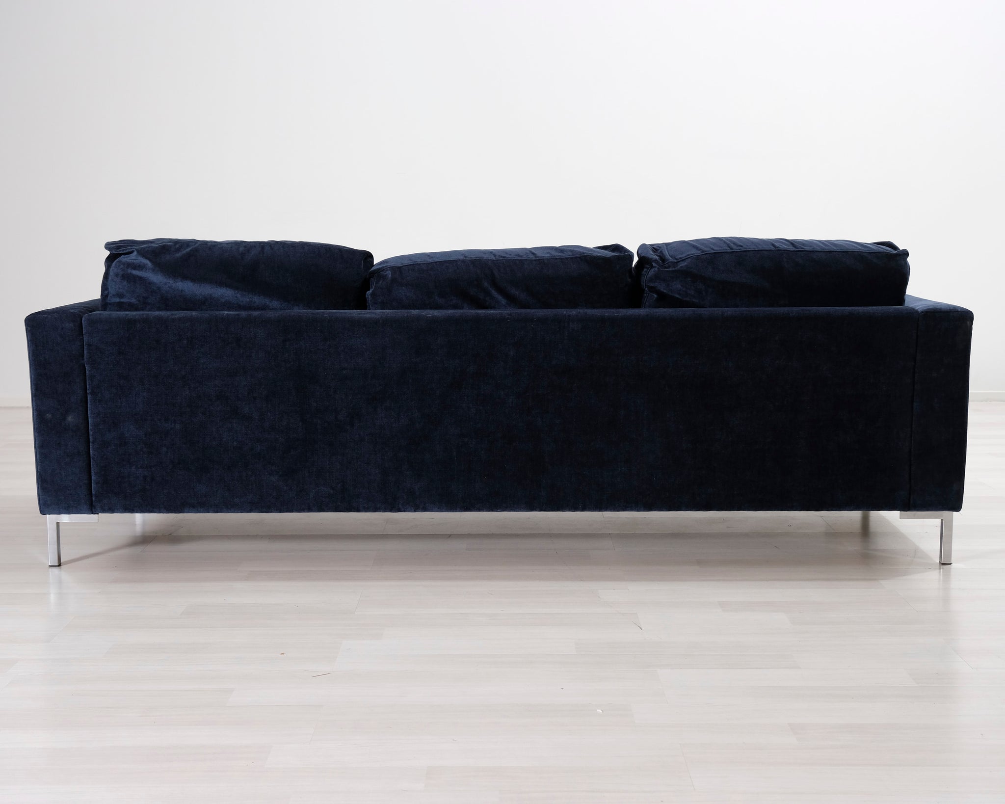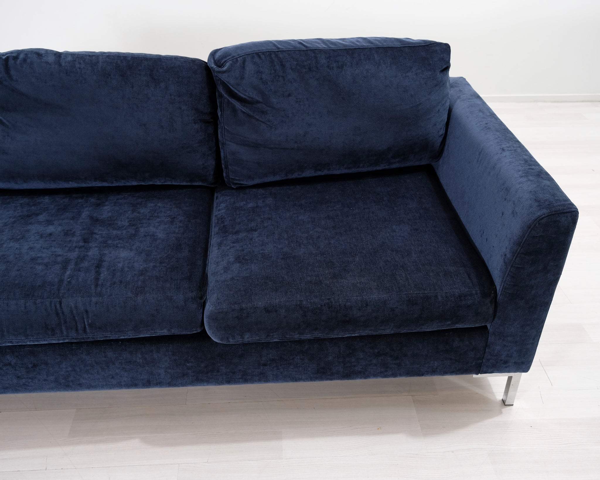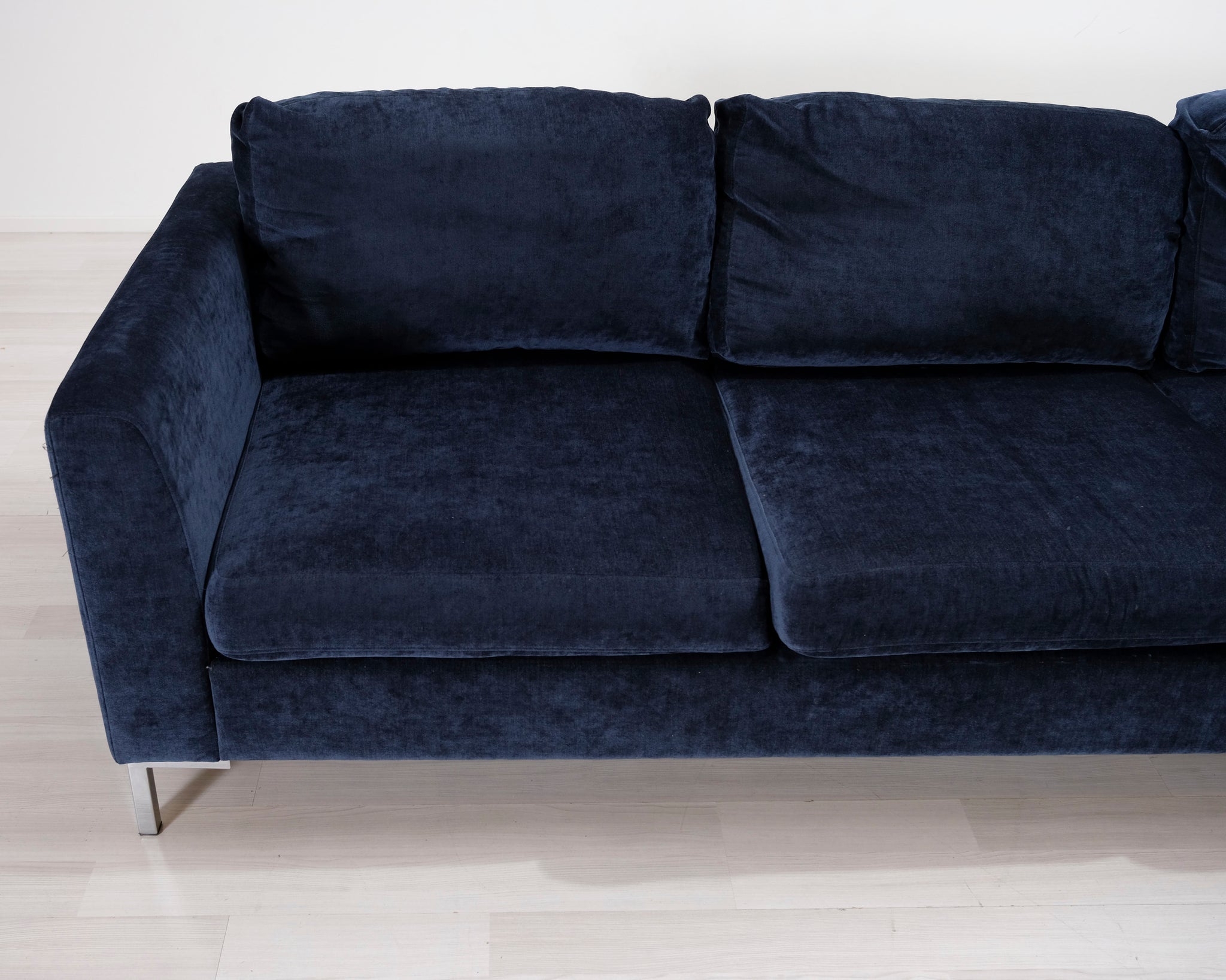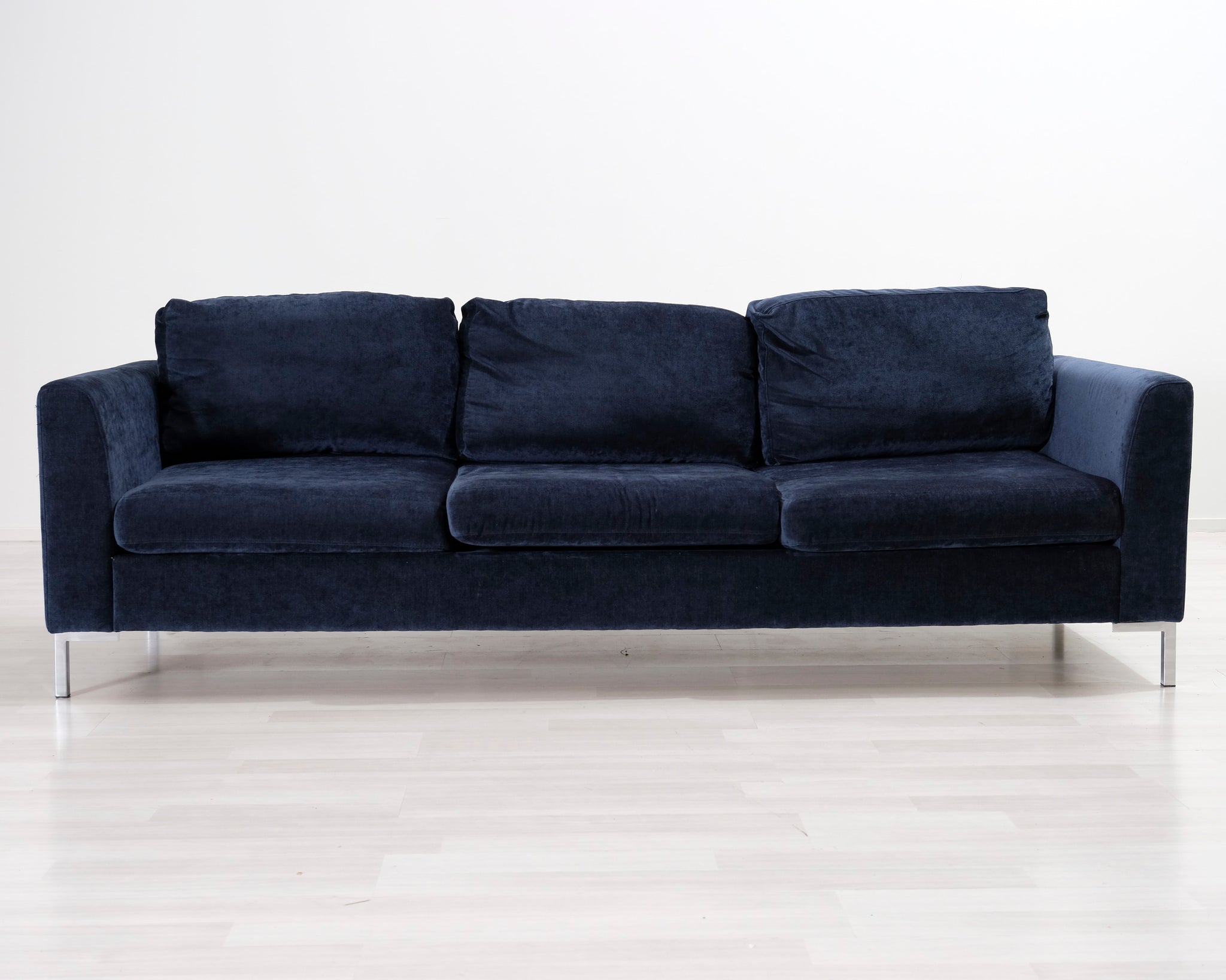 Tummansininen samettisohva kapeilla metallijaloilla. Kolmen istuttava.