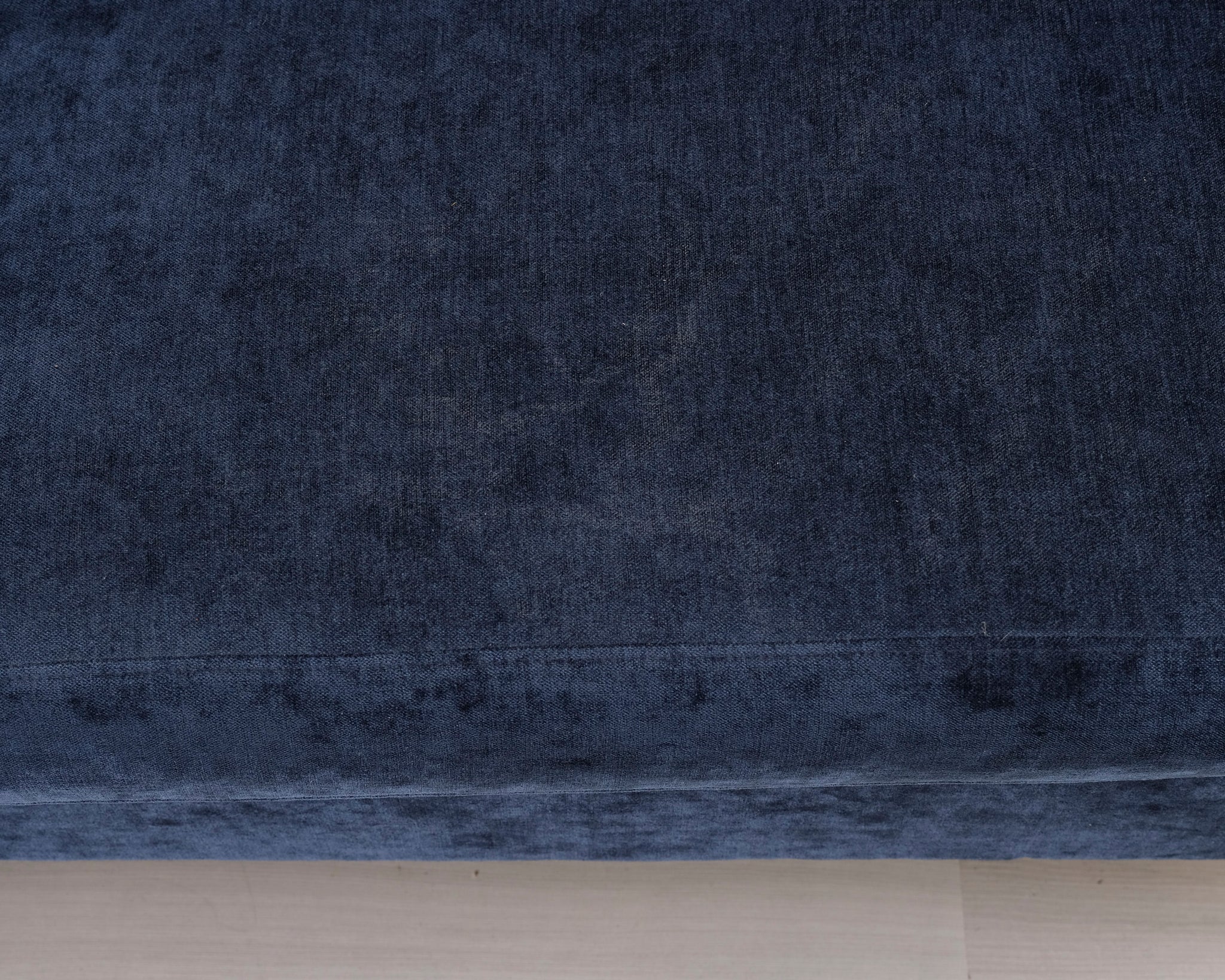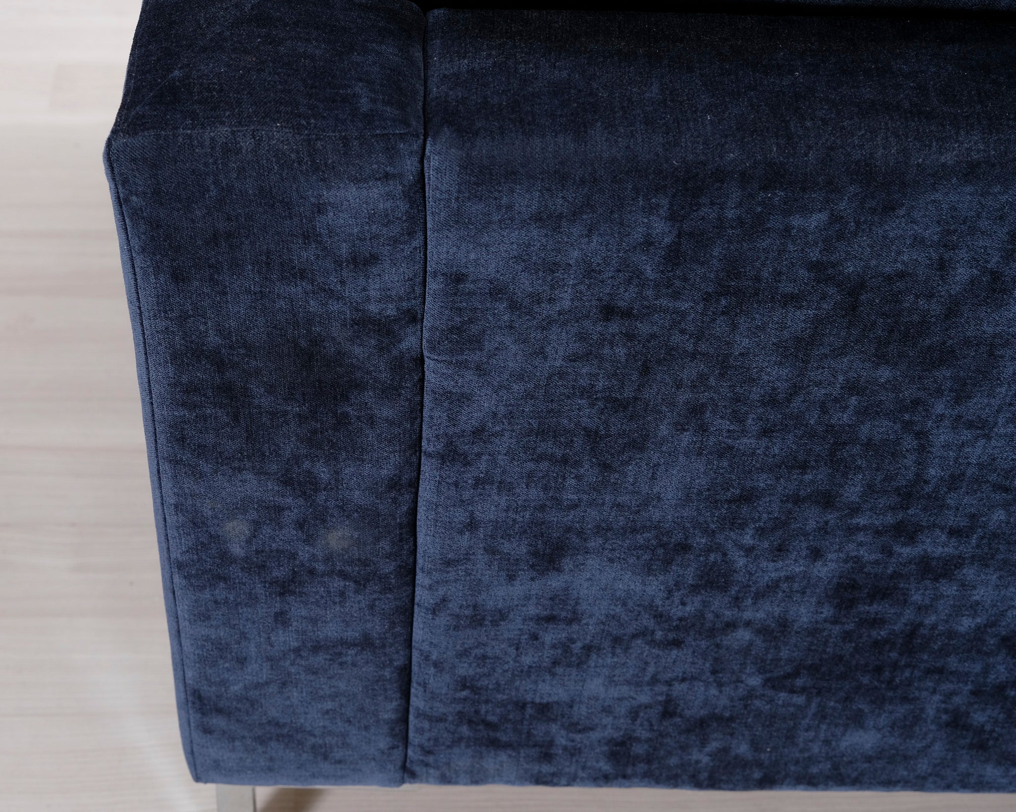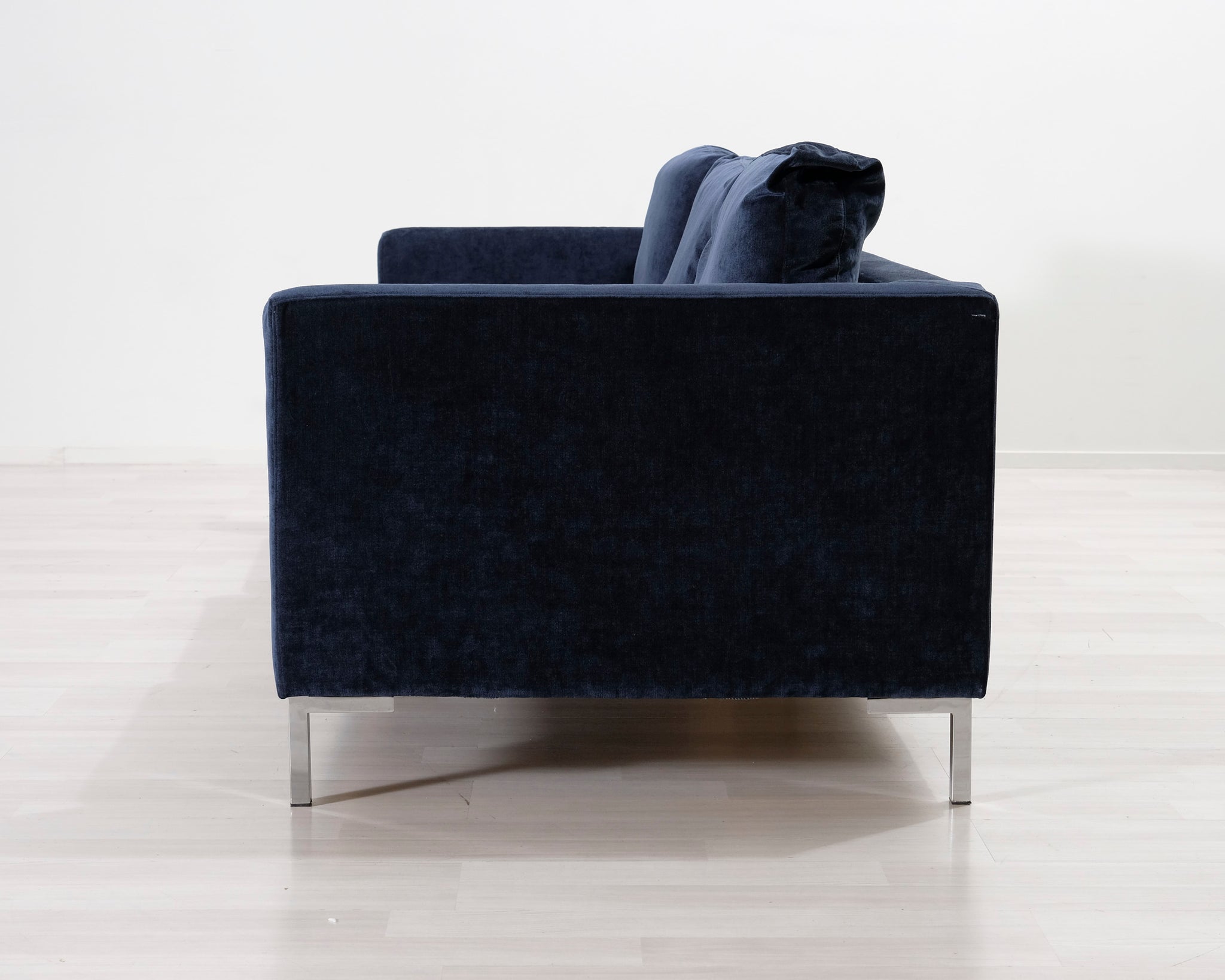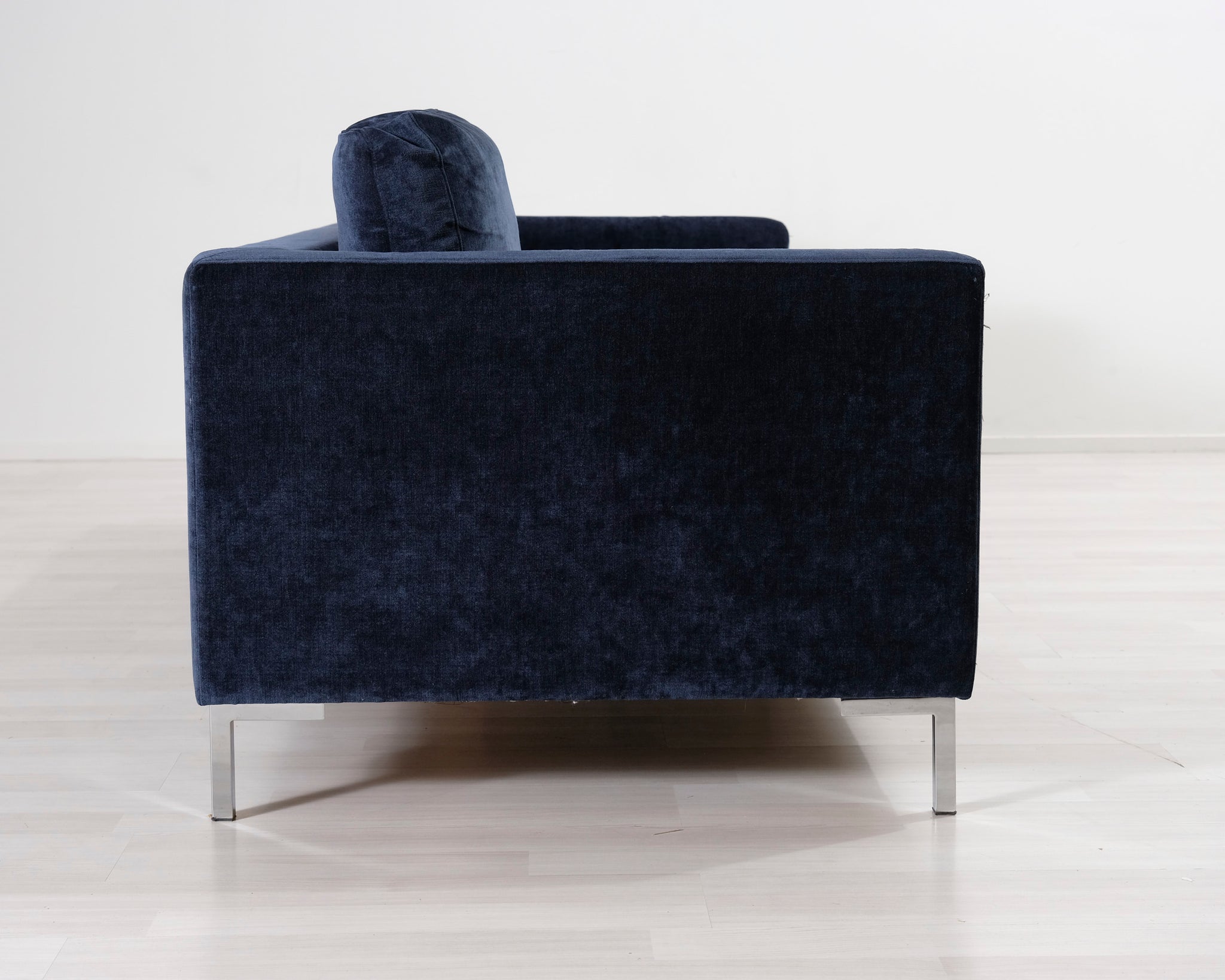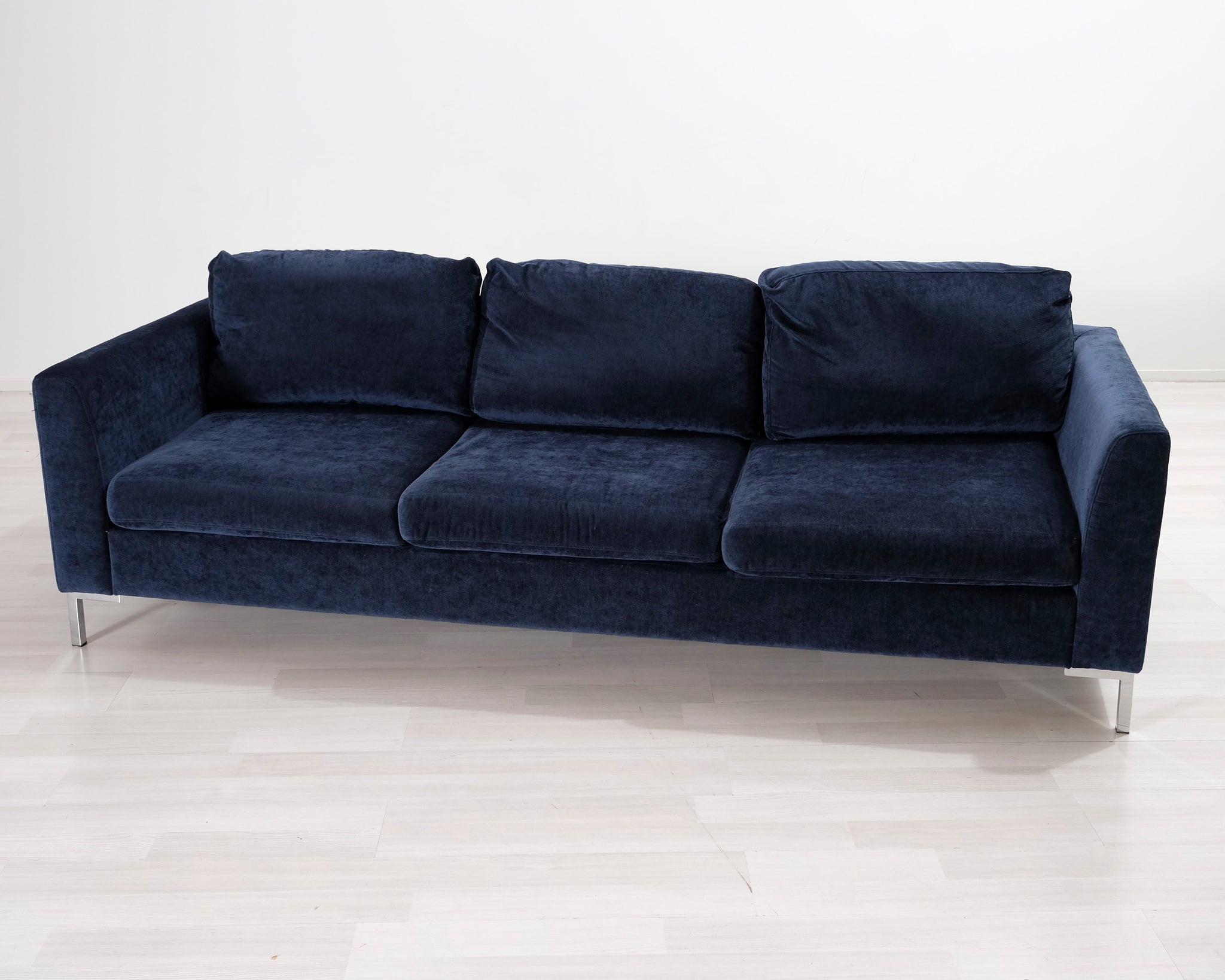 Tummansininen samettisohva kapeilla metallijaloilla. Kolmen istuttava.