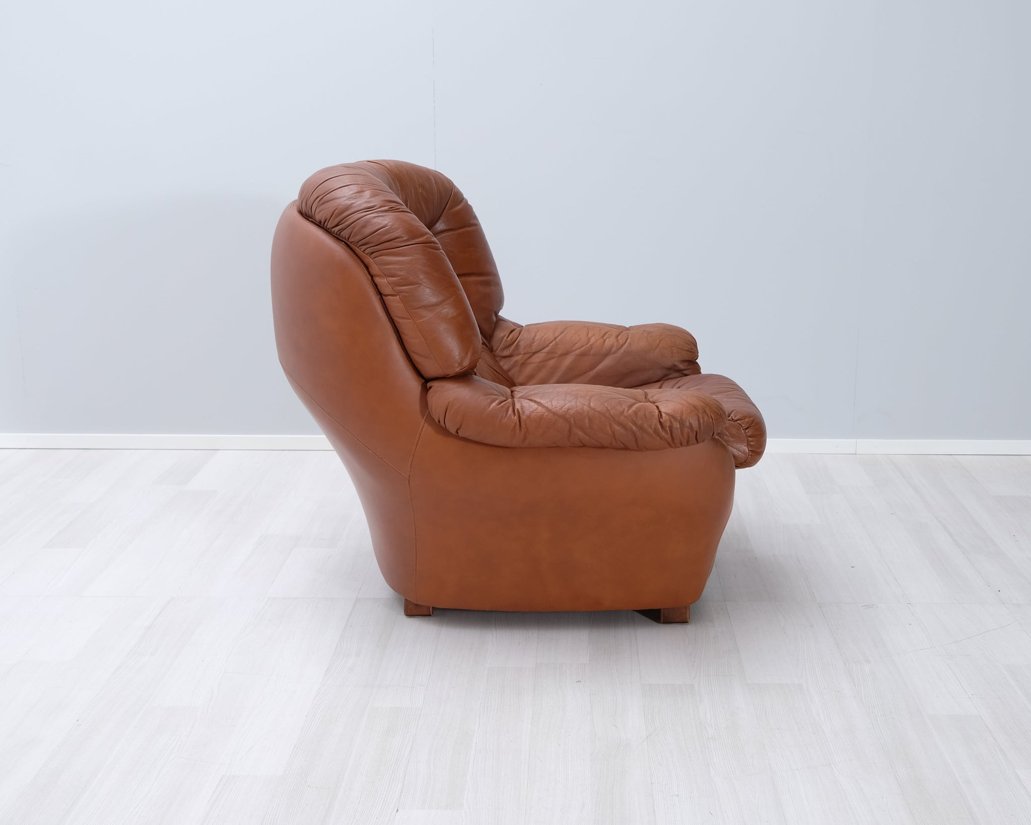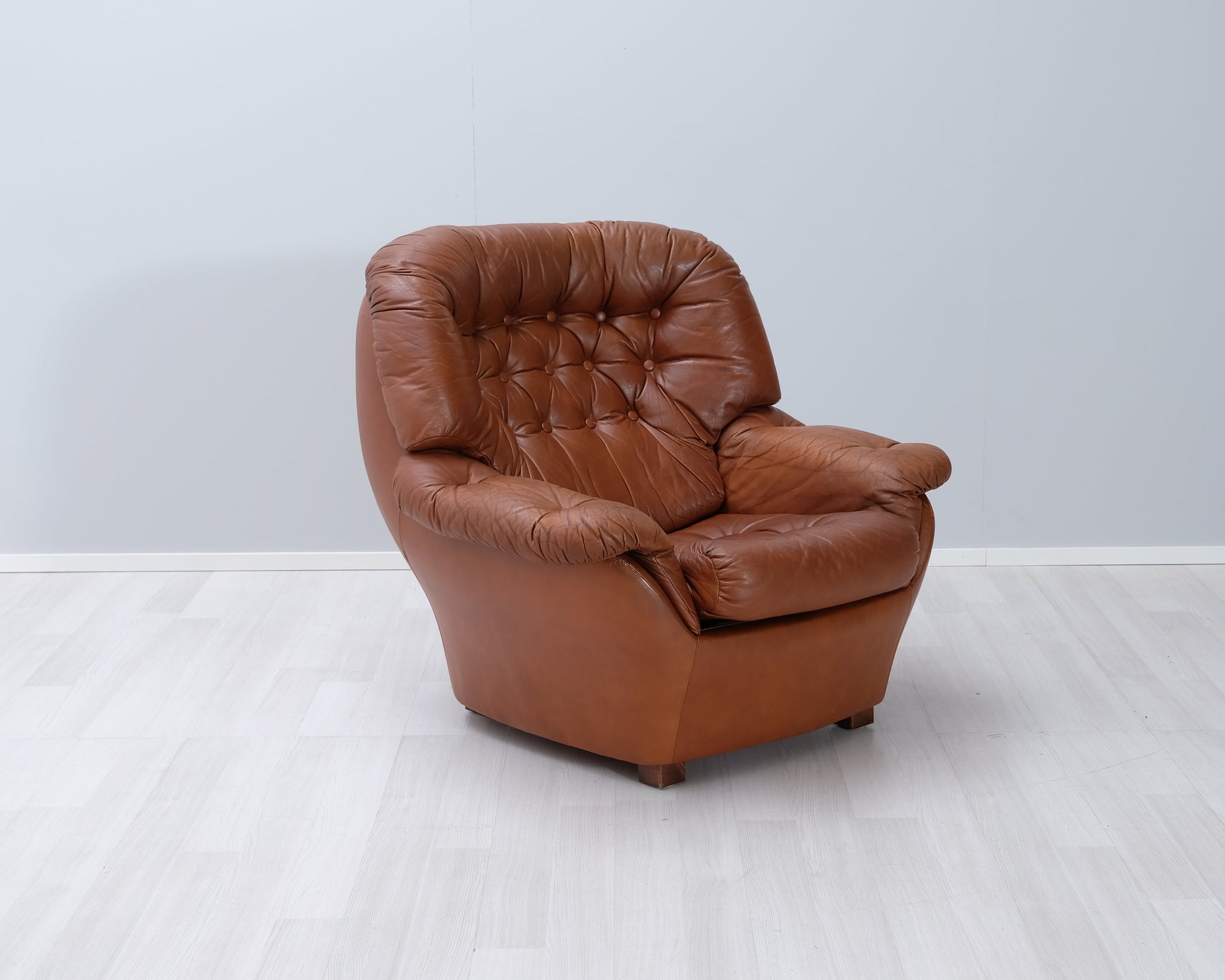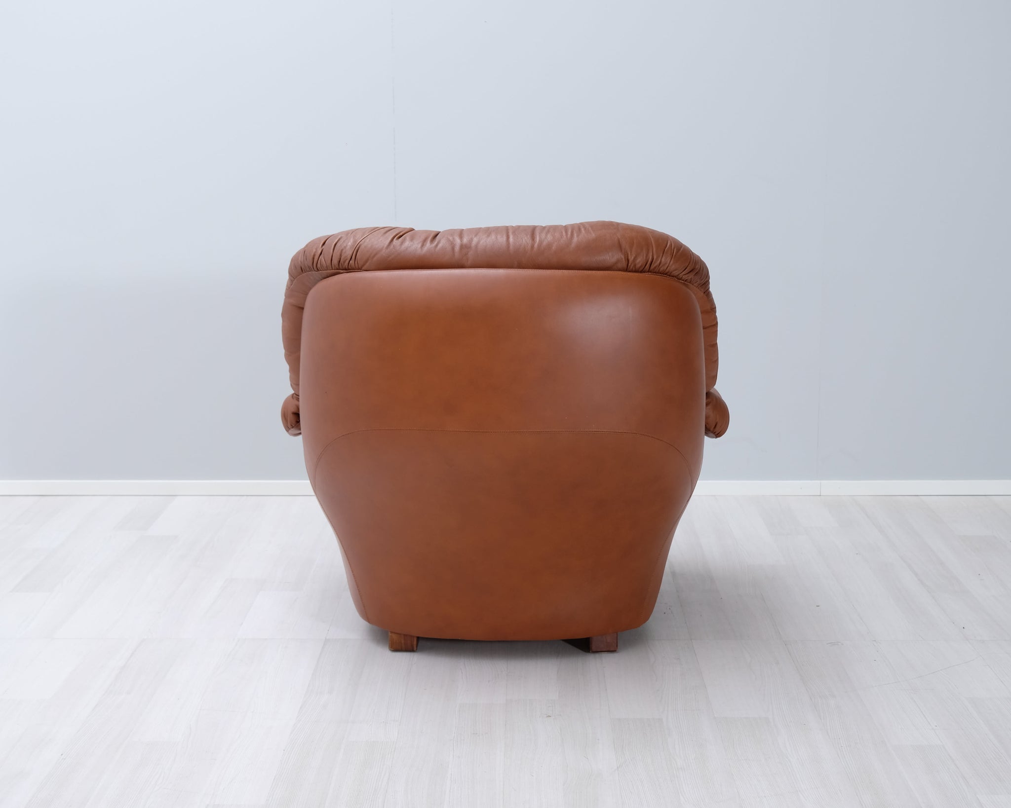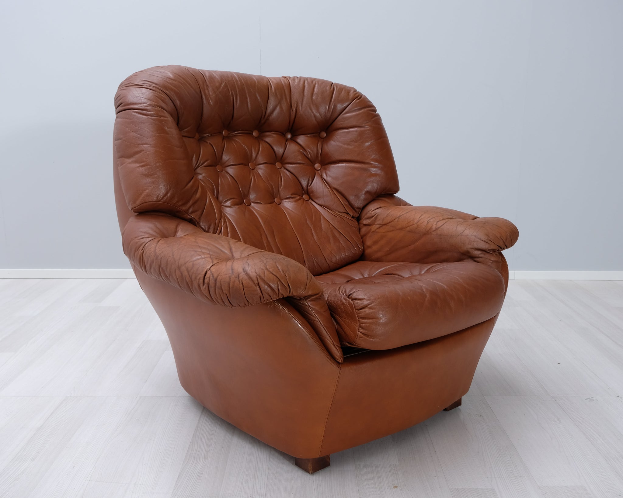 Kotimaisen Kuusilinnan valmistama ruskea nahkanojatuoli. Laadukas materiaali.