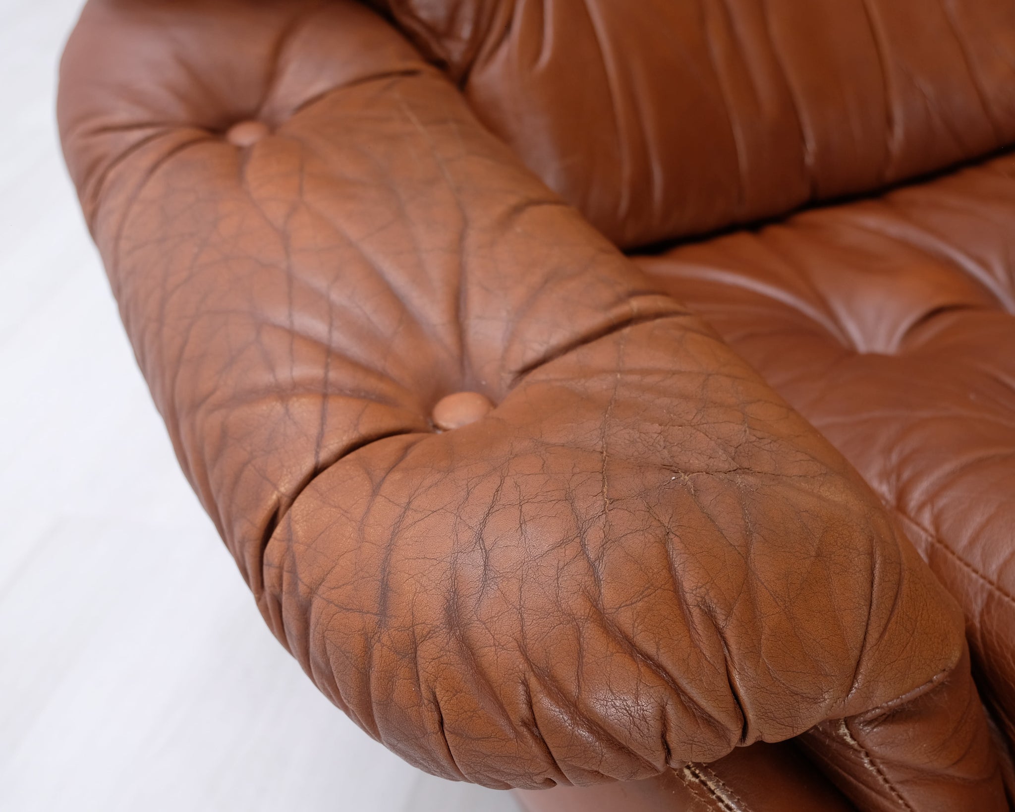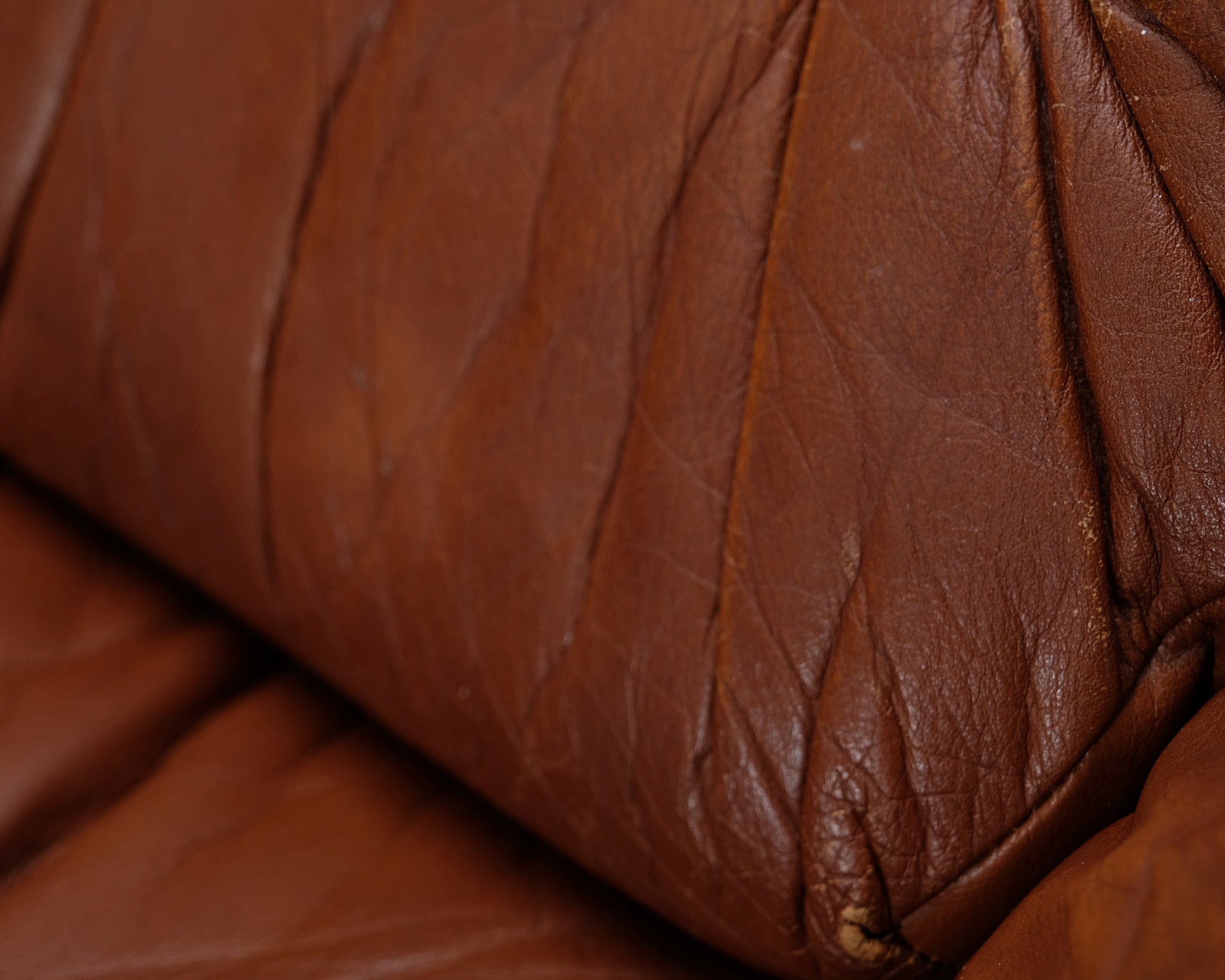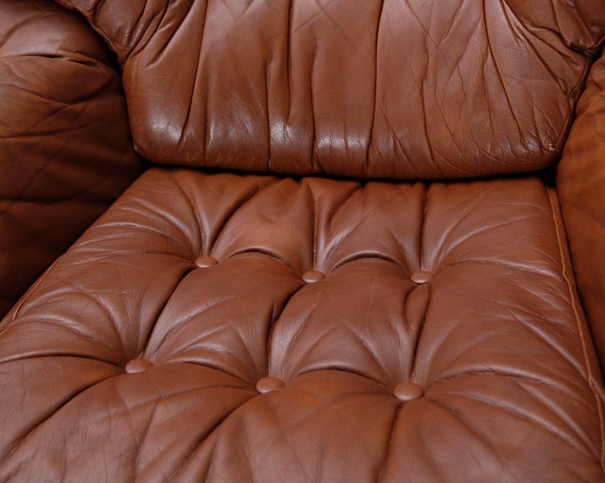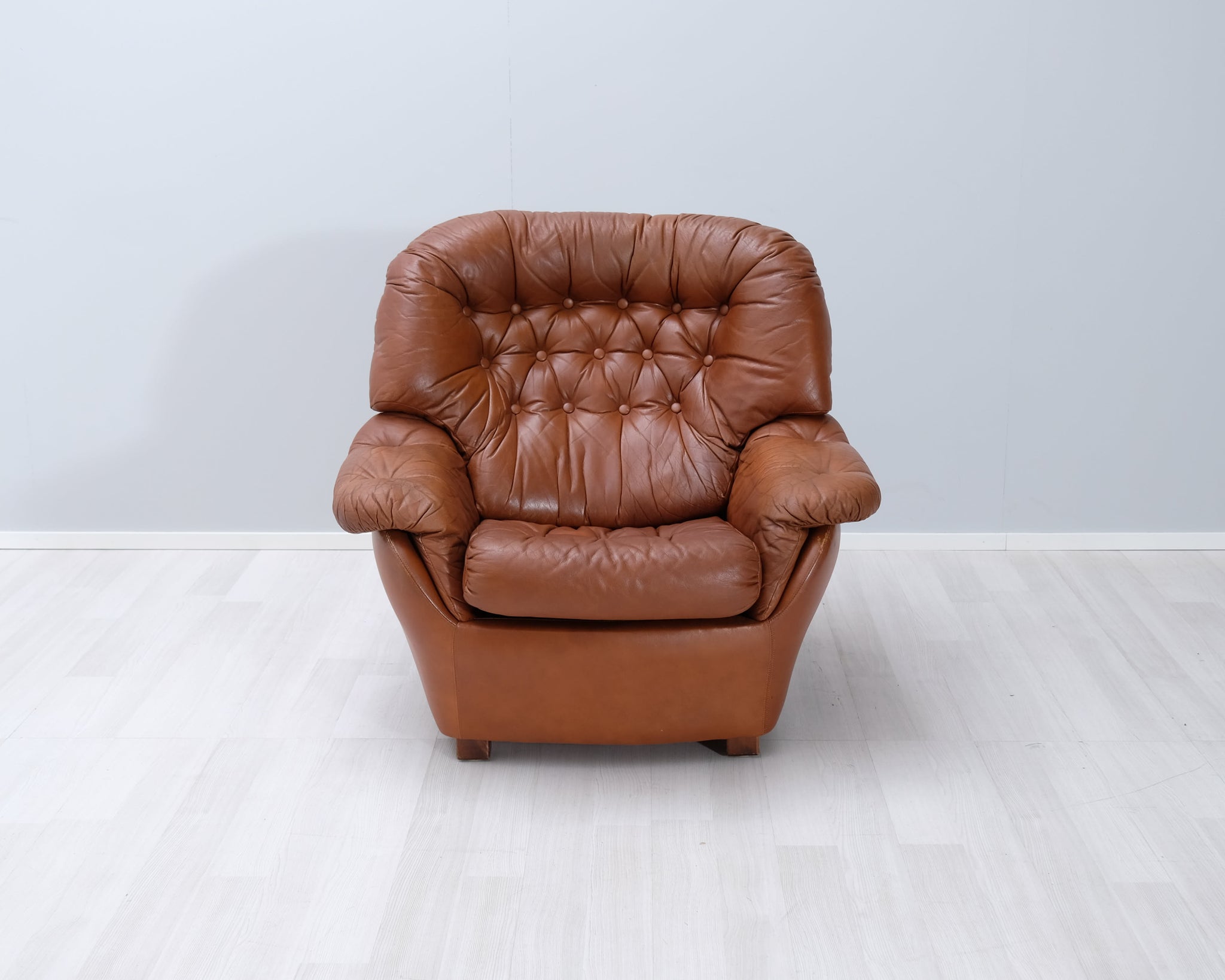 Kotimaisen Kuusilinnan valmistama ruskea nahkanojatuoli. Laadukas materiaali.
