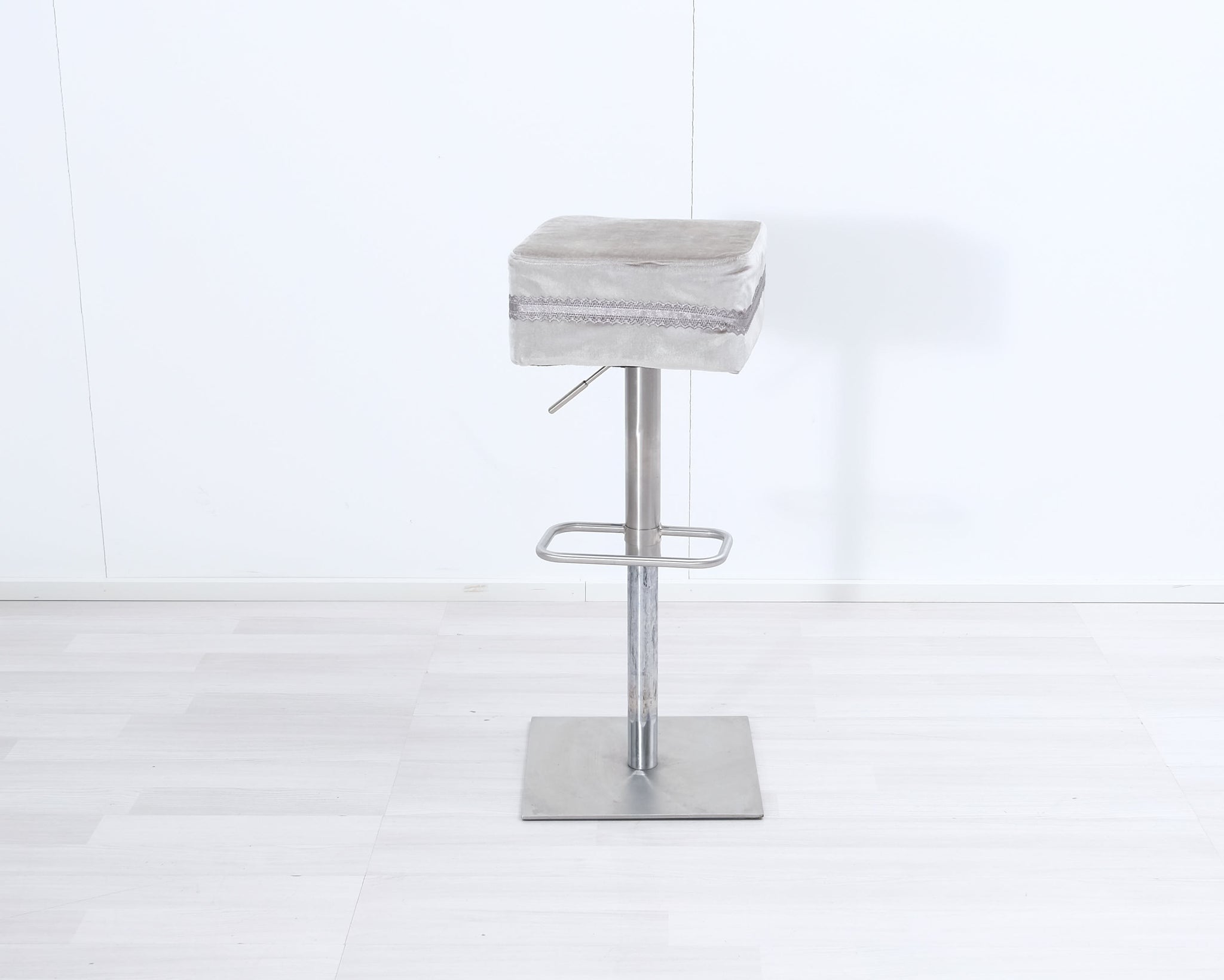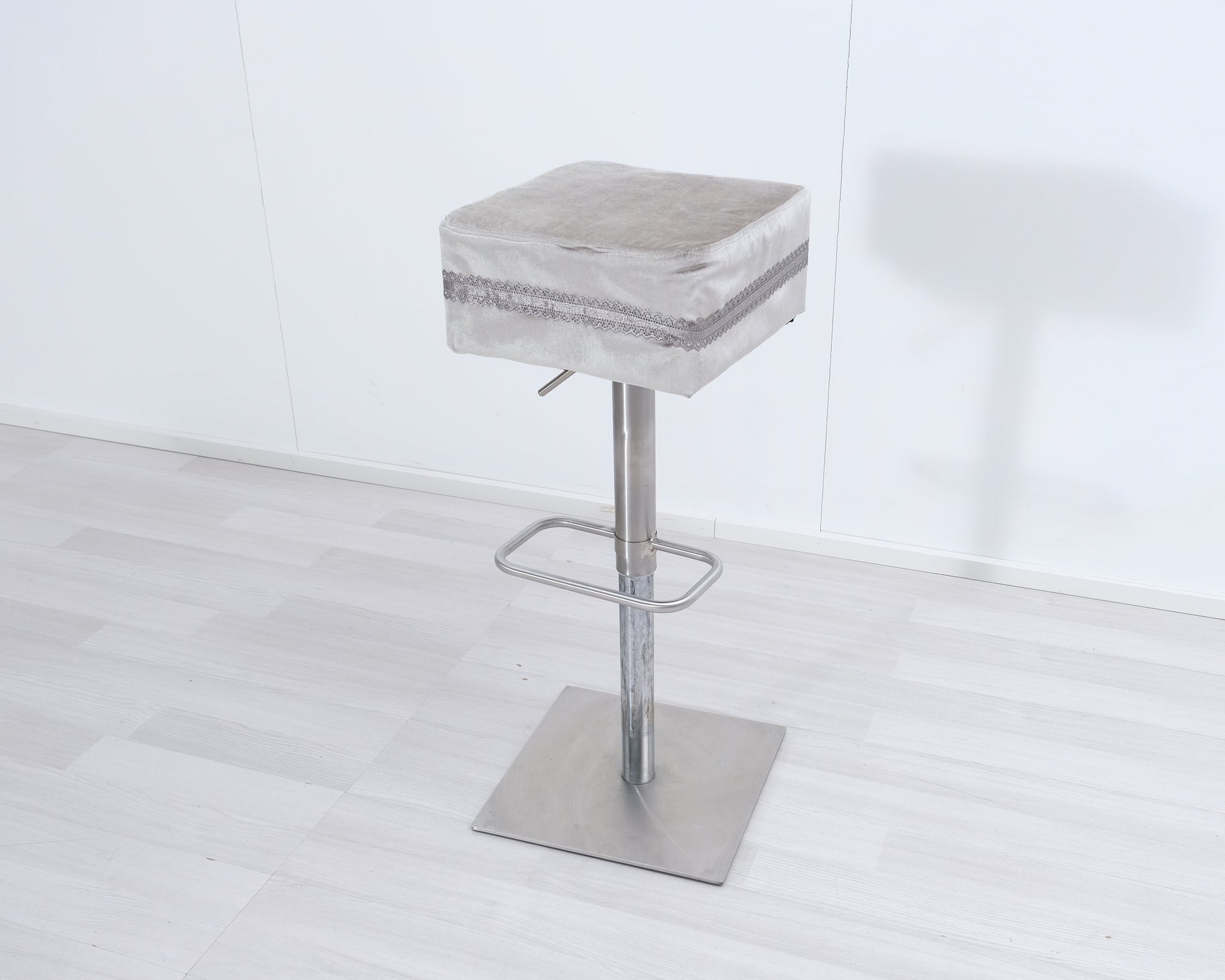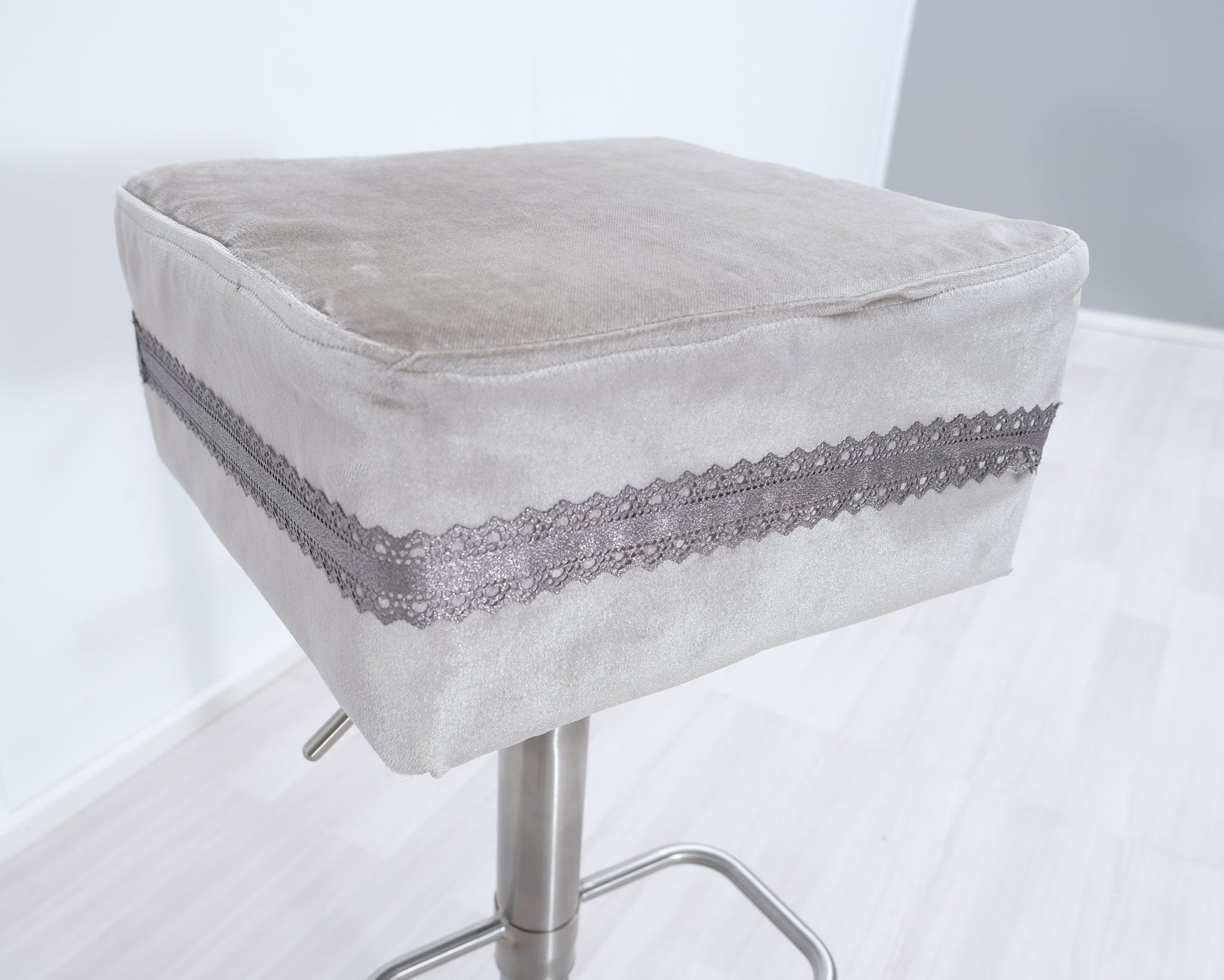 Baarituolit likaa hylkivällä verhoilukankaalla. Koristeena tuolia kiertävä pitsireunus. Yhdellä reunalla koristekristallinappi. Säädettävä istuinkorkeus 60 - 90 cm.