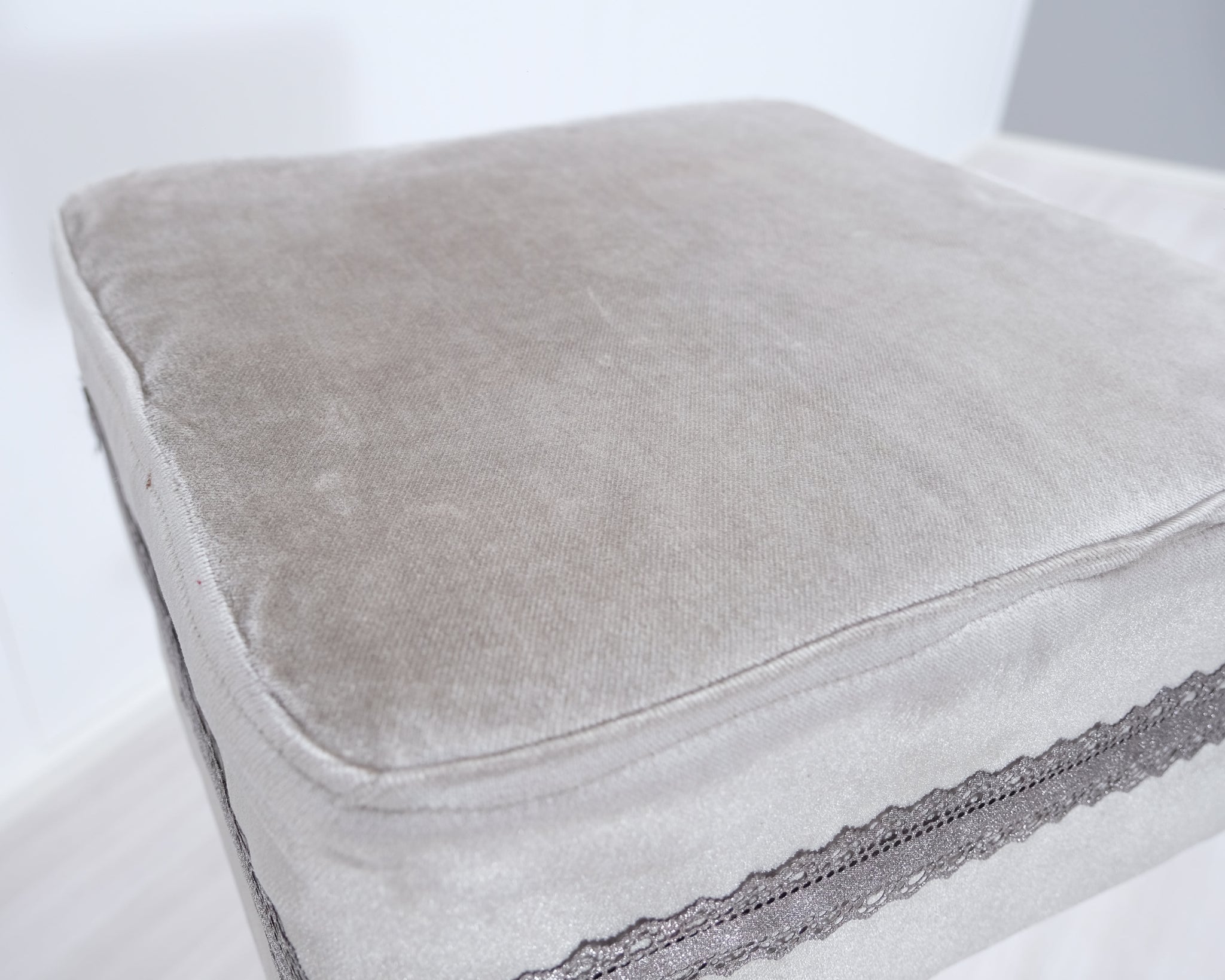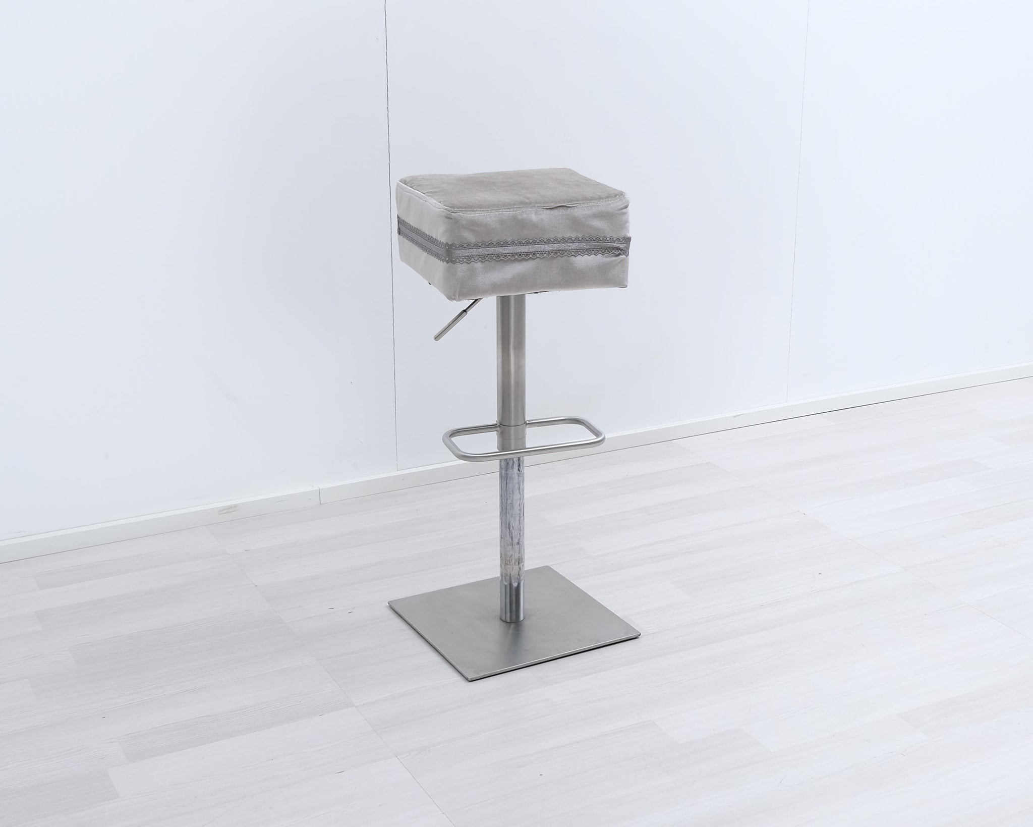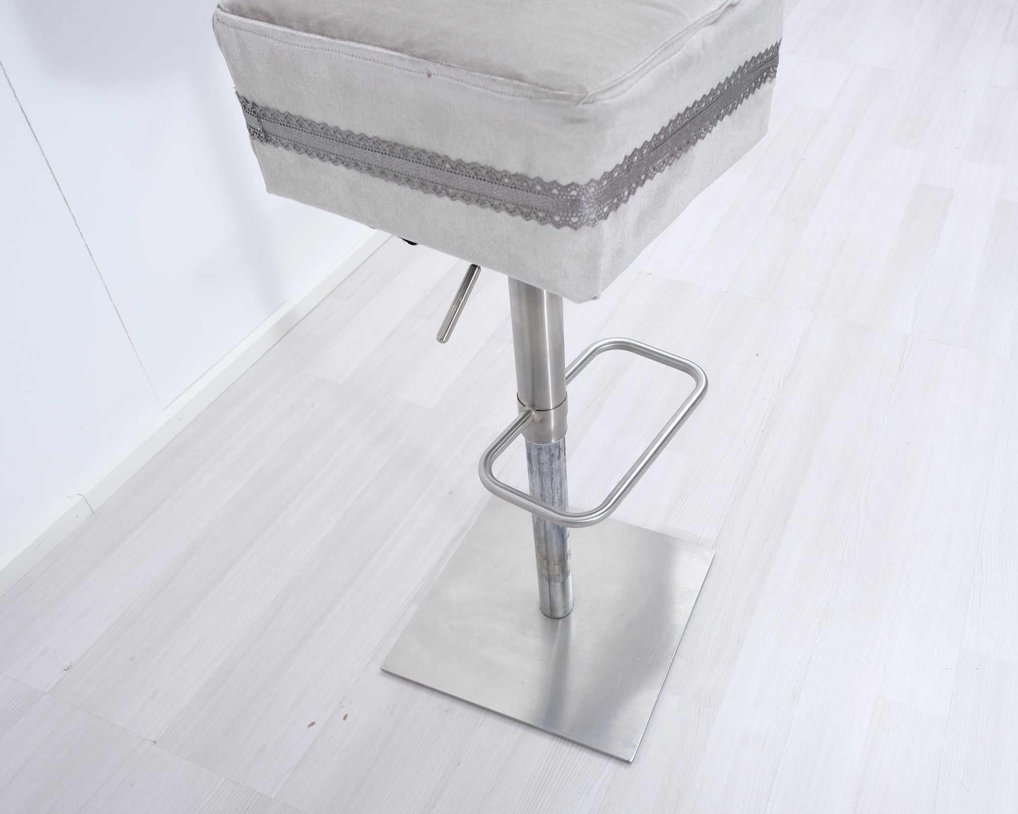 Baarituolit likaa hylkivällä verhoilukankaalla. Koristeena tuolia kiertävä pitsireunus. Yhdellä reunalla koristekristallinappi. Säädettävä istuinkorkeus 60 - 90 cm.