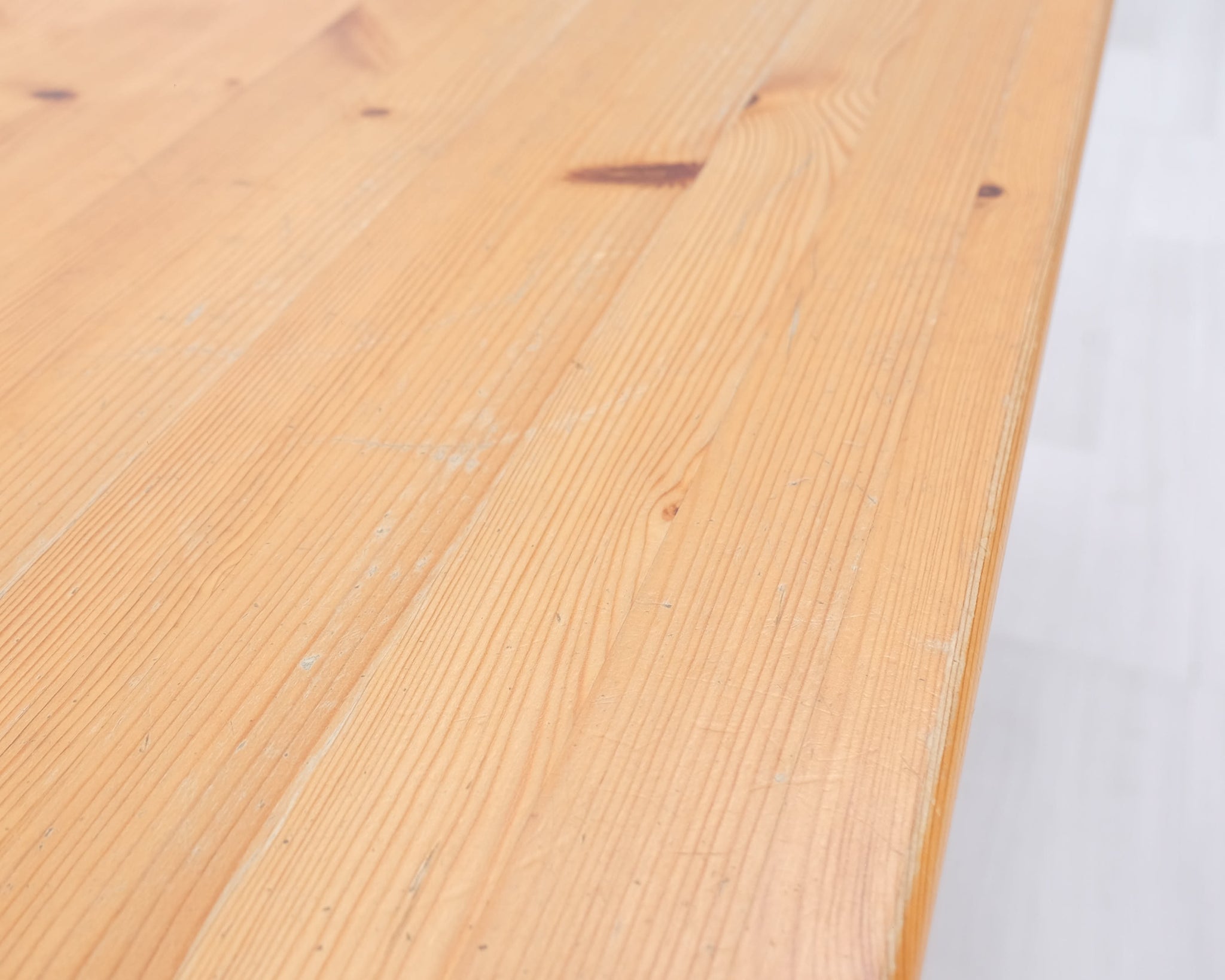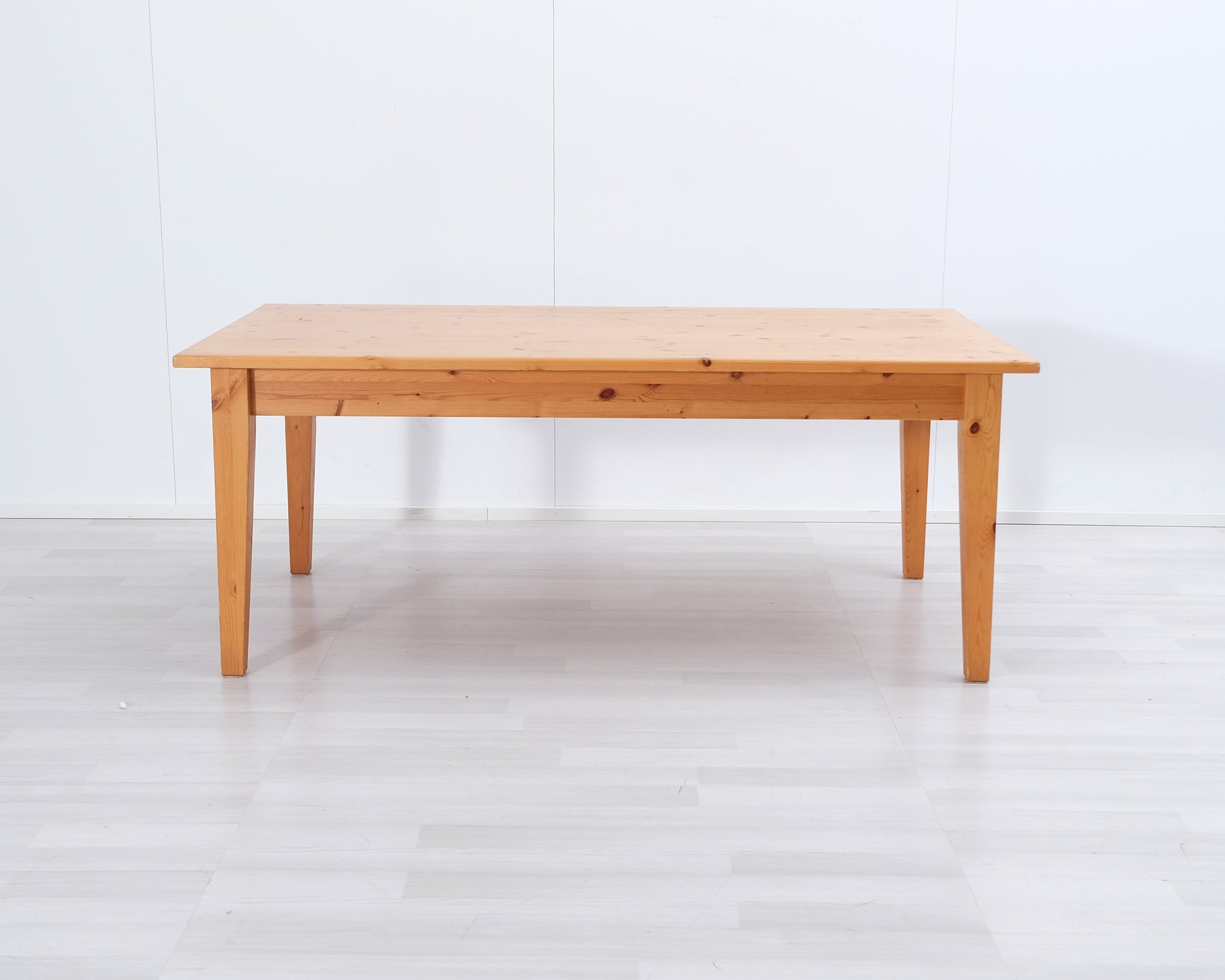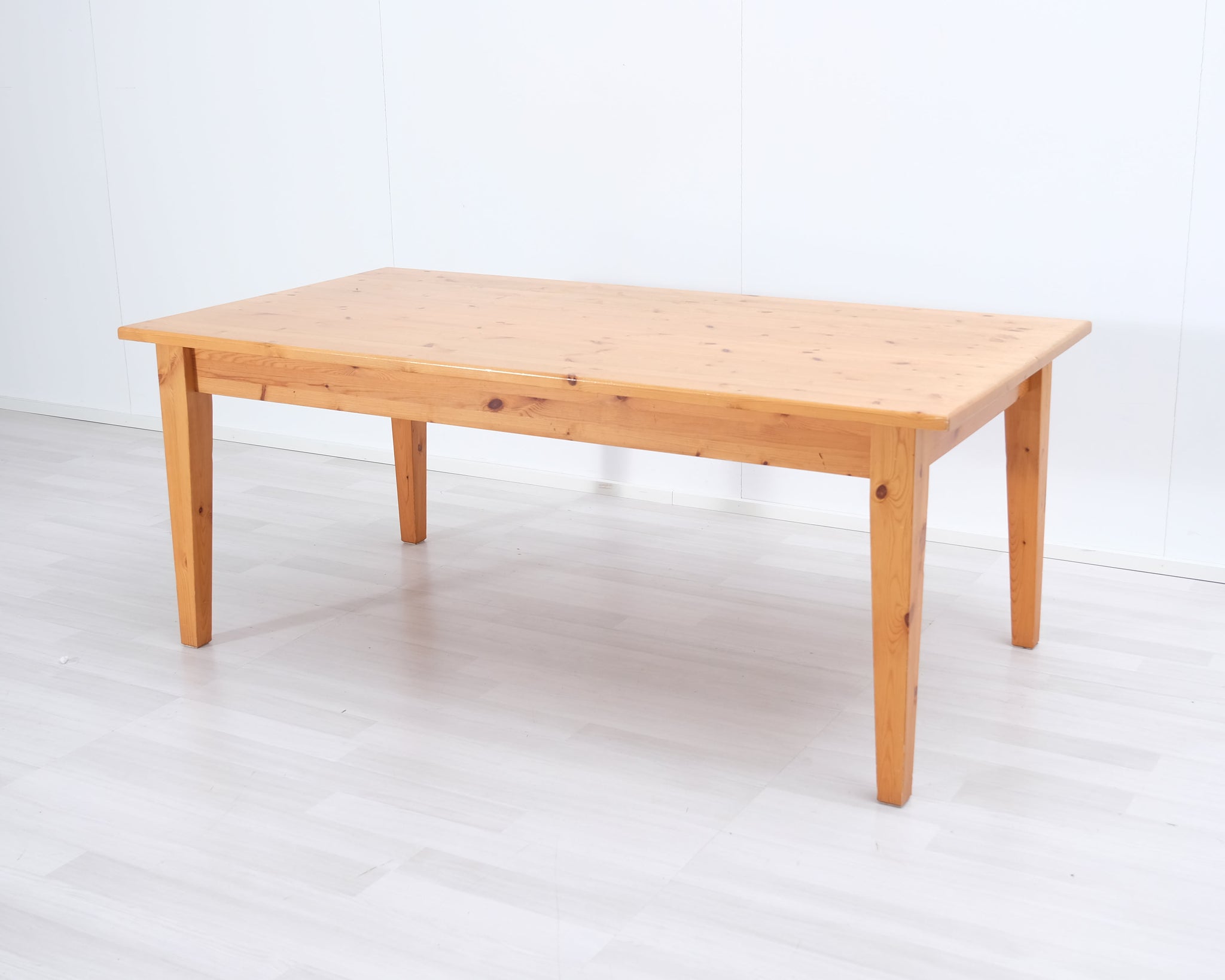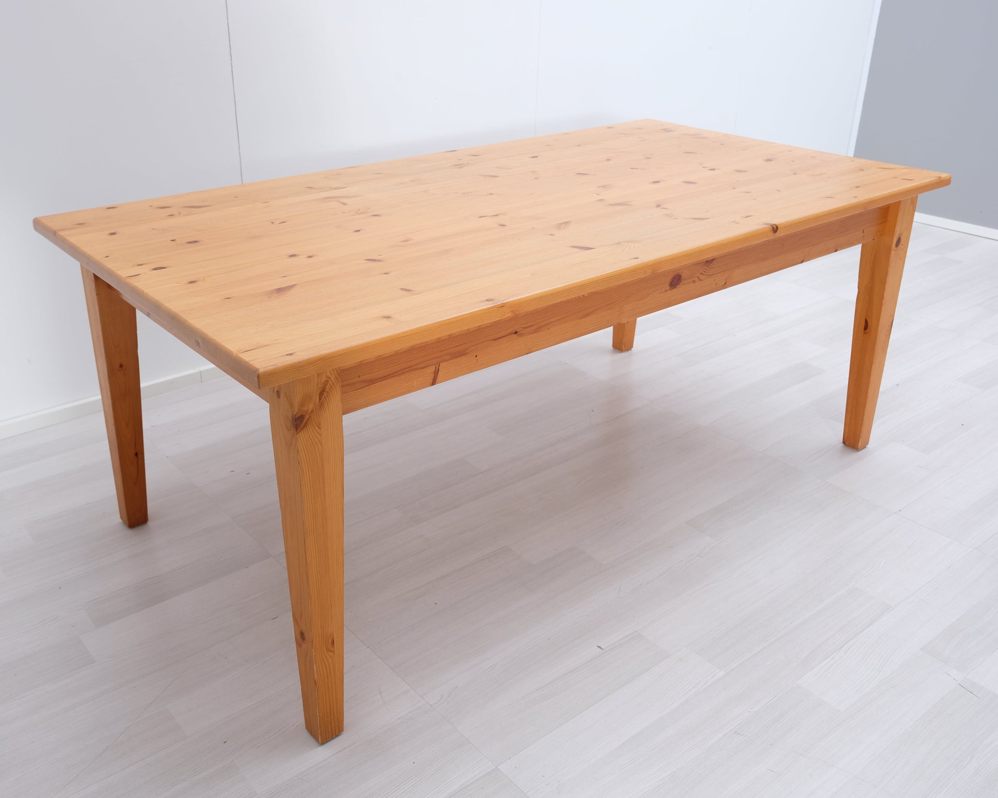 Massiivipuusta valmistettu tukeva ruokapöytä, jossa kaksi vetolaatikkoa.