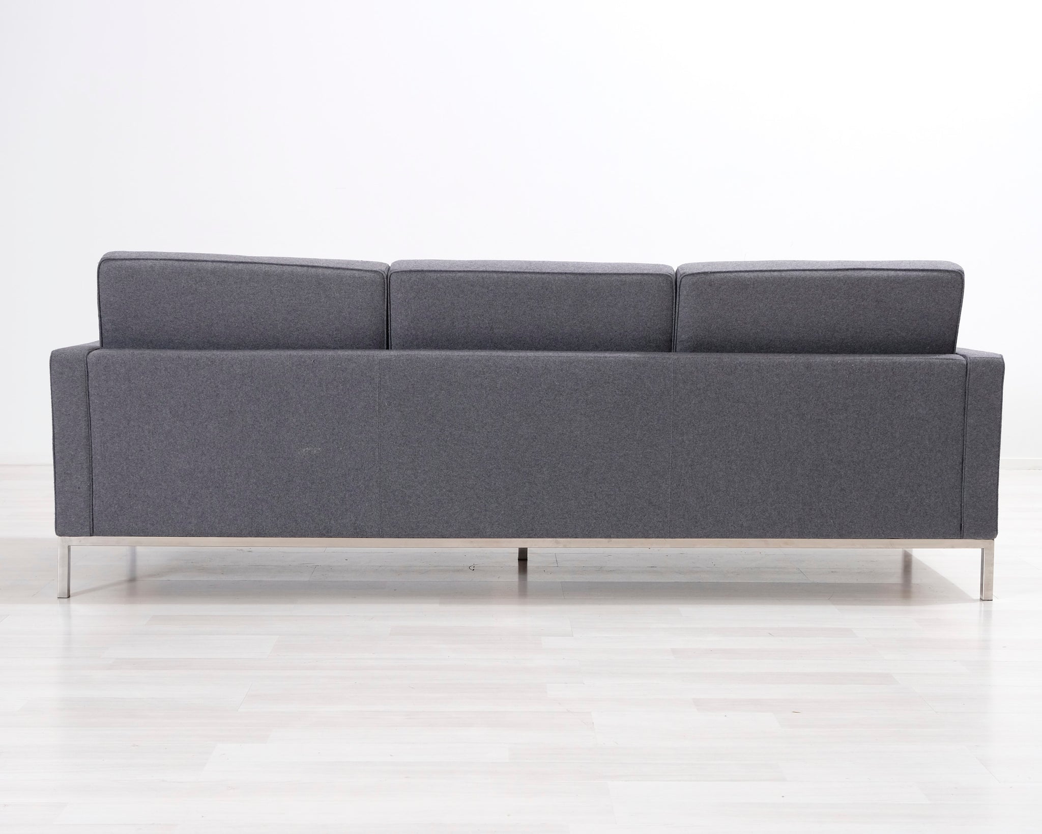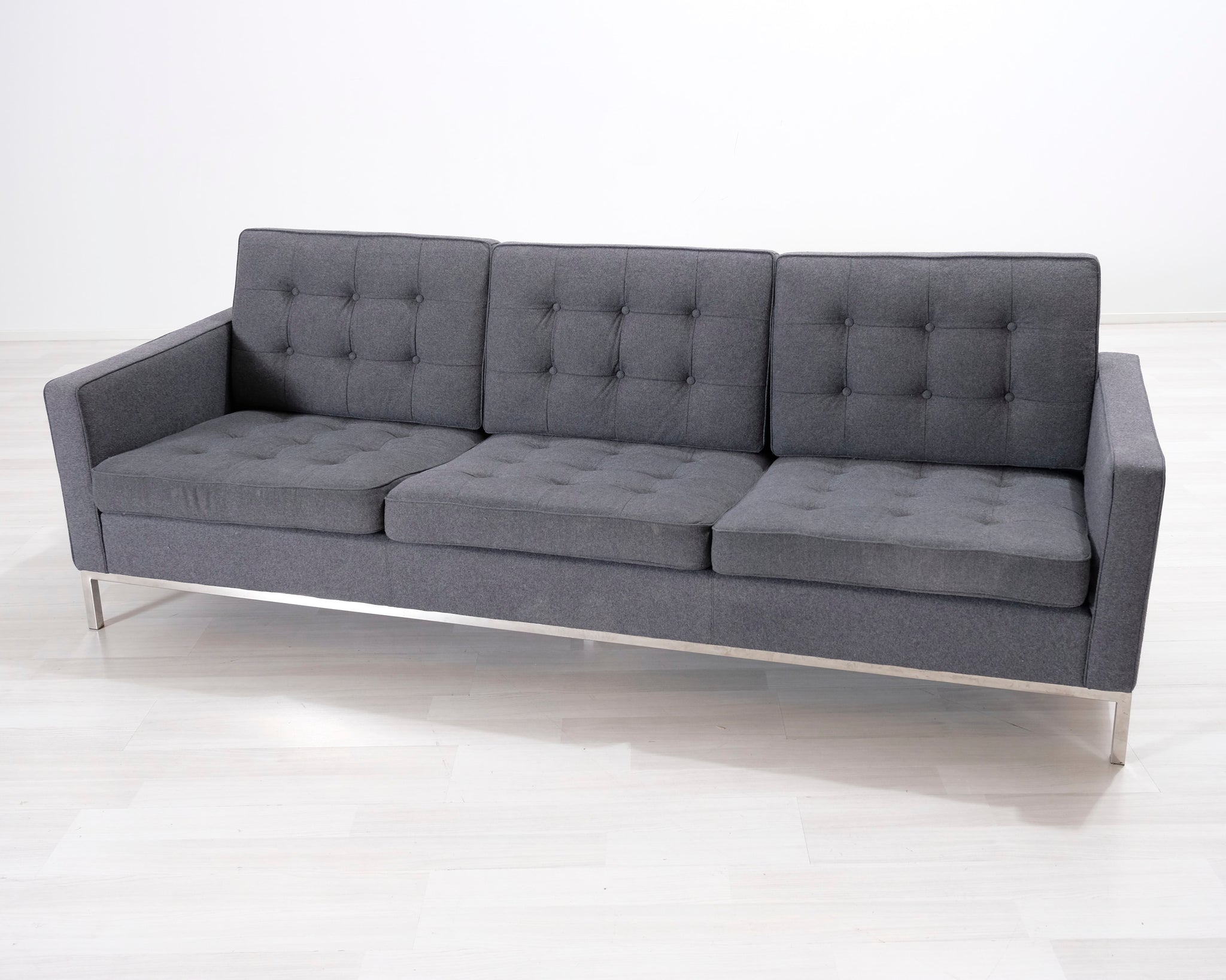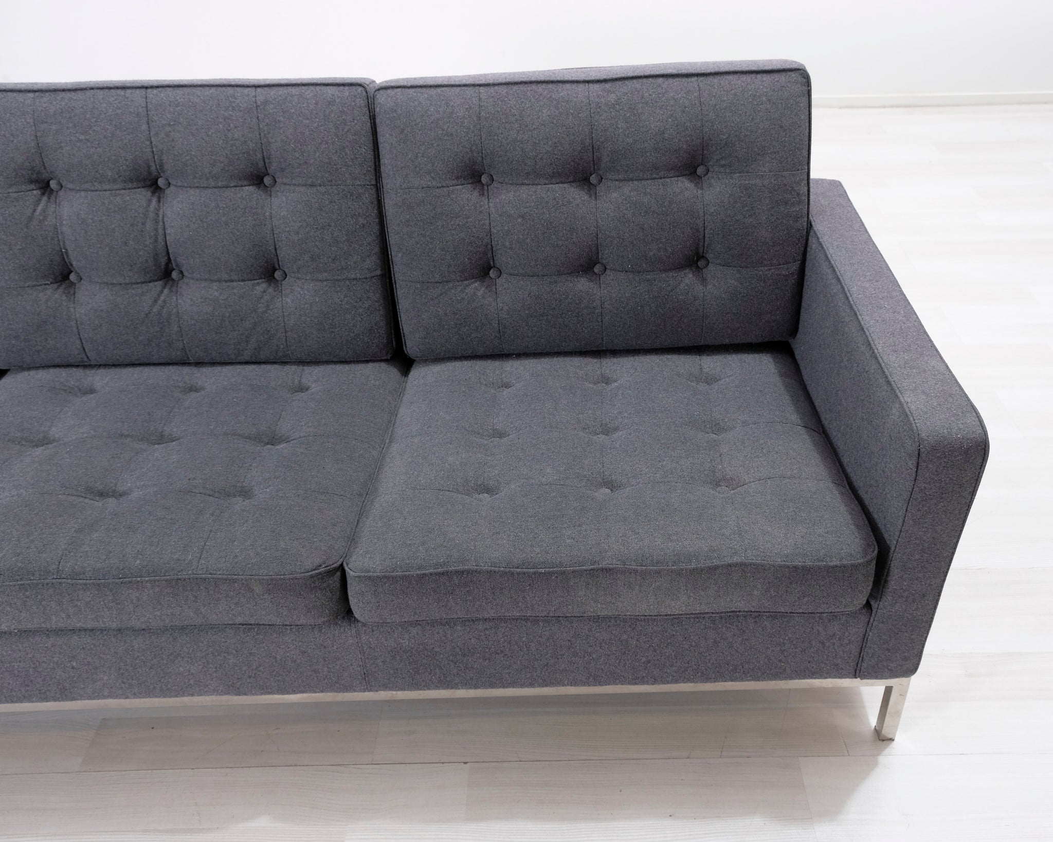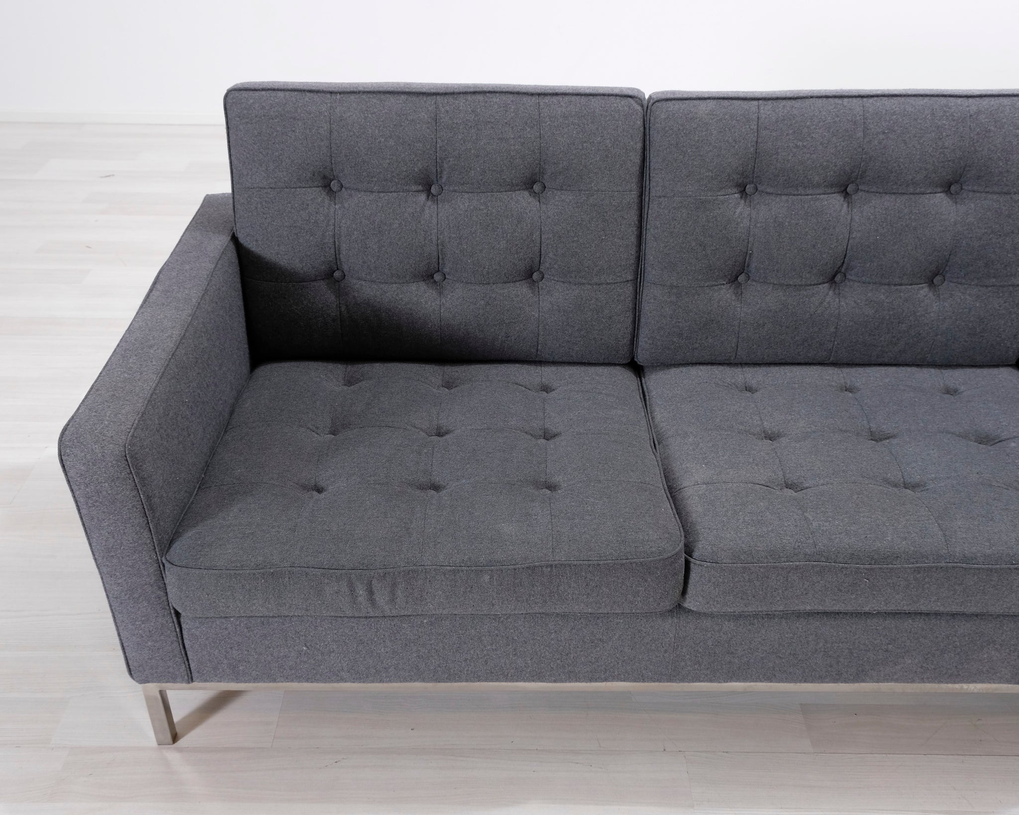 Kolmen istuttava harmaa kangassohva. Selkätyynyissä tikattu pinta.