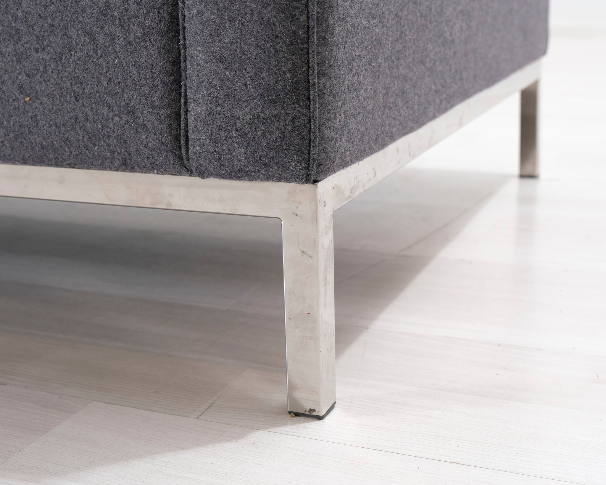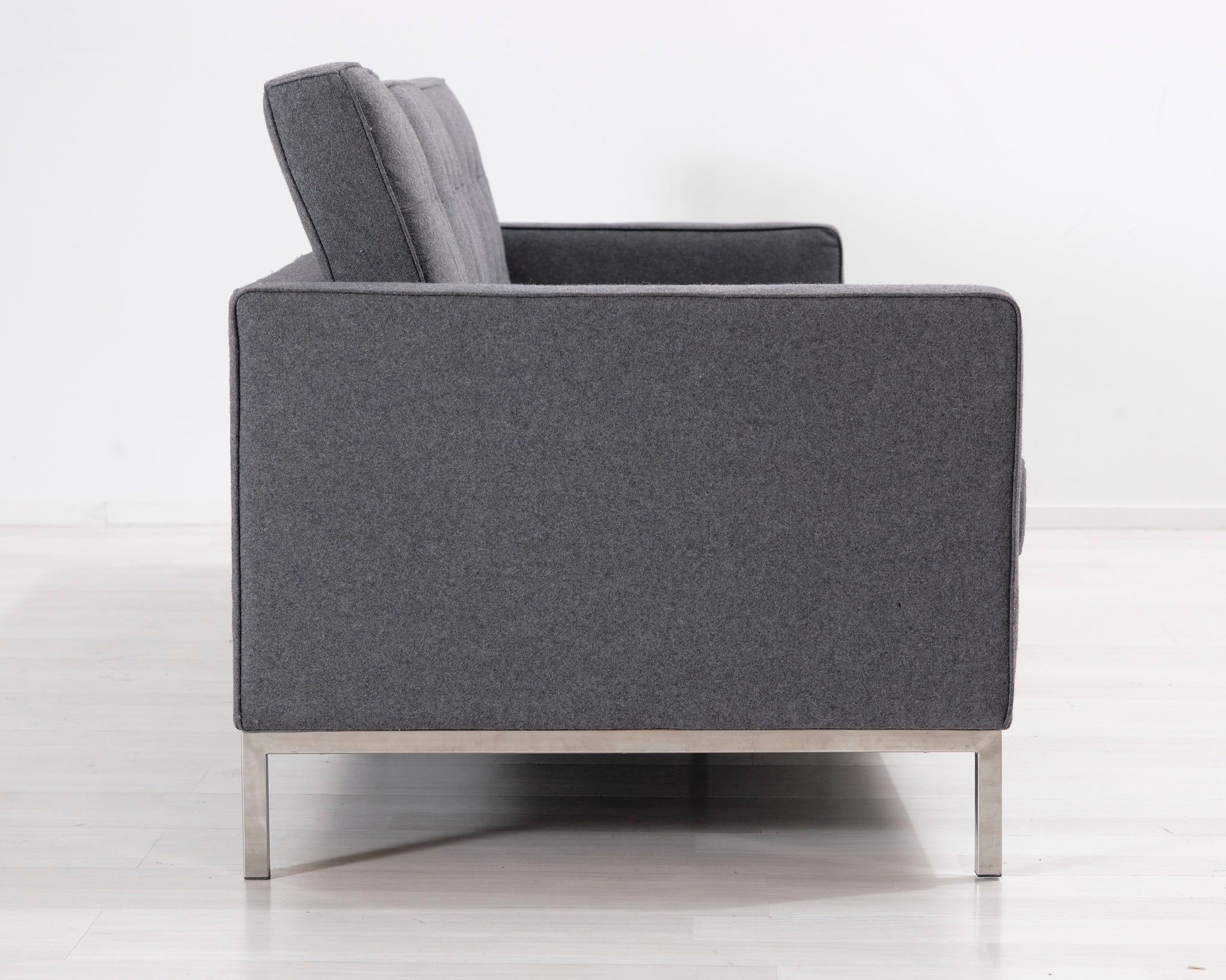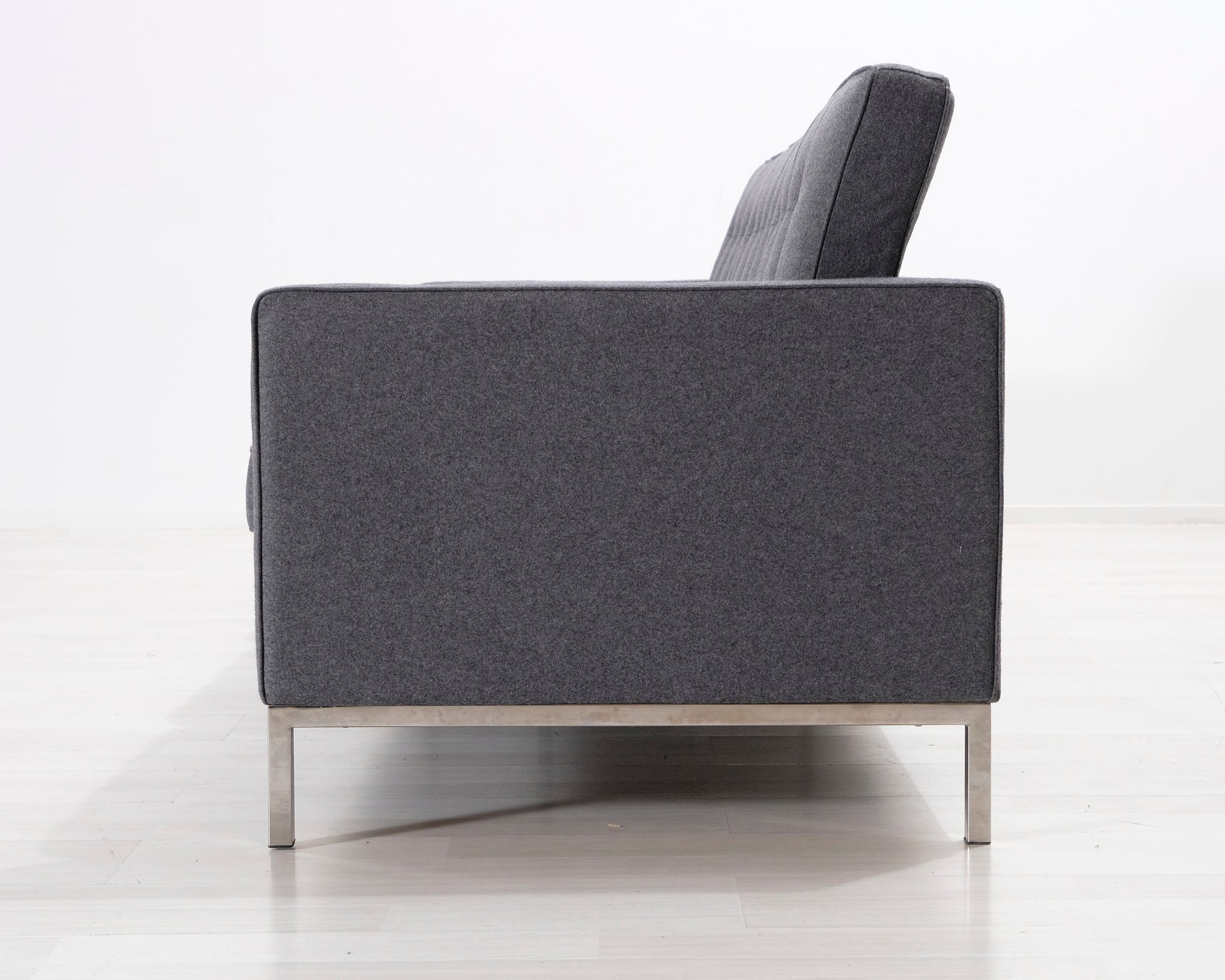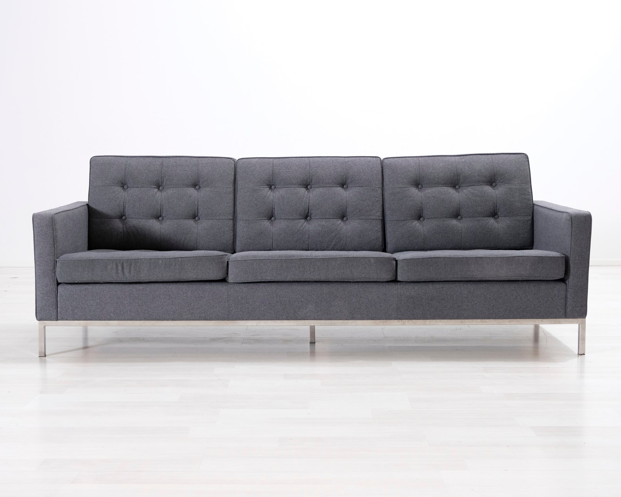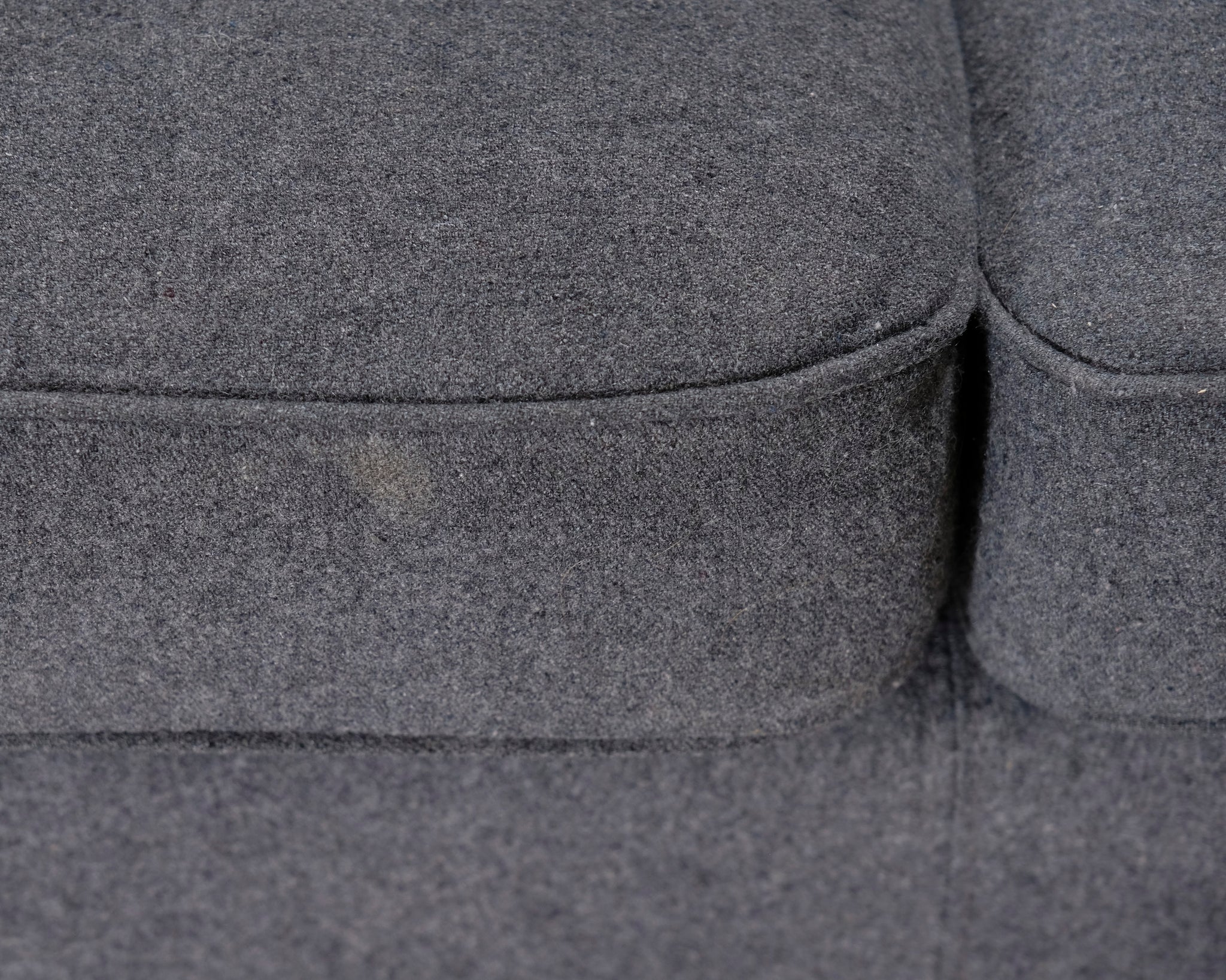 Kolmen istuttava harmaa kangassohva. Selkätyynyissä tikattu pinta.