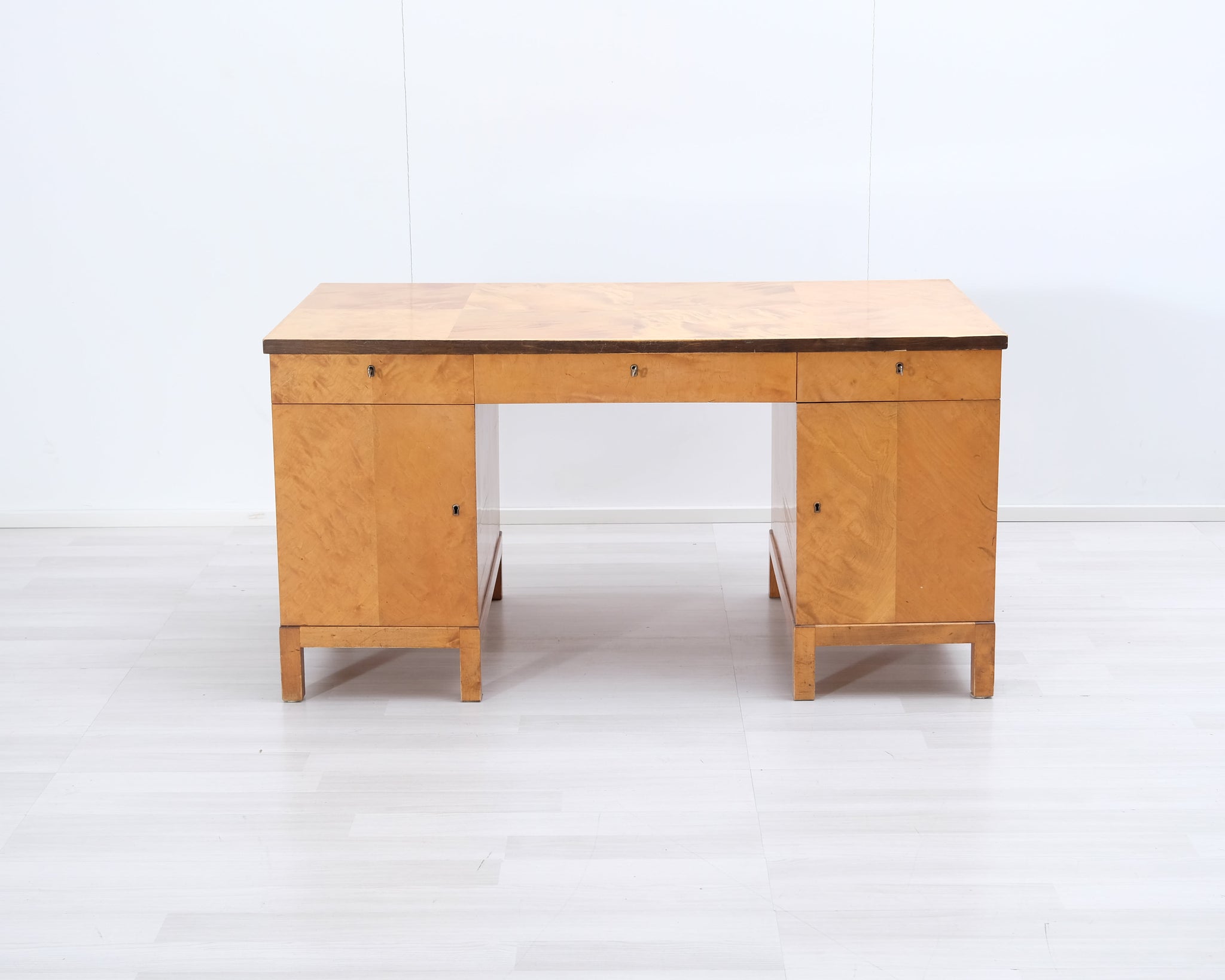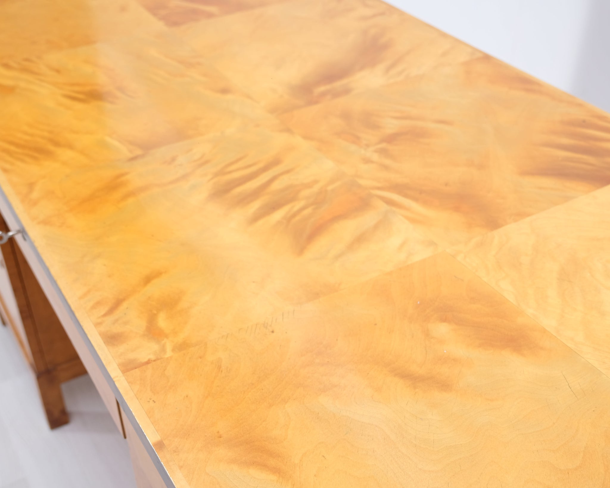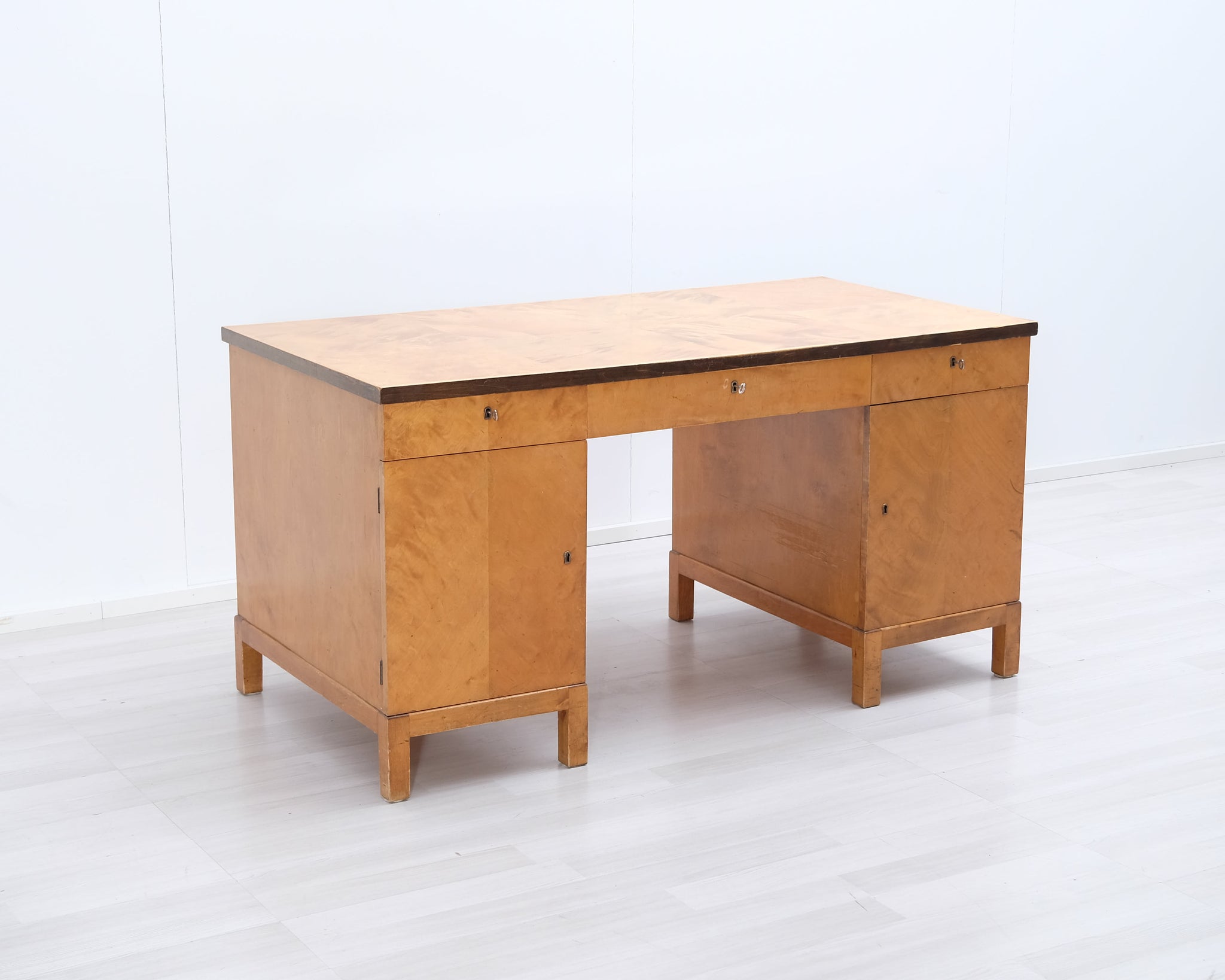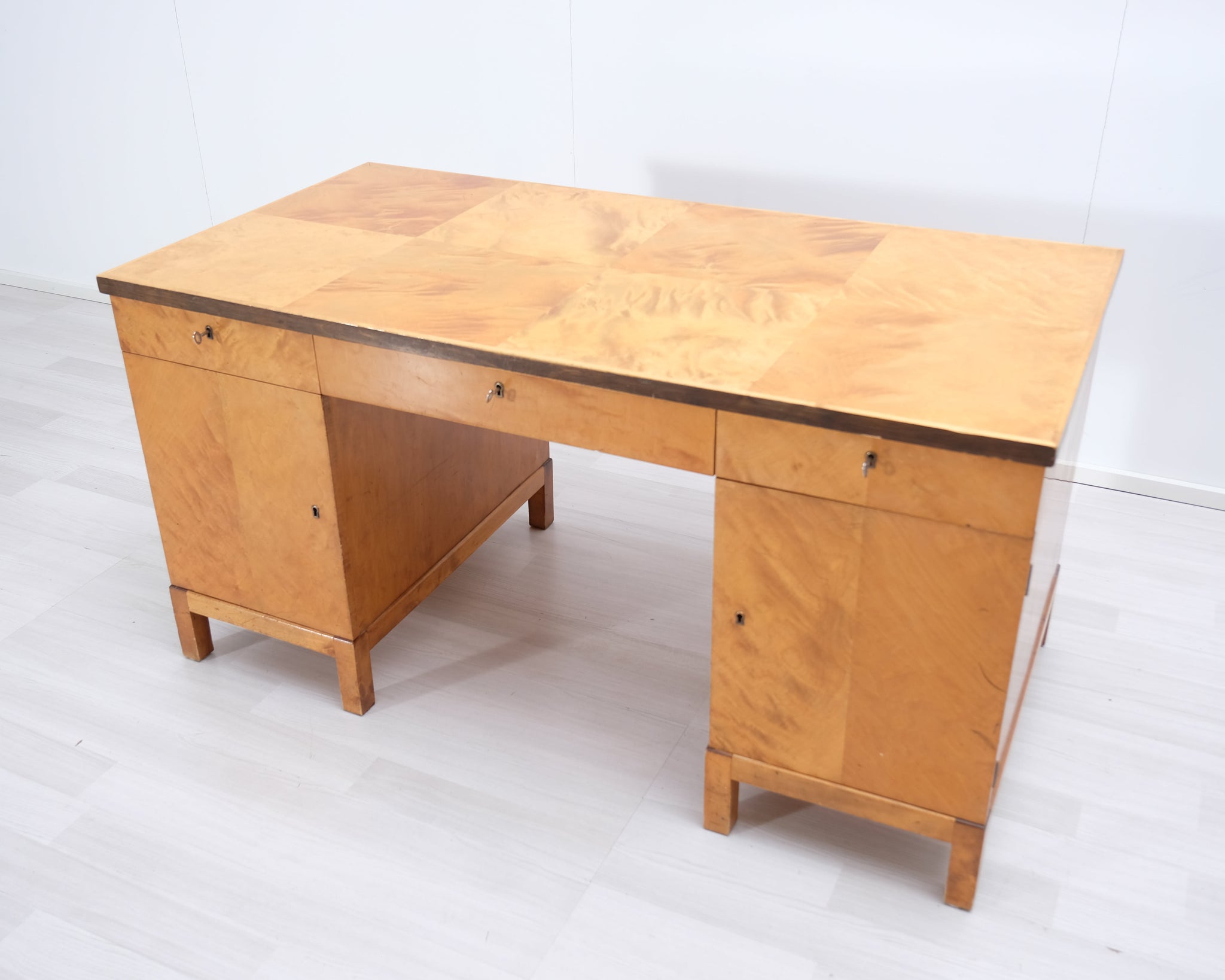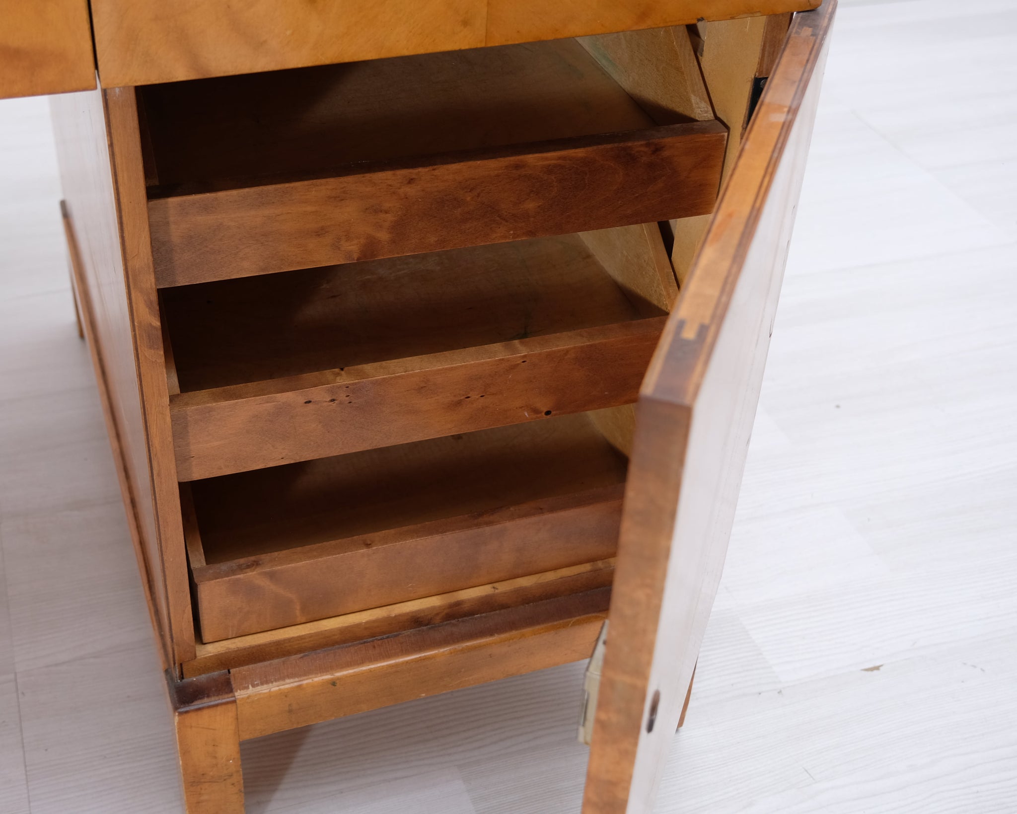 Kaunis vanha työpöytä, joka on tyylinsä perusteella arviolta 1940-50 -lukua. Materiaali massiivipuuta, visakoivua. Reilusti säilytystilaa.