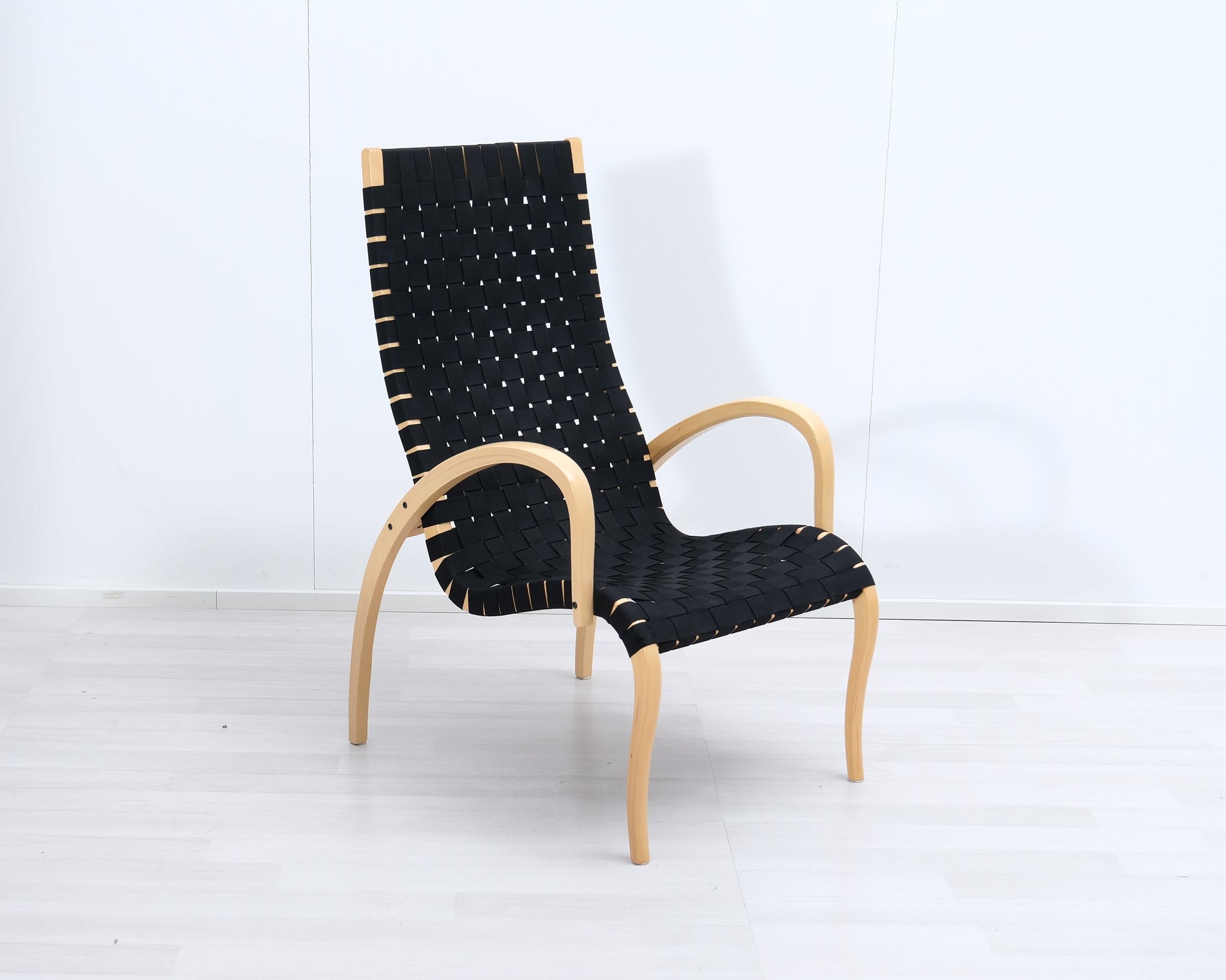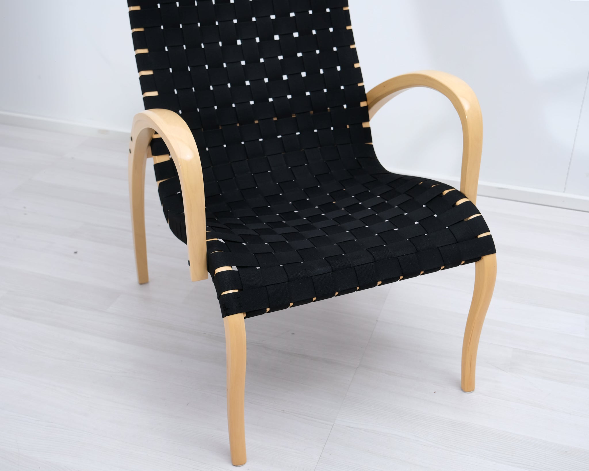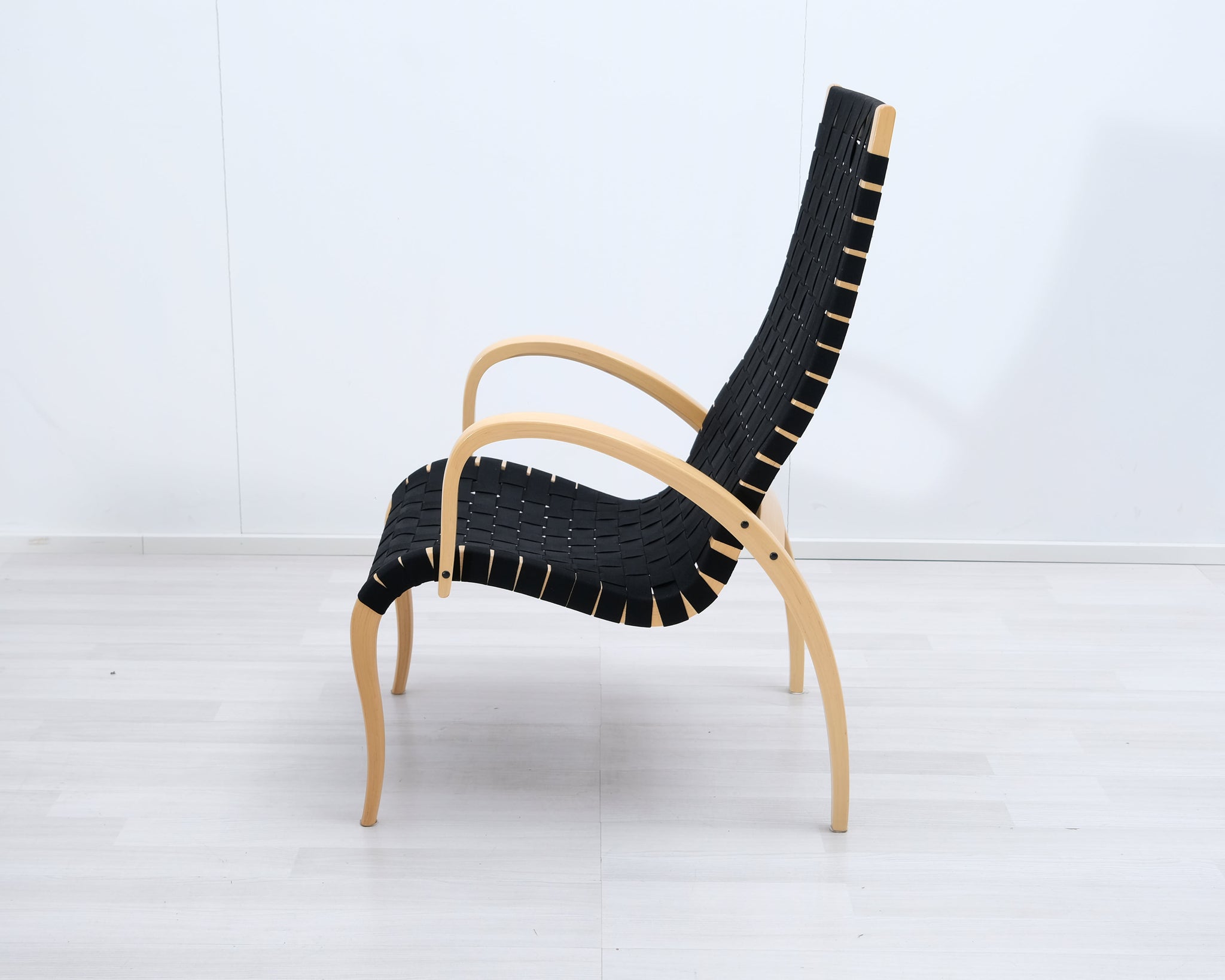 Askon valmistama Harlekiini-lepotuoli on suomalainen klassikko. Jalat ja käsinojat muotoonpuristetusta koivusta ja istuin punottu mustista satulavöistä.