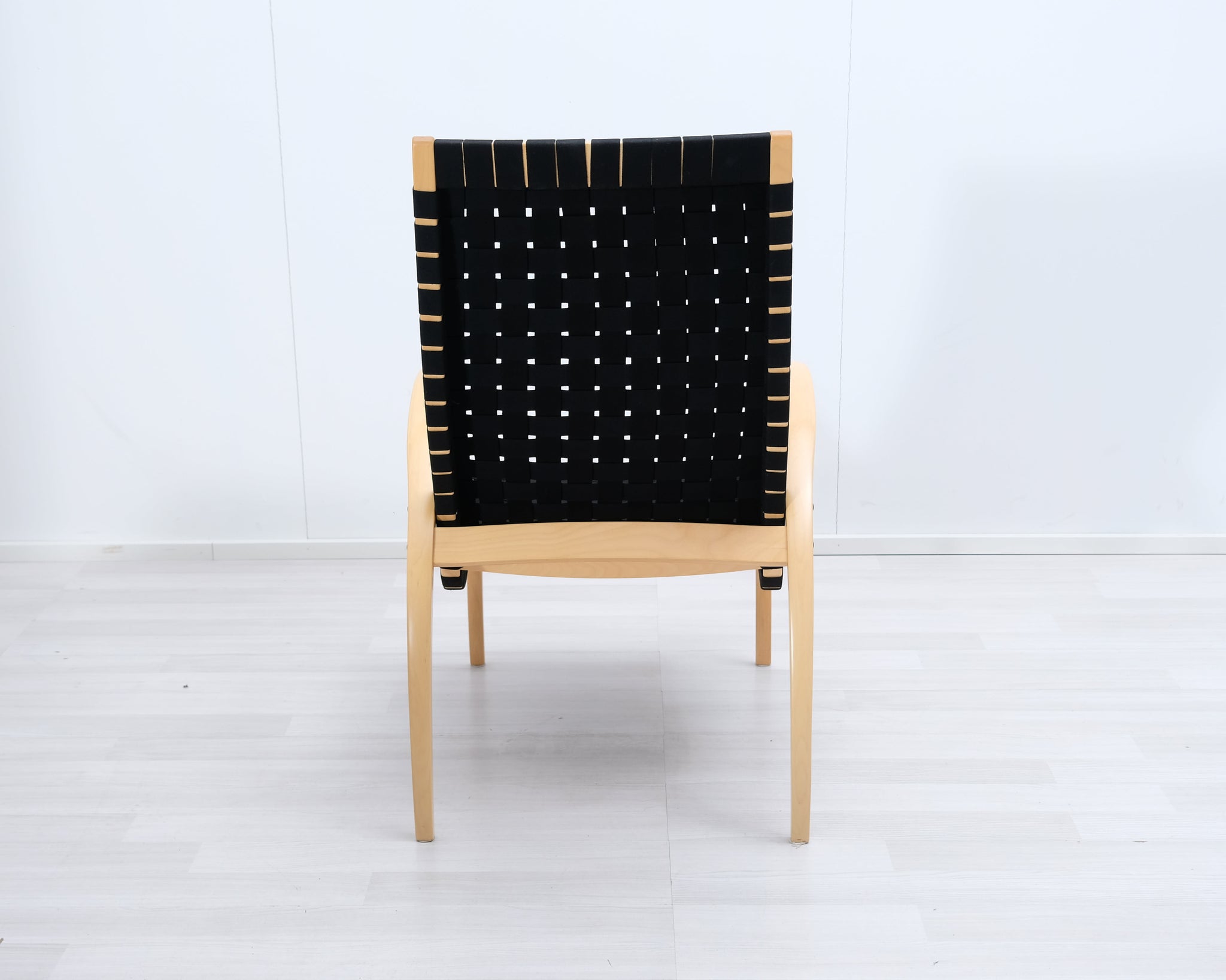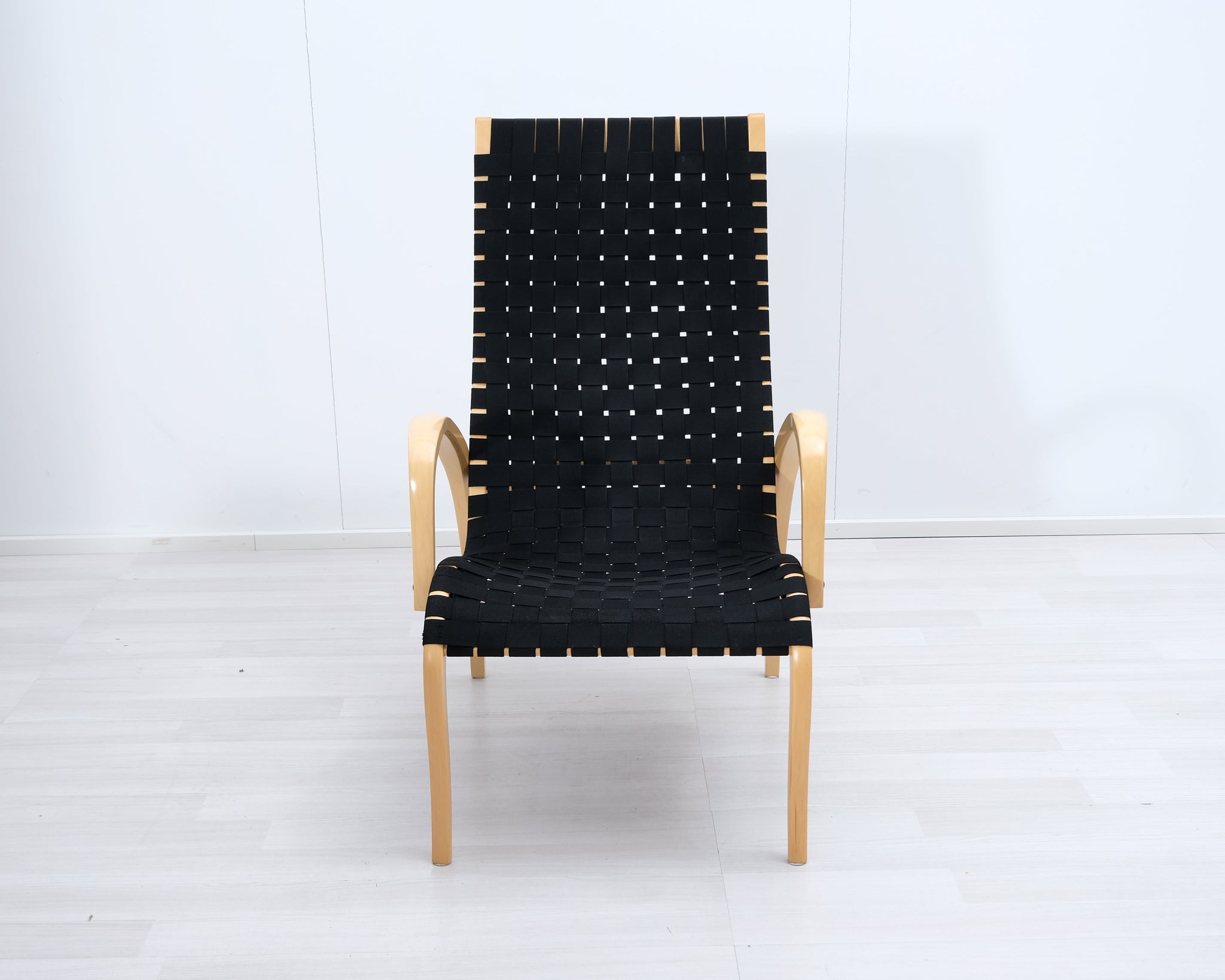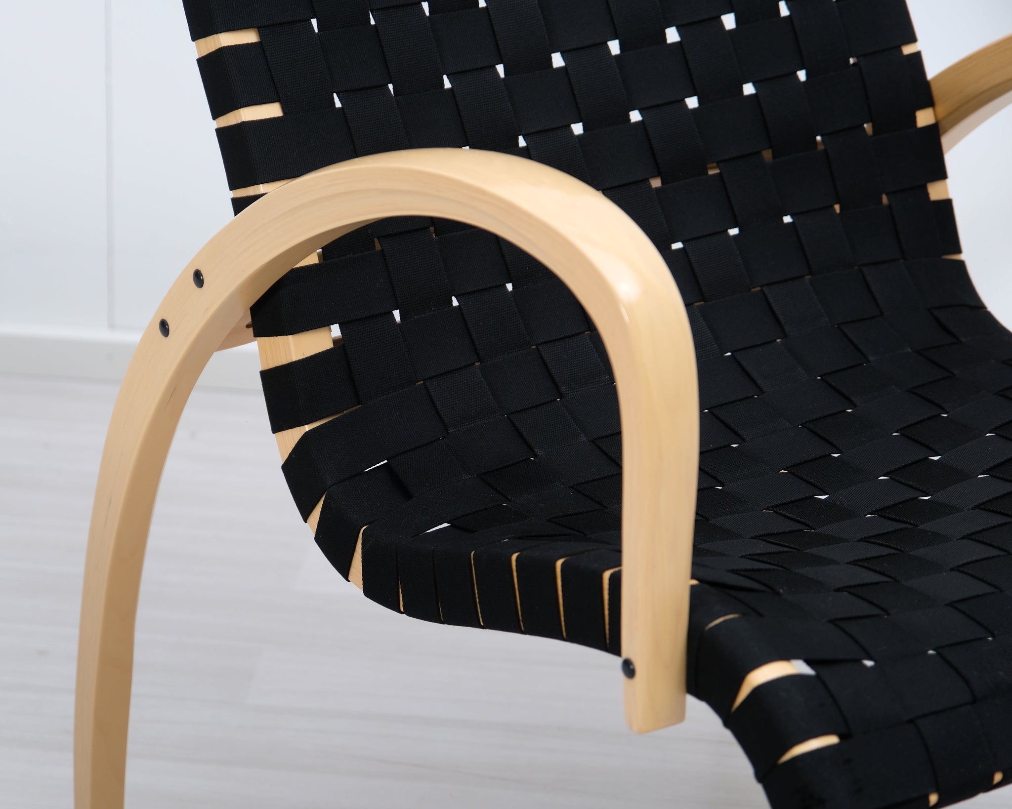 Askon valmistama Harlekiini-lepotuoli on suomalainen klassikko. Jalat ja käsinojat muotoonpuristetusta koivusta ja istuin punottu mustista satulavöistä.