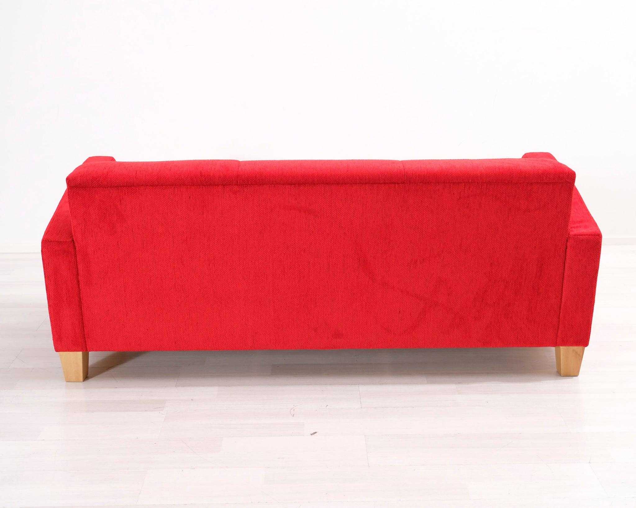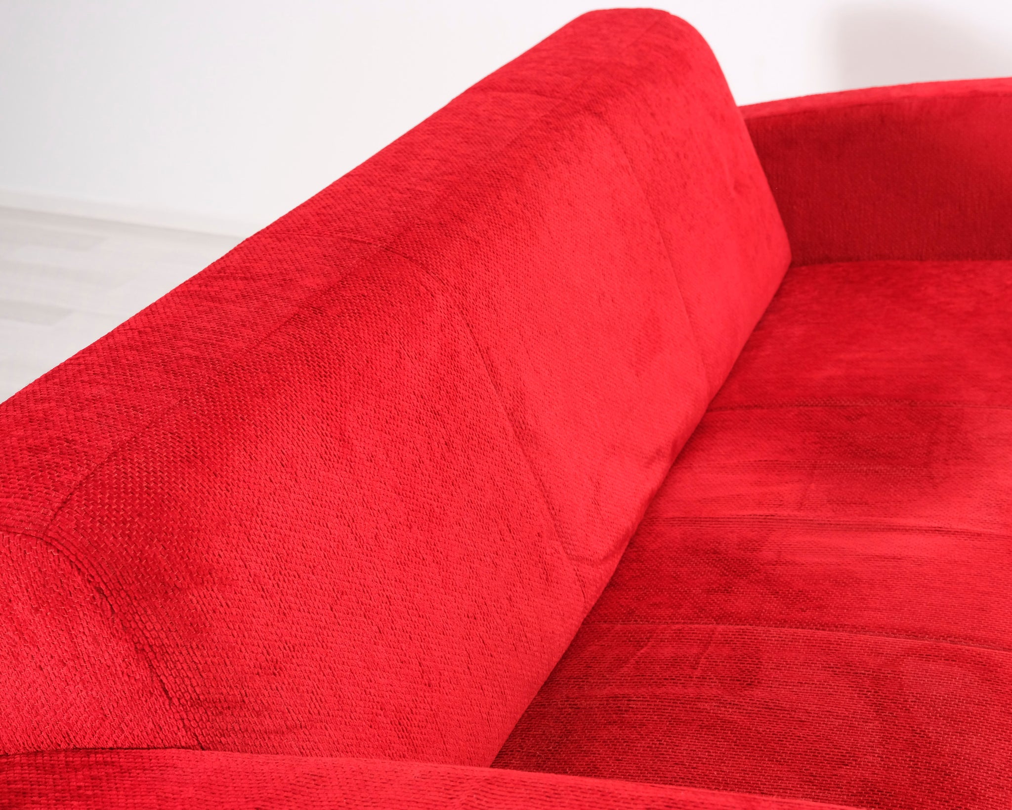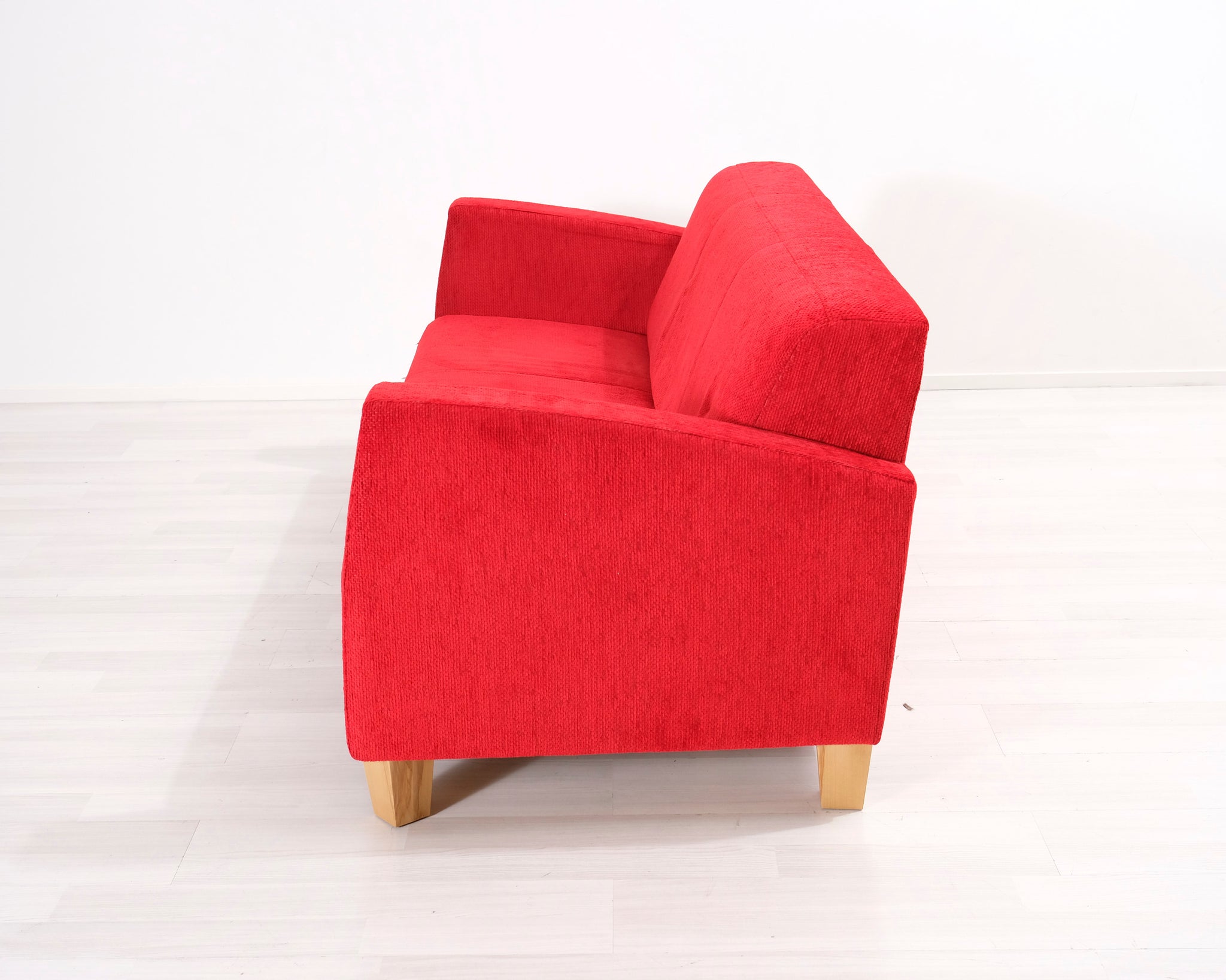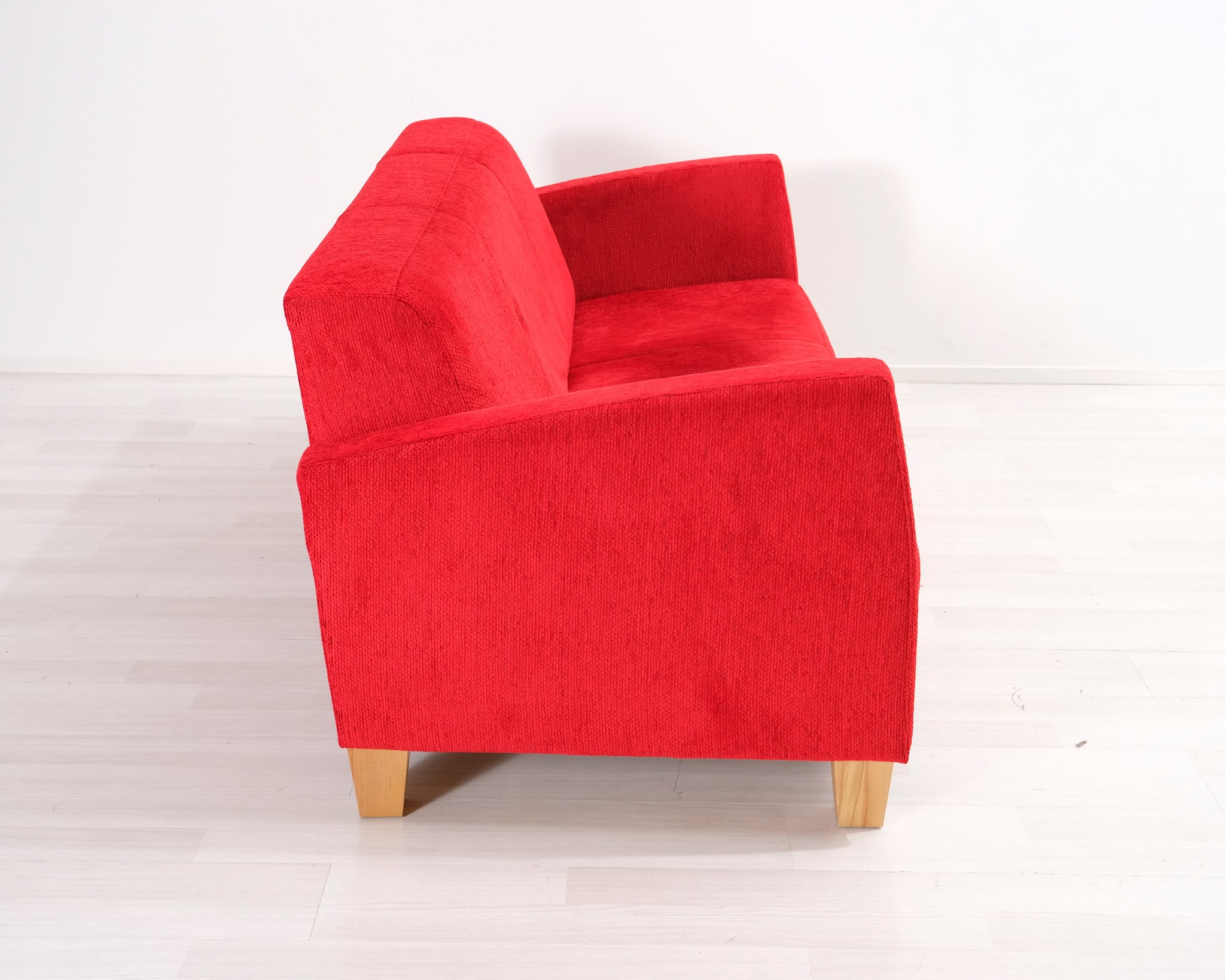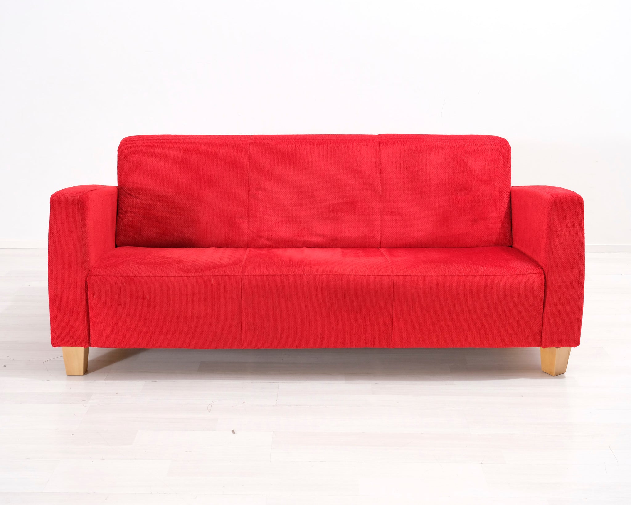 Kolmen istuttava kangassohva. Punainen verhoilu.
