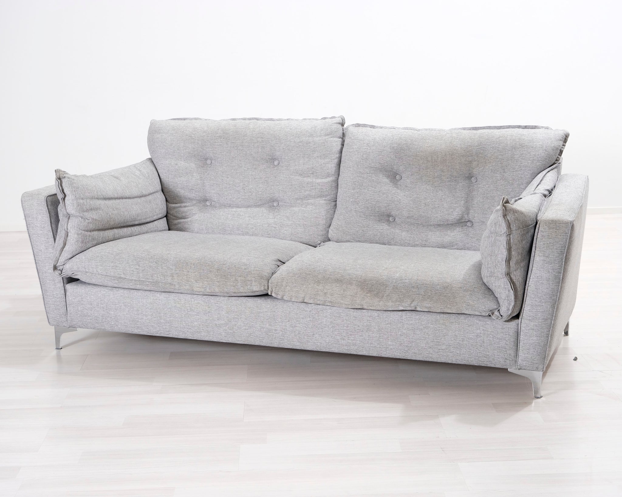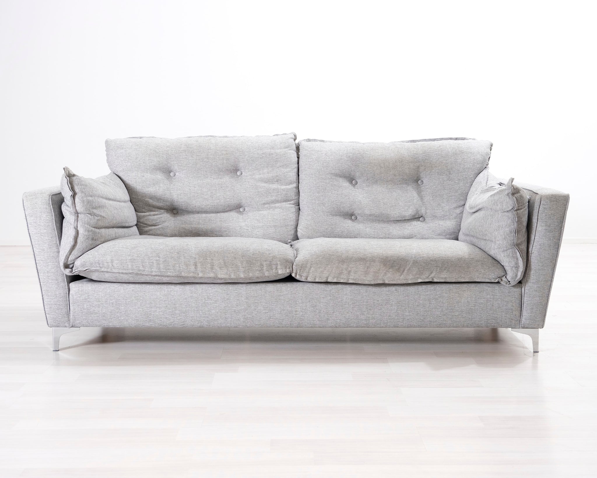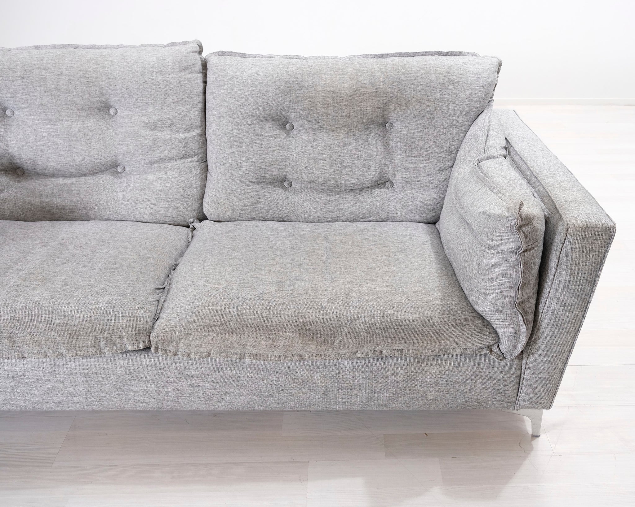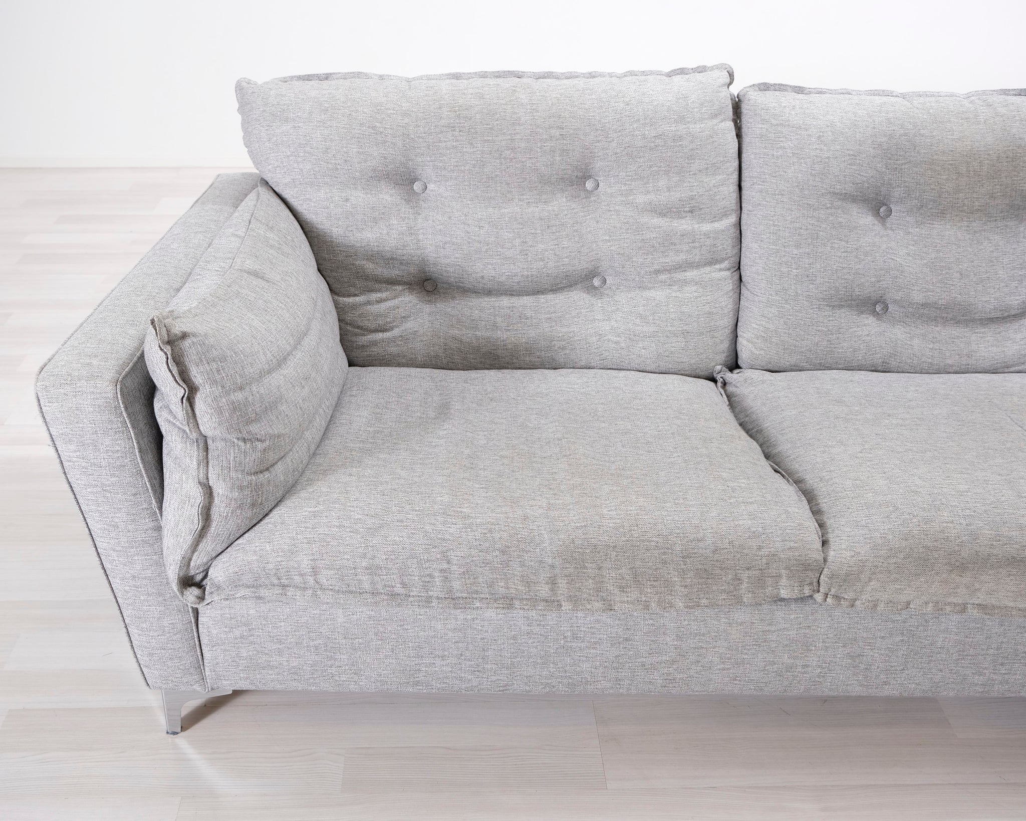 Kolmen istuttava kangassohva. Viistot käsinojat ja selkätyynyjen koristenapit antavat sohvalle persoonallisen ilmeen.