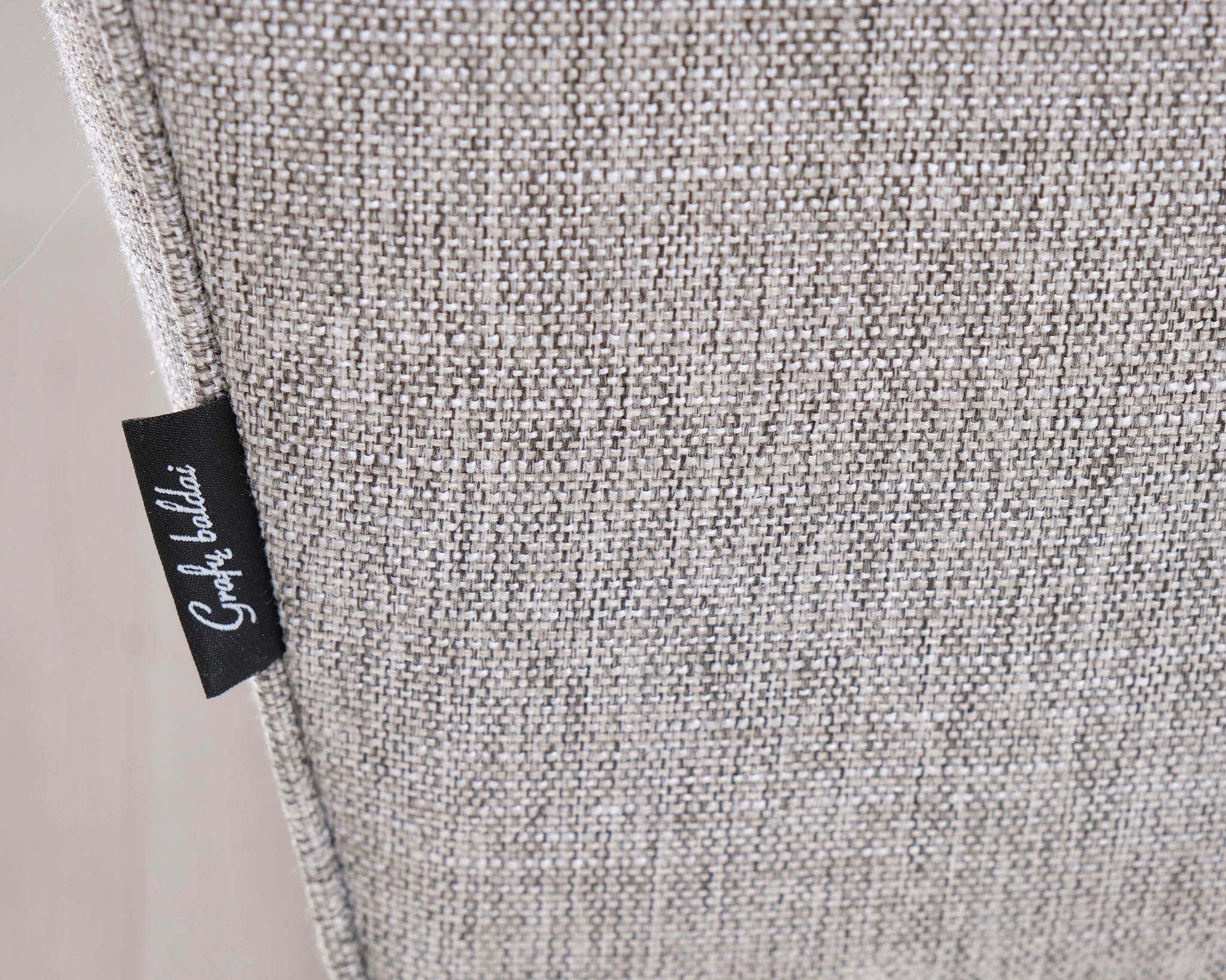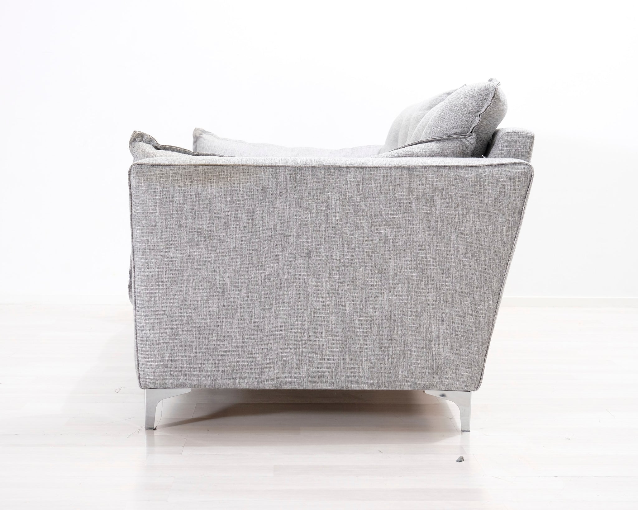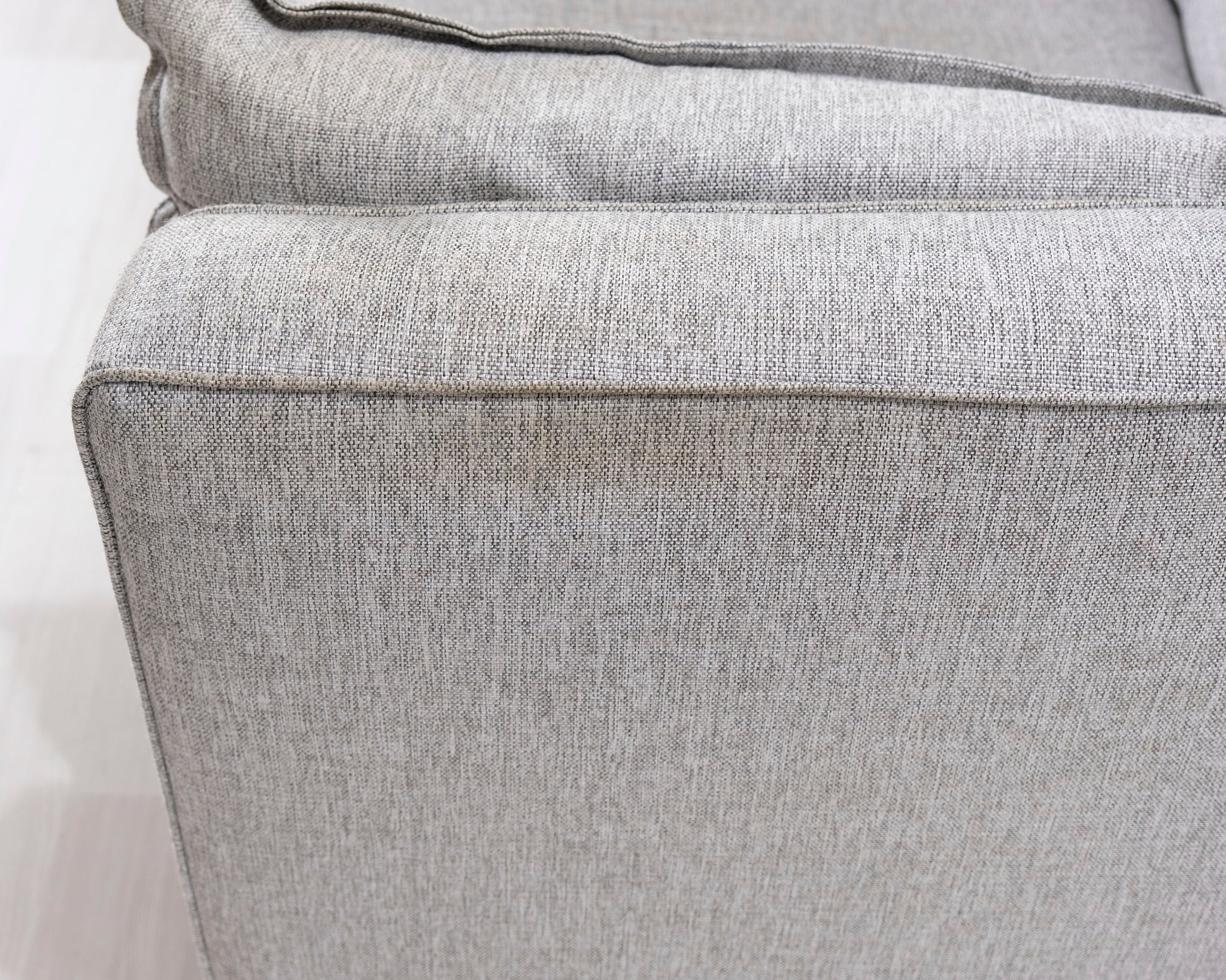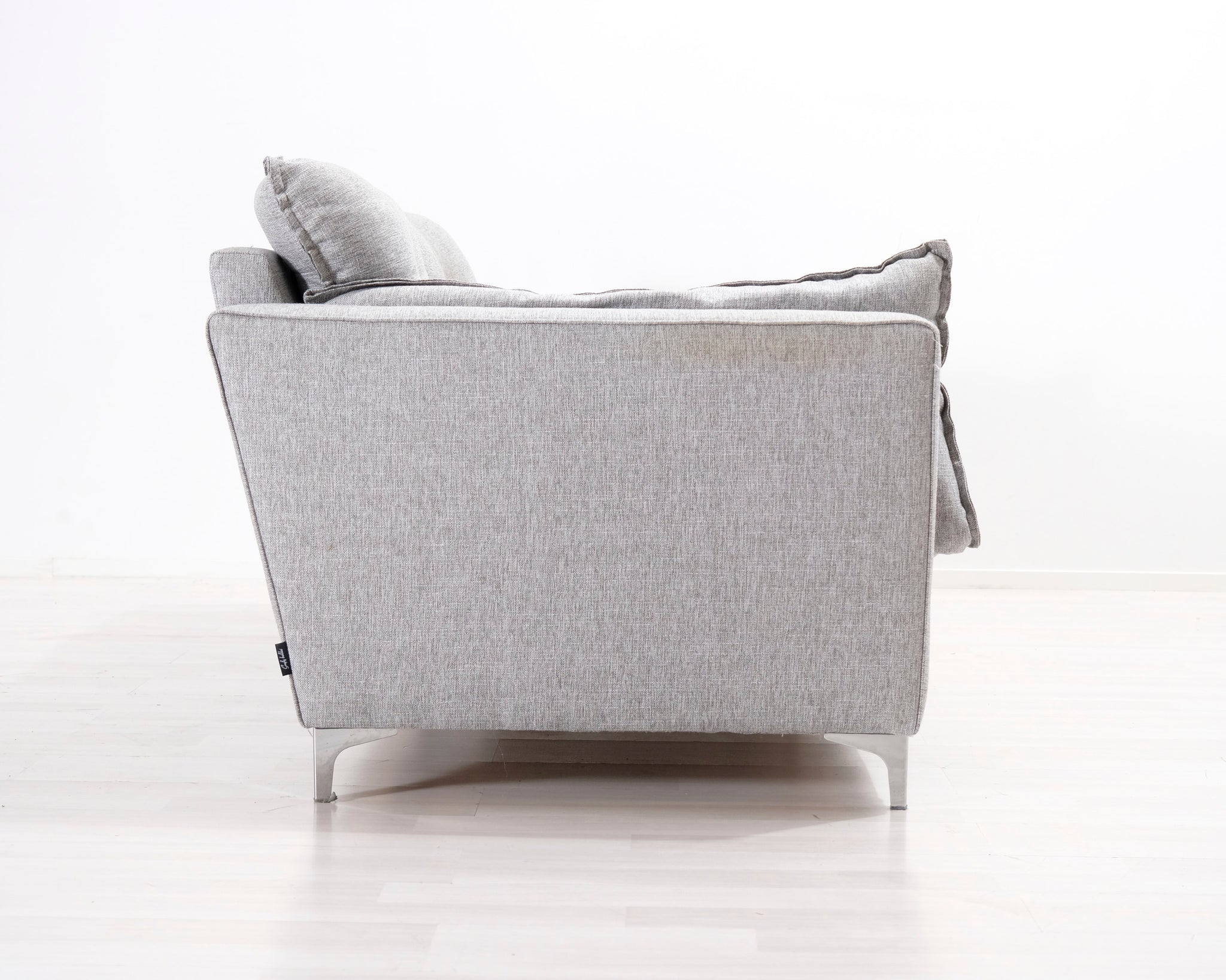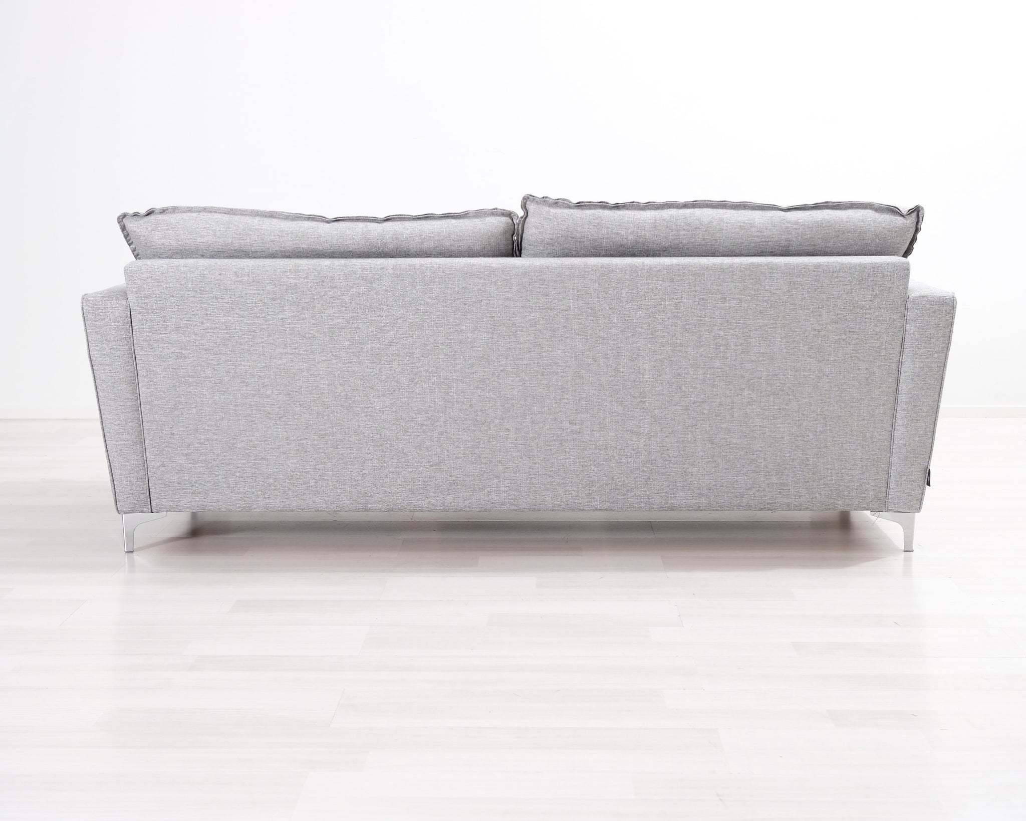 Kolmen istuttava kangassohva. Viistot käsinojat ja selkätyynyjen koristenapit antavat sohvalle persoonallisen ilmeen.