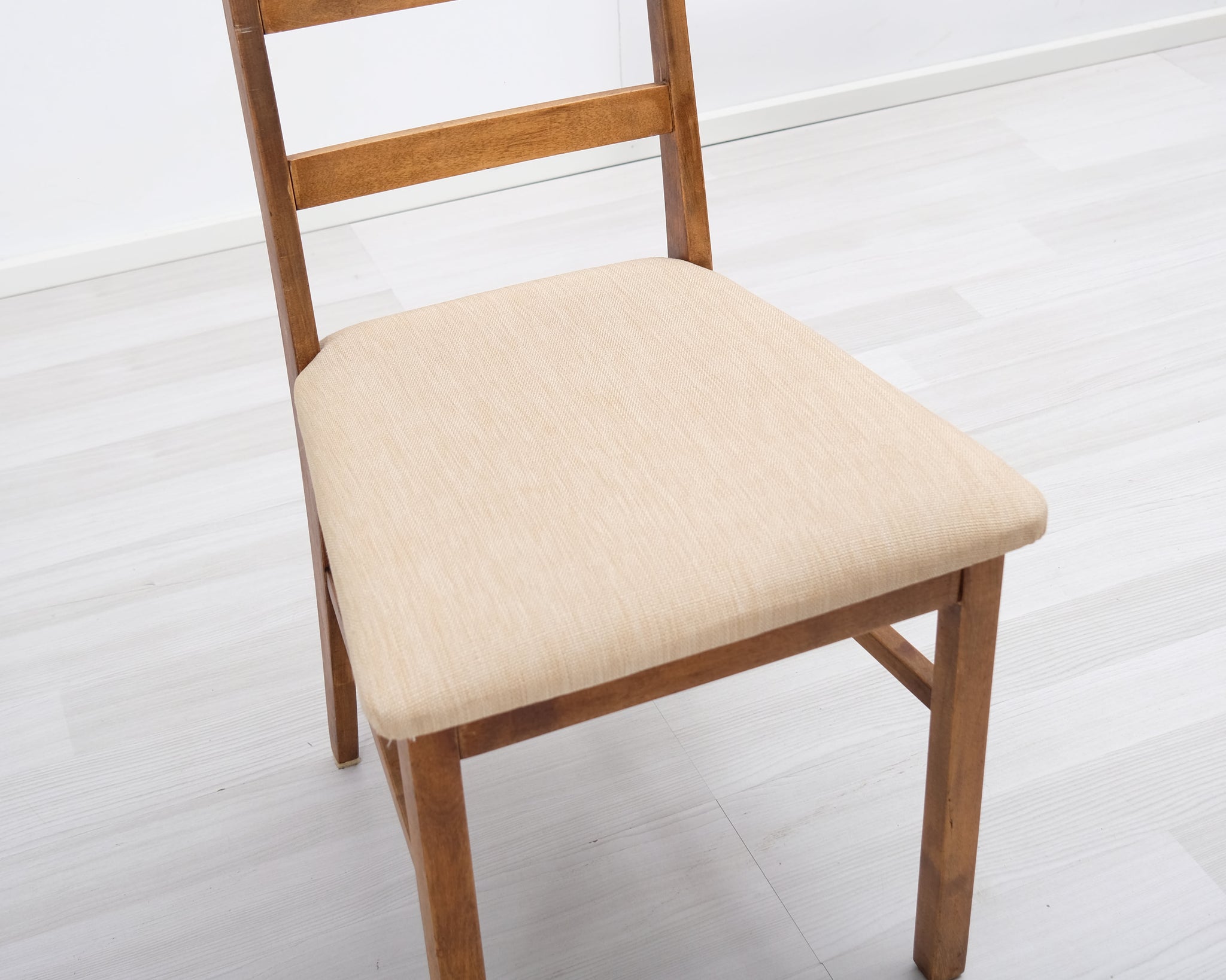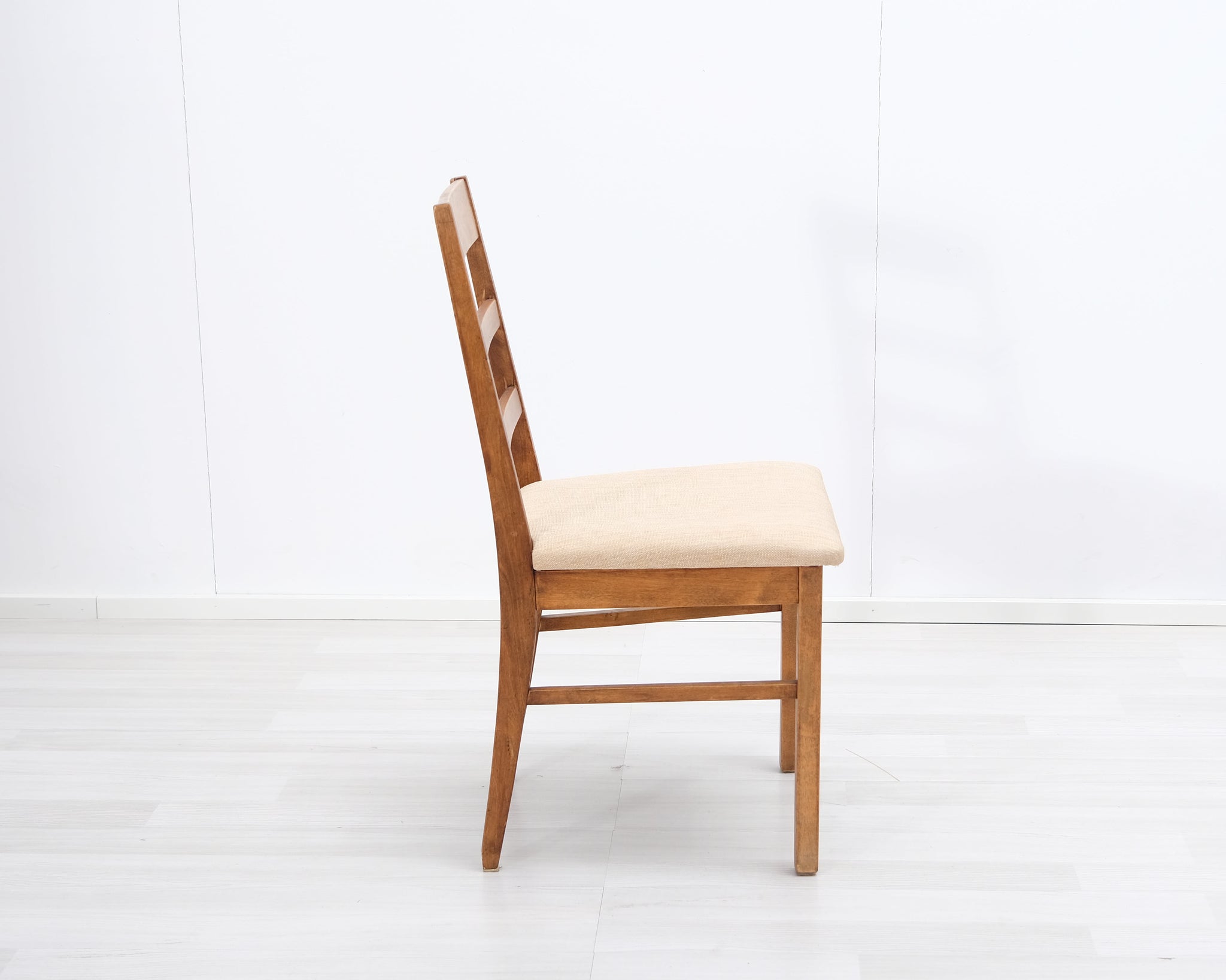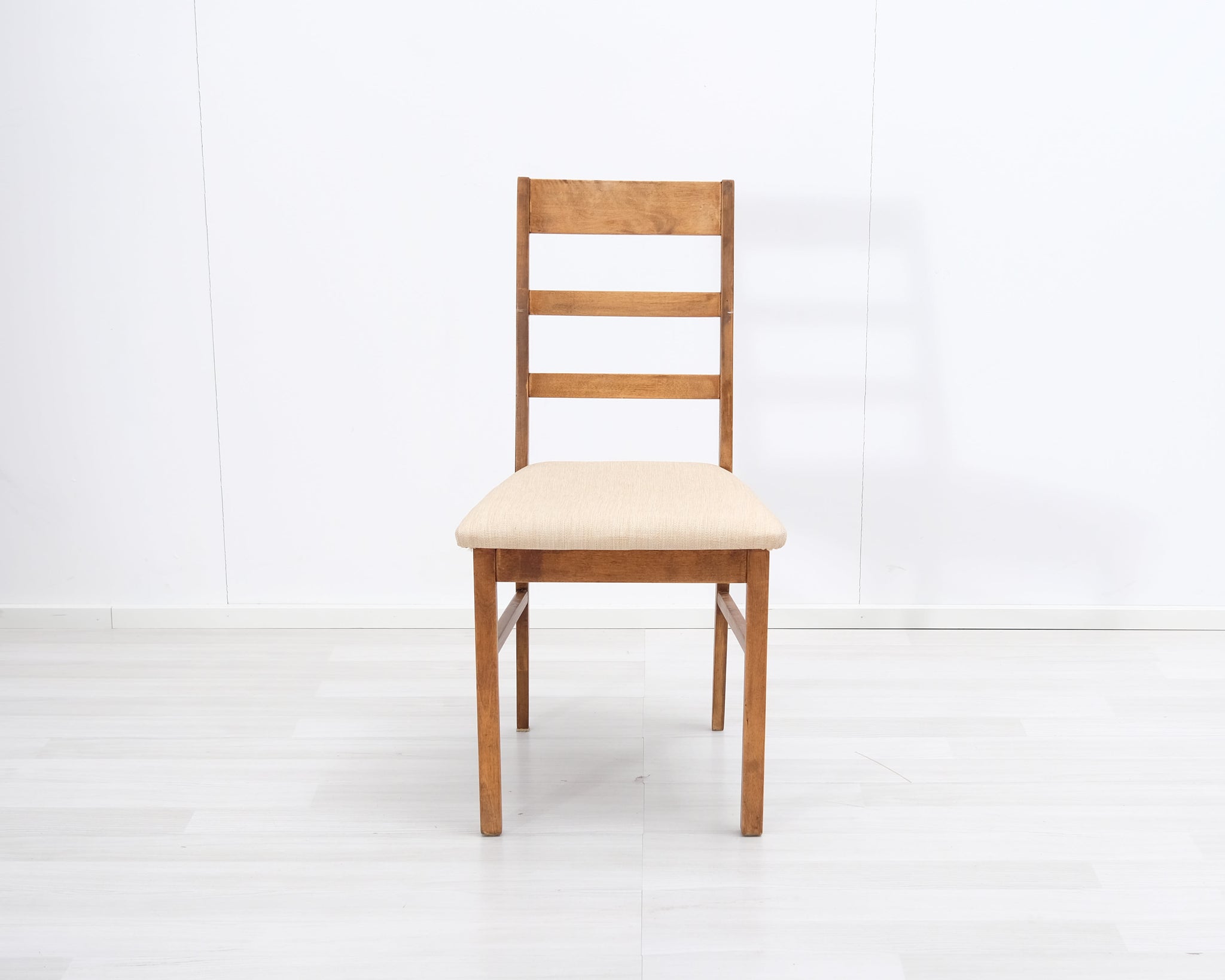 Puurunkoinen antiikkituoli beigellä kangasistuimella. Tuoli on äskettäin kunnostettu ja istuinosan verhoilu vaihdettu.