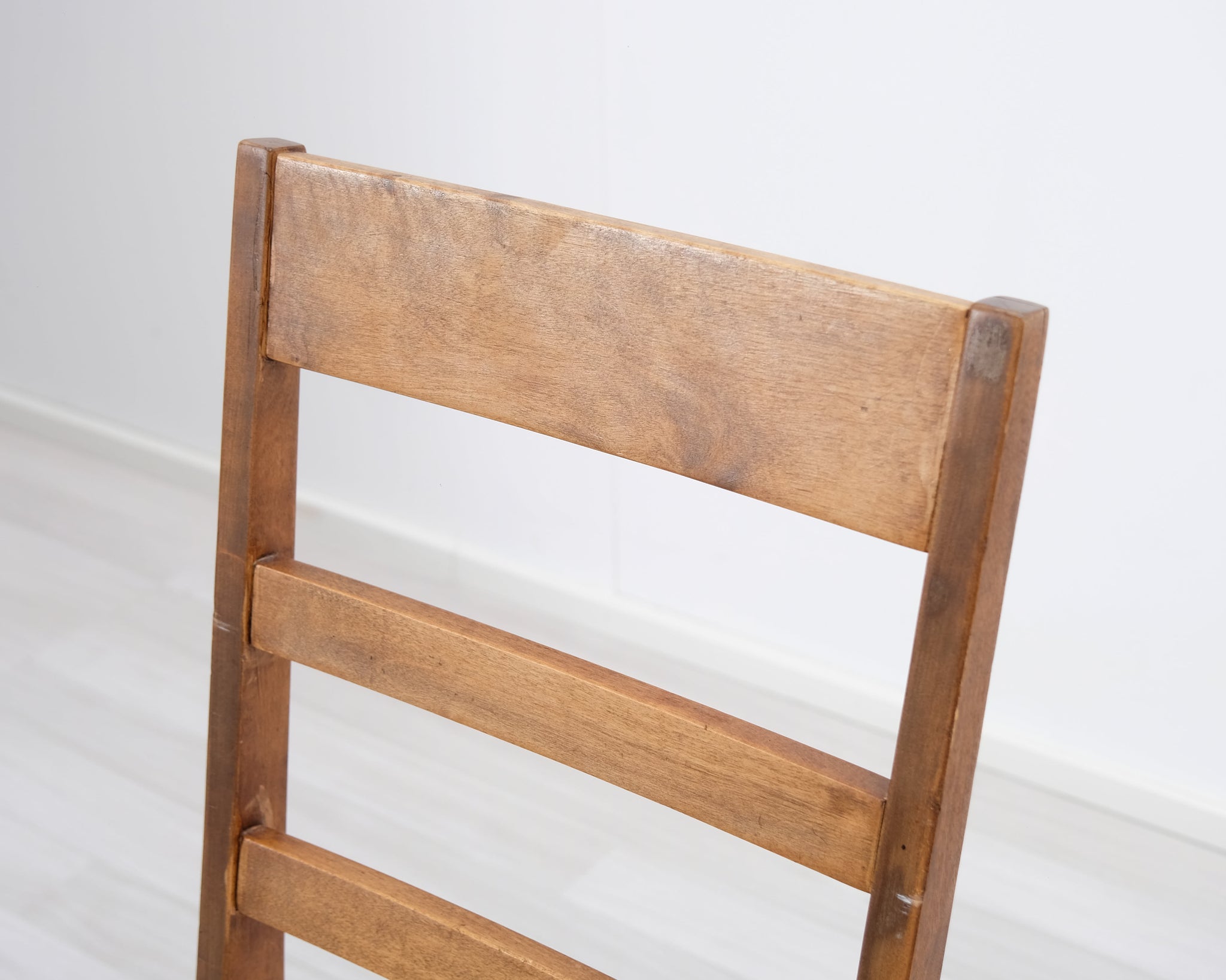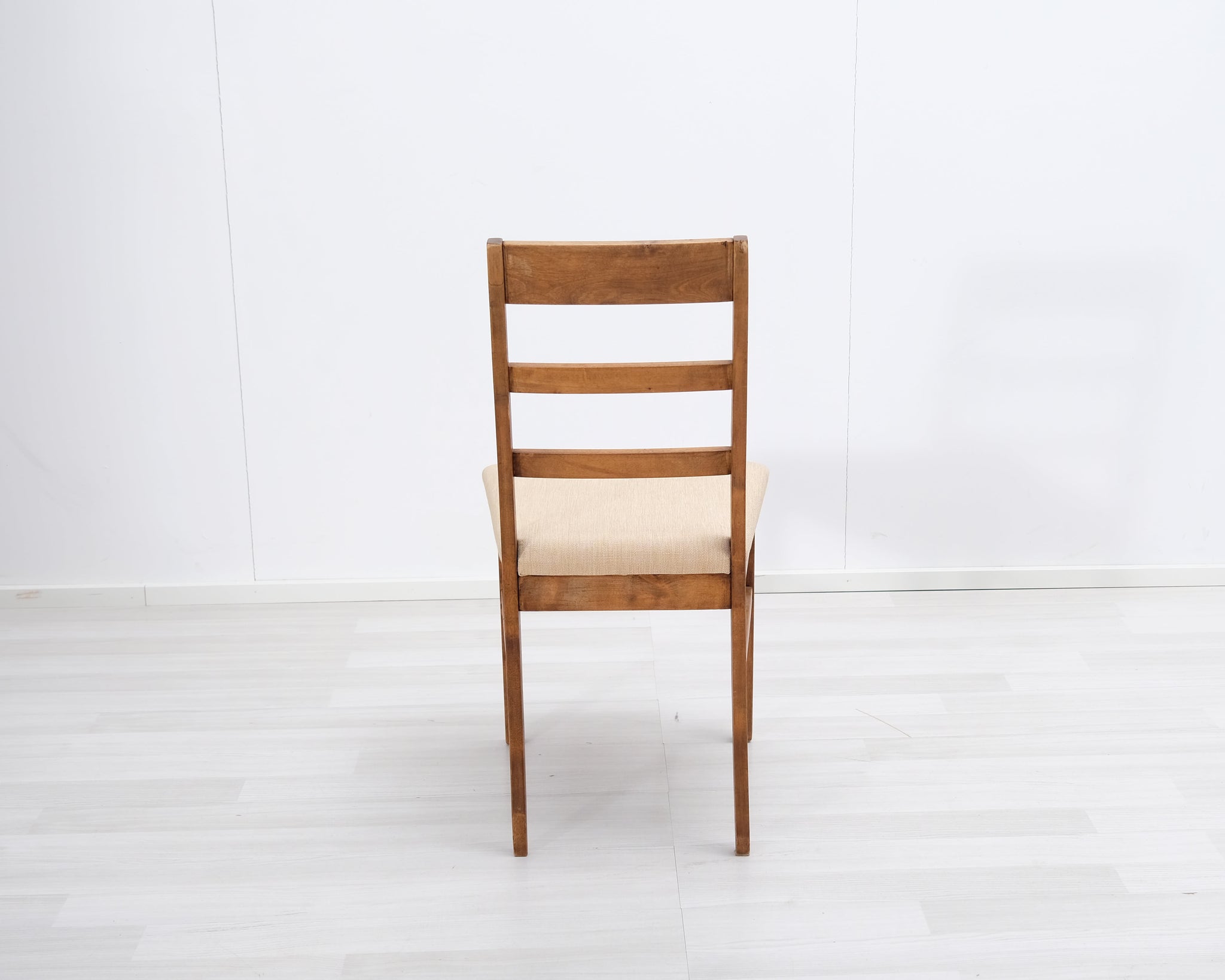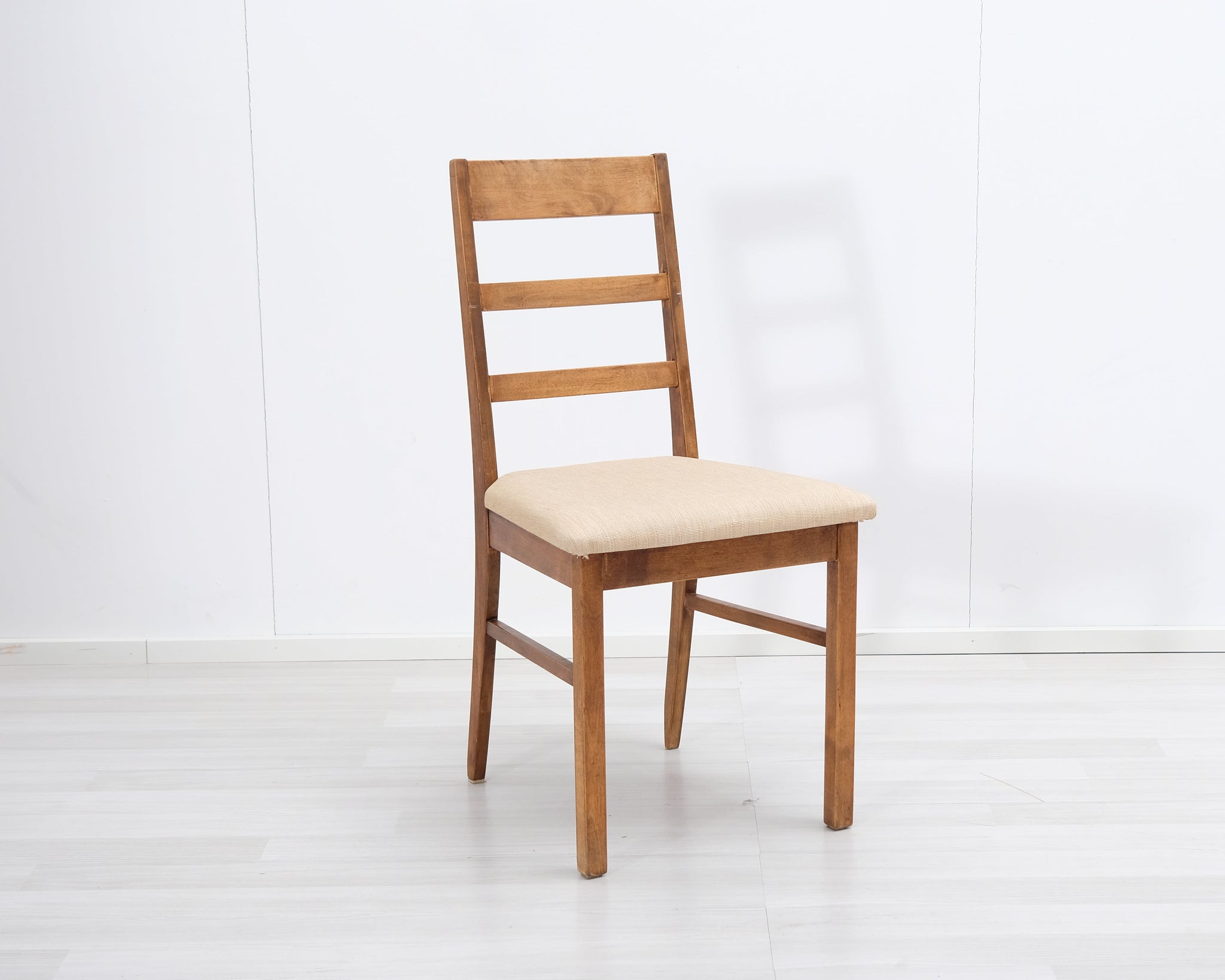 Puurunkoinen antiikkituoli beigellä kangasistuimella. Tuoli on äskettäin kunnostettu ja istuinosan verhoilu vaihdettu.